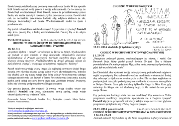Dawid swoją wielkoduszną postawą skruszył serce Saula. W ten sposób król Izraela ujrzał swój grzech i swoją nikczemność. Co to znaczy, że Dawid był wielkoduszny? Otóż Dawid, mimo że prześladowany przez Saula, nie szuka zemsty i rewanżu, tylko przebacza z serca. Dawid robi coś, co normalnie przekracza ludzkie siły, odpłaca dobrem za zło, którego doświadczył od Saula. Wielkoduszność rodzi tu życie i przebaczenie. CHODZIĆ W DUCHU ŚWIĘTYM Czy jesteś człowiekiem wielkodusznym? Czy prosisz o tę łaskę? Pomódl się: Jezu, proszę Cię o łaskę wielkoduszności. Proszę Cię o to, abym niósł życie. 25.10. 2014 sobota Dz 22,3-16 lub Dz 9,1-22; Ps 117,1-2; Mk 16,15-18 CHODZIĆ W DUCHU ŚWIĘTYM TO PODPORZĄDKOWAĆ SIĘ CAŁKOWICIE BOGU ŻYWEMU Dz 22, 3-4 „Ja jestem Żydem – mówił – urodzonym w Tarsie w Cylicji. Wychowałem się jednak w tym mieście, u stóp Gamaliela otrzymałem staranne wykształcenie w Prawie ojczystym. Gorliwie służyłem Bogu, jak wy wszyscy dzisiaj służycie. Prześladowałem tę drogę, głosując nawet za karą śmierci, wiążąc i wtrącając do więzienia mężczyzn i kobiety.” Paweł miał swoją wizję wiary i tego jak najlepiej powinien służyć Bogu Izraela. My również mamy swoją wizję wiary, chrześcijaństwa, miłości czy służby. Ale czy nasza wizja jest Bożą wizją? Potrzebujemy takiego samego nawrócenia jak Szaweł z Tarsu. Potrzebujemy skruszenia naszej pychy, czyli takiej postawy, która czyni nas „pępkiem świata”. Postawy, która nie chce się podporządkować Bogu żywemu. Czy prosisz Jezusa, aby objawił Ci swoją wizję służby, wiary czy miłości? Pomódl się: Jezu, zdemaskuj moją pychę, moje wizje chrześcijaństwa czy służenia Tobie. Opracowała: Jolanta Prokopiuk, korekta: Jerzy Prokopiuk, rysunek: Marta Stańco, złożenie: Mariusz Stańco. Teksty do medytacji znajdują się na stronie: www.strachocin.archidiecezja.wroc.pl. Istnieje możliwość codziennego otrzymywania Słowa Bożego (liturgia na każdy dzień) wraz z rozważaniami poprzez pocztę elektroniczną; wystarczy przesłać swój adres e-mail ze stosowną prośbą (zakładka Kontakt na www.gajkow.archidiecezja.wroc.pl) 19.01. 2014 niedziela (2 tydzień zwykły) Iz 49,3-6; Ps 40,2-10 1 Kor 1,1-3; J 1,29-34 CHODZIĆ W DUCHU ŚWIĘTYM TO WYJŚĆ NA PUSTYNIĘ J 1, 29-30 „Nazajutrz zobaczył Jezusa, nadchodzącego ku niemu, i rzekł: Oto Baranek Boży, który gładzi grzech świata. To jest Ten, o którym powiedziałem: Po mnie przyjdzie Mąż, który mnie przewyższył godnością, gdyż był wcześniej ode mnie.” Jan Chrzciciel, aby wykonać swoją misję życiową, potrzebował najpierw wyjść na pustynię. Potrzebował trwać na modlitwie w obecności Bożej, aby zobaczyć co i jak ma w swoim życiu zrobić. Dla nas tym wyjściem na pustynię jest czas, jaki poświęcamy na spotkanie z Jezusem, szczególnie w Bożym Słowie. Czas, gdy jesteśmy tylko dla Niego i z Nim. Czas, gdy mówimy do Niego, ale też słuchamy tego, co On mówi do nas przez swoje Słowo. Czy poświęcasz każdego dnia czas na modlitwę? Czy wzrasta w Tobie pragnienie modlitwy, pragnienie spotykania się z Bogiem żywym? Pomódl się: Jezu, przymnóż mi wiary. Wlej w moje serce coraz głębsze pragnienie spotykania się z Tobą, Bogiem żywym. 20.01. 2014 poniedziałek 1 Sm 15,16-23; Ps 50,8-23; Mk 2,18-22 CHODZIĆ W DUCHU ŚWIĘTYM TO WZRASTAĆ W POSŁUSZEŃSTWIE 1 Sm 15, 22-23 „Samuel odrzekł: Czyż milsze są dla Pana całopalenia i ofiary krwawe od posłuszeństwa głosowi Pana? Właśnie, lepsze jest posłuszeństwo od ofiary, uległość – od tłuszczu baranów. Bo opór jest jak grzech wróżbiarstwa, a krnąbrność jak złość bałwochwalstwa. Ponieważ wzgardziłeś nakazem Pana, odrzucił cię On jako króla.” zakrzywionym nożem, ja zaś idę na ciebie w imię Pana Zastępów, Boga wojsk izraelskich, którym urągałeś. . Dziś właśnie odda cię Pan w moją rękę, pokonam cię i utnę ci głowę. Niech się przekona cały świat, że Bóg jest w Izraelu.” Żyjemy w kulturze śmierci, kulturze nieposłuszeństwa. Dzisiejszy człowiek to indywidualista, najczęściej słucha tylko sam siebie i chce być wyrocznią we wszelkich sprawach. Natomiast chrześcijanin ma być podobny do Jezusa, a Jezus był całkowicie posłuszny swojemu Ojcu. Autor Listu do Hebrajczyków pisze: A chociaż był Synem, nauczył się posłuszeństwa przez to, co wycierpiał. (Hbr 5, 5,8) Prośmy o łaskę posłuszeństwa Bogu żywemu w naszym życiu. Jeśli ulokowałeś swoje powodzenie jedynie w swoim rozumie, to obrałeś niewłaściwą ścieżkę. Rozum jest pięknym darem od Boga, ale człowiek jest czymś więcej. Dawid zachował się nieracjonalnie, a zwyciężył swojego przeciwnika. Jego zwycięstwo związane było z ufnością w moc i działanie Boga żywego. Czy słyszysz głos Boży w swoim życiu? Czy jesteś człowiekiem posłuszeństwa temu głosowi? Pomódl się: Jezu, proszę Cię o ducha posłuszeństwa. Proszę Cię, abym mógł być do Ciebie podobny. 21.01. 2014 wtorek 1 Sm 16,1-13; Ps 89,20-28; Mk 2,23-28 CHODZIĆ W DUCHU ŚWIĘTYM TO NAUCZYĆ SIĘ SPOGLĄDAĆ OCZAMI SERCA 1Sm 16, 7 „Nie zważaj ani na jego wygląd, ani na wysoki wzrost, gdyż nie wybrałem go, nie tak bowiem człowiek widzi jak widzi Bóg, bo człowiek patrzy na to, co widoczne dla oczu, Pan natomiast patrzy na serce.” Serce człowieka widać przez jego uczynki. Z serca ludzkiego rodzą się wszelkie uczynki. Możemy mówić piękne słowa, które prędzej czy później weryfikowane są przez nasze uczynki. Prośmy Boga żywego, aby uczył nas spoglądania na siebie i innych oczami serca. Patrzenie oczami serca to dostrzeganie tego wszystkiego, czego nie jest w stanie uchwycić sam rozum i nasze fizyczne oczy. Czy potrafisz spoglądać na siebie i innych oczami serca? Czy potrafisz wsłuchiwać się w innych? Pomódl się: Jezu, pozwól mi spogląda