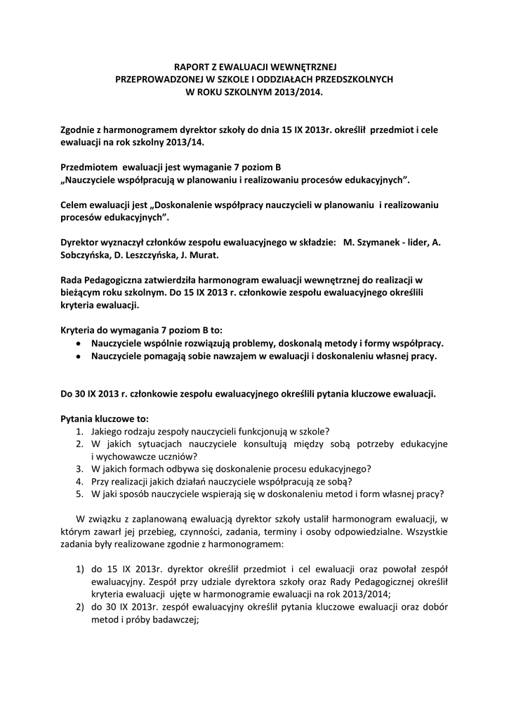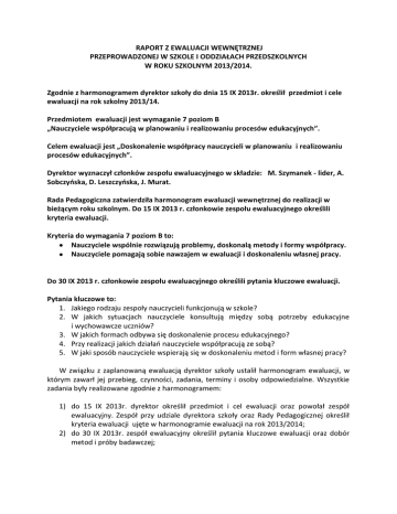 RAPORT Z EWALUACJI WEWNĘTRZNEJ PRZEPROWADZONEJ W SZKOLE I ODDZIAŁACH PRZEDSZKOLNYCH W ROKU SZKOLNYM 2013/2014. Zgodnie z harmonogramem dyrektor szkoły do dnia 15 IX 2013r. określił przedmiot i cele ewaluacji na rok szkolny 2013/14. Przedmiotem ewaluacji jest wymaganie 7 poziom B „Nauczyciele współpracują w planowaniu i realizowaniu procesów edukacyjnych”. Celem ewaluacji jest „Doskonalenie współpracy nauczycieli w planowaniu i realizowaniu procesów edukacyjnych”. Dyrektor wyznaczył członków zespołu ewaluacyjnego w składzie: M. Szymanek - lider, A. Sobczyńska, D. Leszczyńska, J. Murat. Rada Pedagogiczna zatwierdziła harmonogram ewaluacji wewnętrznej do realizacji w bieżącym roku szkolnym. Do 15 IX 2013 r. członkowie zespołu ewaluacyjnego określili kryteria ewaluacji. Kryteria do wymagania 7 poziom B to: Nauczyciele wspólnie rozwiązują problemy, doskonalą metody i formy współpracy. Nauczyciele pomagają sobie nawzajem w ewaluacji i doskonaleniu własnej pracy. Do 30 IX 2013 r. członkowie zespołu ewaluacyjnego określili pytania kluczowe ewaluacji. Pytania kluczowe to: 1. Jakiego rodzaju zespoły nauczycieli funkcjonują w szkole? 2. W jakich sytuacjach nauczyciele konsultują między sobą potrzeby edukacyjne i wychowawcze uczniów? 3. W jakich formach odbywa się doskonalenie procesu edukacyjnego? 4. Przy realizacji jakich działań nauczyciele współpracują ze sobą? 5. W jaki sposób nauczyciele wspierają się w doskonaleniu metod i form własnej pracy? W związku z zaplanowaną ewaluacją dyrektor szkoły ustalił harmonogram ewaluacji, w którym zawarł jej przebieg, czynności, zadania, terminy i osoby odpowiedzialne. Wszystkie zadania były realizowane zgodnie z harmonogramem: 1) do 15 IX 2013r. dyrektor określił przedmiot i cel ewaluacji oraz powołał zespół ewaluacyjny. Zespół przy udziale dyrektora szkoły oraz Rady Pedagogicznej określił kryteria ewaluacji ujęte w harmonogramie ewaluacji na rok 2013/2014; 2) do 30 IX 2013r. zespół ewaluacyjny określił pytania kluczowe ewaluacji oraz dobór metod i próby badawczej; 3) do 26 IV 2014r. członkowie zespołu ewaluacyjnego dokonali analizy i opisu stosownych dokumentów oraz przeprowadzili rozmowy z panią dyrektor i uczniami oddziałów przedszkolnych oraz ankiety wśród nauczycieli i rodziców; 4) do 7 V 2014 r. członkowie zespołu ewaluacyjnego przygotowali opis, analizę wyników ankiet i opis wyników ankiet oraz rozmów; 5) do 15 V 2014 r. członkowie zespołu ewaluacyjnego przedstawili wstępny raport ewaluacyjny przewodniczącym zespołów przedmiotowych; 6) do 30 V 2014 r. członkowie zespołu ewaluacyjnego przedstawili raport w formie końcowej, wyniki przedstawiono podczas zebrania rady pedagogicznej zatwierdzającej wyniki klasyfikacji w dniu 25 czerwca 2014r. Następnie raport został zamieszczony na stronie internetowej Szkoły, w celu zapoznania się uczniów i rodziców z jego wynikami. Wyniki ewaluacji sporządzono na podstawie: analizy ankiet dla nauczycieli, analizy ankiety dla rodziców, analizy wywiadu przeprowadzonego z panią dyrektor, analizy wywiadu przeprowadzonego z dziećmi oddziałów przedszkolnych oraz analizy dokumentacji. Wyniki i wnioski po przeprowadzonej ewaluacji wewnętrznej. 1. W szkole funkcjonują stałe zespoły nauczycieli i zespoły zadaniowe. Zapisy w Statucie szkoły potwierdzają funkcjonowanie w szkole stałych zespołów nauczycielskich i zespołów zadaniowych. W szkole działają następujące stałe zespoły nauczycieli i zespoły zadaniowe: Zespół ds. statutu szkoły Zespół ds. programu wychowawczego Zespół ds. programu profilaktycznego Zespół ds. ewaluacji Zespół przedmiotowy Zespół wychowawczy Zespół oddziałowy Zespoły zadaniowe: Komisje nadzorujące egzaminy wewnętrzne i zewnętrzne Zespół ds. rekrutacji Zespół opracowujący program naprawczy Zespół ds. promocji szkoły Zespoły powoływane na bieżąco w razie potrzeb Z analizy ankiety skierowanej do nauczycieli (zał.nr1, pkt.3) wynika, że wszyscy nauczyciele pracujący w oddziałach przedszkolnych, tj. sześciu wychowawców oraz nauczyciel religii, pracują w następujących zespołach: przedmiotowym – zespół edukacji wczesnoszkolnej, oddziałowych i wychowawczych. Ponadto pracują w zespołach zadaniowych: - czterech nauczycieli pracuje w komisjach nadzorujących egzaminy zewnętrzne i wewnętrzne, - trzech nauczycieli w zespole do spraw promocji szkoły, - po dwóch nauczycieli – w zespole do spraw rekrutacji, - po jednym nauczycielu – w zespole ds. ewaluacji i w zespole do spraw przygotowania wizyty roboczej gości w ramach programu Comenius. Wszyscy nauczyciele są zdania, że praca w różnego rodzaju zespołach przynosi wymierne korzyści. Powyższe dane potwierdza analiza ankiet skierowanych do nauczycieli pracujących w oddziałach przedszkolnych (zał. nr1, pkt.9). Nauczyciele dokumentują pracę zespołów poprzez protokoły ze spotkań. Z analizy tej dokumentacji (zał. nr 5c) wynika, że zespół nauczycieli edukacji wczesnoszkolnej spotkał się w ciągu roku szkolnego 8 razy. Nauczyciele oddziałów przedszkolnych odbyli 15 spotkań zespołów oddziałach i 8 wychowawczych. Liczbę funkcjonujących zespołów potwierdza w rozmowie pani dyrektor (zał. nr 4). Pani dyrektor wyraziła opinię, iż liczba funkcjonujących zespołów w szkole jest wystarczająca, jednak nie wszyscy nauczyciele w jednakowym stopniu angażują się w pracę tych zespołów. 2. Nauczyciele dokonują analizy potrzeb uczniów i w oparciu o nie organizują proces edukacyjny. Z ankiety skierowanej do nauczycieli (zał. nr.1, pkt2) oraz analizy protokołów posiedzeń zespołów oddziałowych i wychowawczych nauczycieli (zał. nr.5c) wynika, że wszyscy nauczyciele oddziałów przedszkolnych konsultują ze sobą potrzeby edukacyjne i wychowawcze uczniów. W zakresie potrzeb edukacyjnych jest to: - wspieranie uzdolnień uczniów, - wspieranie uczniów