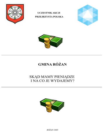 UCZESTNIK AKCJI PRZEJRZYSTA POLSKA GMINA RÓŻAN SKĄD MAMY PIENIĄDZE I NA CO JE WYDAJEMY? RÓŻAN 2005 „Skąd mamy pieniądze i na co je wydajemy” – odpowiedzi na te pytania zostaną udzielone w przedstawionej broszurce. Opracowanie broszury jest zadaniem obligatoryjnym, którego realizacja należy do Gminy w ramach akcji PRZEJRZYSTA POLSKA. Broszura skierowana jest do mieszkańców Gminy Różan i ma na celu przybliżenie informacji dotyczących gospodarki finansowej Gminy w roku 2005. Skąd gmina pozyskuje środki? Budżet gminy – jest rocznym planem finansowym uchwalanym w formie uchwały budżetowej , obejmującym: dochody i przychody i wydatki oraz rozchody gminy, przychody i wydatki zakładów budżetowych , jednostek budżetowych oraz funduszy celowych. Dochodami gminy są środki publiczne pobierane bezzwrotnie przez gminę od podmiotów gospodarczych, osób fizycznych , a także środki otrzymywane z budżetu państwa - subwencje i dotacje na realizację zadań związanych z zaspokojeniem zbiorowych potrzeb wspólnoty lokalnej. Z punktu widzenia samodzielności istotne znaczenie ma podział dochodów na tzw. dochody własne i dochody obce. Planowane dochody gminy w 2005 roku - 16.018.901 zł Dochody własne gminy to wpływy z podatków i opłat, które zasilają budżet gminy, ważniejsze planowane wpływy do budżetu w 2005 roku zostały przedstawione poniżej: - podatek od nieruchomości -1.846.035 zł, - podatek rolny – 130.250 zł, - podatek leśny – 23.882 zł, - podatek od środków transportowych – 34.400 zł - podatek od spadków i darowizn – 20.000 zł, - podatek od czynności cywilnoprawnej- 80.000 zł, - opłata z tytułu eksploatacji Krajowego Składowiska Odpadów Promieniotwórczych - 7.800.000 zł, - opłata targowa – 33.000 zł, - opłata skarbowa – 30.000 zł, - opłaty za zezwolenia na sprzedaż alkoholu – 50.000 zł, - podatki częściowo zasilające budżet gminy: - udział w podatku dochodowym od osób fizycznych – 767.332 zł, - udział w podatku dochodowym od osób prawnych – 10.000 zł, dochody z majątku gminy w tym: - dzierżaw – 60.000 zł, - z tytułu użytkowania wieczystego gruntów – 22.000 zł, - z czynszów za wynajem lokali dla potrzeb służby zdrowia – 36.750 zł, - sprzedaż mienia komunalnego – 20.000 zł, - dochody z tytułu odsetek od środków na rachunkach bankowych – 80.000 zł. Oprócz dochodów własnych gmina uzyskuje również subwencje i dotacje celowe. Subwencja- to środki przekazywane gminie z budżetu państwa, które mogą być dowolnie wykorzystane. Subwencja z budżetu państwa - część oświatowa subwencji ogólnej – 2.416.821 zł, - część wyrównawcza subwencji ogólnej – 318.797 zł, - część równoważąca subwencji ogólnej - 49.882 zł Dotacja celowa ma określone przeznaczenie i nie może być wydatkowana przez gminę na inny cel niż został on określony. Dotacje celowe, to głównie dochody przekazywane na zadania realizowane z zakresu: - pomocy społecznej - 1.195.100 zł - funkcjonowania administracji publicznej – 46.321 zł, - realizacji zadań z zakresu obrony cywilnej – 500 zł, Na co gmina wydaje pieniądze ? Planowane wydatki gminy w 2005 roku - 20.581.101 zł, z ważniejszych należy wymienić: - rolnictwo – 30.000 zł - utrzymanie składnicy zwłok zwierzęcych, zakup artykułów czystości, utylizacja odpadów zwłok zwierzęcych - 15.000 zł, - wyłapywanie bezpańskich psów – 12.000 zł, - remont dachu przy ul. Szkolnej – 100.000 zł, - wpłaty na rzecz Izb Rolniczych – 3.000 zł, - transport – 300.000 zł w tym: - remont dróg – 200.000 zł, - projekt organizacji ruchu - 100.000 zł, - gospodarka mieszkaniowa – 440.000 zł w tym: - remont dachu przy ul. Szkolnej – 100.000 zł, - opracowanie dokumentacji na budowę budynku komunalnego przy ul. Szkolnej – 40.000 zł, - remont budynków komunalnych przy ul. Poniatowskiego – 300.000 zł, - działalność usługowa – 191.500 zł, (prace geodezyjne i kartograficzne, opracowanie planu zagospodarowania przestrzennego miasta), - administracja publiczna – 1.763.651 zł, w tym między innymi: - Rada Miejska – 115.000 zł, - Urząd Gminy – 1.462.330 zł, - zatrudnienie pracowników interwencyjnych – 80.000 zł, - zadania z zakresu administracji rządowej – 46.321 zł, - bezpieczeństwo publiczne – 484.900 zł, z tego: - dotacja dla Komendy Wojewódzkiej na zakup samochodu – 35.000 zł, - dotacja dla Komendy Powiatowej Straży Pożarnej na zakup wyposażenia dla ratowników zatrudnionych w JRG w Różanie – 5.000 zł, - utrzymanie gotowości bojowej – 114.000 zł, - zakup samochodu pożarniczego – 50.000 zł, - dokończenie strażnicy OSP Szygi – 100.000 zł, - oświata i wychowanie – 4.173.354 zł z tego na: - szkołę podstawową – 1.871.635 zł, - gimnazjum – 1.144.096 zł, - przedszkole – 939.309 zł, - dowóz uczniów – 172.504 zł, - stypendia szkolne – 192.623 zł - pomoc społeczna – 2.056.552 zł z tego: - utrzymanie Ośrodka Pomocy Społecznej – 290.000 zł, - świadczenia rodzinne – 794.152 zł, - usługi opiekuńcze – 327.000 zł, - zasiłki i pomoc w naturze – 408.000 zł, - dodatki mieszkaniowe – 100.000 zł, - dodatkowe dożywiane uczniów – 124.400 zł, - ubezpieczenia zdrowotne dla osób pobierających niektóre świadczenia z pomocy społecznej – 13.000 zł, - edukacyjna opieka wychowawcza – 609.144 zł z tego: - świetlice szkolne – 265.021 zł, - wypoczynek dzieci i młodzieży – 151.500 zł, - gospodarka komunalna i ochrona środowiska – 991.130 zł w tym między innymi: - oczyszczanie miasta – 100.000 zł, - utrzymanie zieleni - 30.000 zł, - oświetlenie ulic – 150.000 zł, - dotacja dla ZGK i M do deficytowej działalności – 611.130 zł, - zagospodarowanie Placu Obrońców Różana oraz terenu wokół Gminnego Ośrodka Upowszechniania Kultury - 100.000 zł, - kultura i ochrona dziedzictwa narodowego –