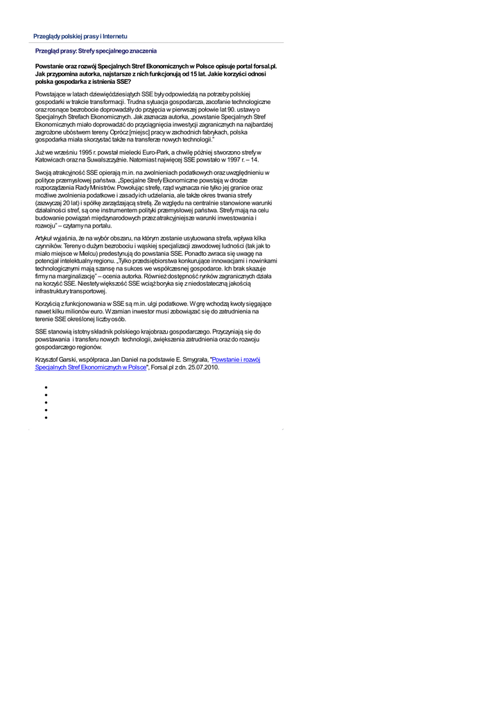 Przeglądy polskiej prasy i Internetu Przegląd prasy: Strefy specjalnego znaczenia Powstanie oraz rozwój Specjalnych Stref Ekonomicznych w Polsce opisuje portal forsal.pl. Jak przypomina autorka, najstarsze z nich funkcjonują od 15 lat. Jakie korzyści odnosi polska gospodarka z istnienia SSE? Powstające w latach dziewięćdziesiątych SSE były odpowiedzią na potrzeby polskiej gospodarki w trakcie transformacji. Trudna sytuacja gospodarcza, zacofanie technologiczne oraz rosnące bezrobocie doprowadziły do przyjęcia w pierwszej połowie lat 90. ustawy o Specjalnych Strefach Ekonomicznych. Jak zaznacza autorka, „powstanie Specjalnych Stref Ekonomicznych miało doprowadzić do przyciągnięcia inwestycji zagranicznych na najbardziej zagrożone ubóstwem tereny. Oprócz [miejsc] pracy w zachodnich fabrykach, polska gospodarka miała skorzystać także na transferze nowych technologii.” Już we wrześniu 1995 r. powstał mielecki Euro-Park, a chwilę później stworzono strefy w Katowicach oraz na Suwalszczyźnie. Natomiast najwięcej SSE powstało w 1997 r. – 14. Swoją atrakcyjność SSE opierają m.in. na zwolnieniach podatkowych oraz uwzględnieniu w polityce przemysłowej państwa. „Specjalne Strefy Ekonomiczne powstają w drodze rozporządzenia Rady Ministrów. Powołując strefę, rząd wyznacza nie tylko jej granice oraz możliwe zwolnienia podatkowe i zasady ich udzielania, ale także okres trwania strefy (zazwyczaj 20 lat) i spółkę zarządzającą strefą. Ze względu na centralnie stanowione warunki działalności stref, są one instrumentem polityki przemysłowej państwa. Strefy mają na celu budowanie powiązań międzynarodowych przez atrakcyjniejsze warunki inwestowania i rozwoju” – czytamy na portalu. Artykuł wyjaśnia, że na wybór obszaru, na którym zostanie usytuowana strefa, wpływa kilka czynników. Tereny o dużym bezrobociu i wąskiej specjalizacji zawodowej ludności (tak jak to miało miejsce w Mielcu) predestynują do powstania SSE. Ponadto zwraca się uwagę na potencjał intelektualny regionu. „Tylko przedsiębiorstwa konkurujące innowacjami i nowinkami technologicznymi mają szansę na sukces we współczesnej gospodarce. Ich brak skazuje firmy na marginalizację” – ocenia autorka. Również dostępność rynków zagranicznych działa na korzyść SSE. Niestety większość SSE wciąż boryka się z niedostateczną jakością infrastruktury transportowej. Korzyścią z funkcjonowania w SSE są m.in. ulgi podatkowe. W grę wchodzą kwoty sięgające nawet kilku milionów euro. W zamian inwestor musi zobowiązać się do zatrudnienia na terenie SSE określonej liczby osób. SSE stanowią istotny składnik polskiego krajobrazu gospodarczego. Przyczyniają się do powstawania i transferu nowych technologii, zwiększenia zatrudnienia oraz do rozwoju gospodarczego regionów. Krzysztof Garski, współpraca Jan Daniel na podstawie E. Smygrała, "Powstanie i rozwój Specjalnych Stref Ekonomicznych w Polsce", Forsal.pl z dn. 25.07.2010.
