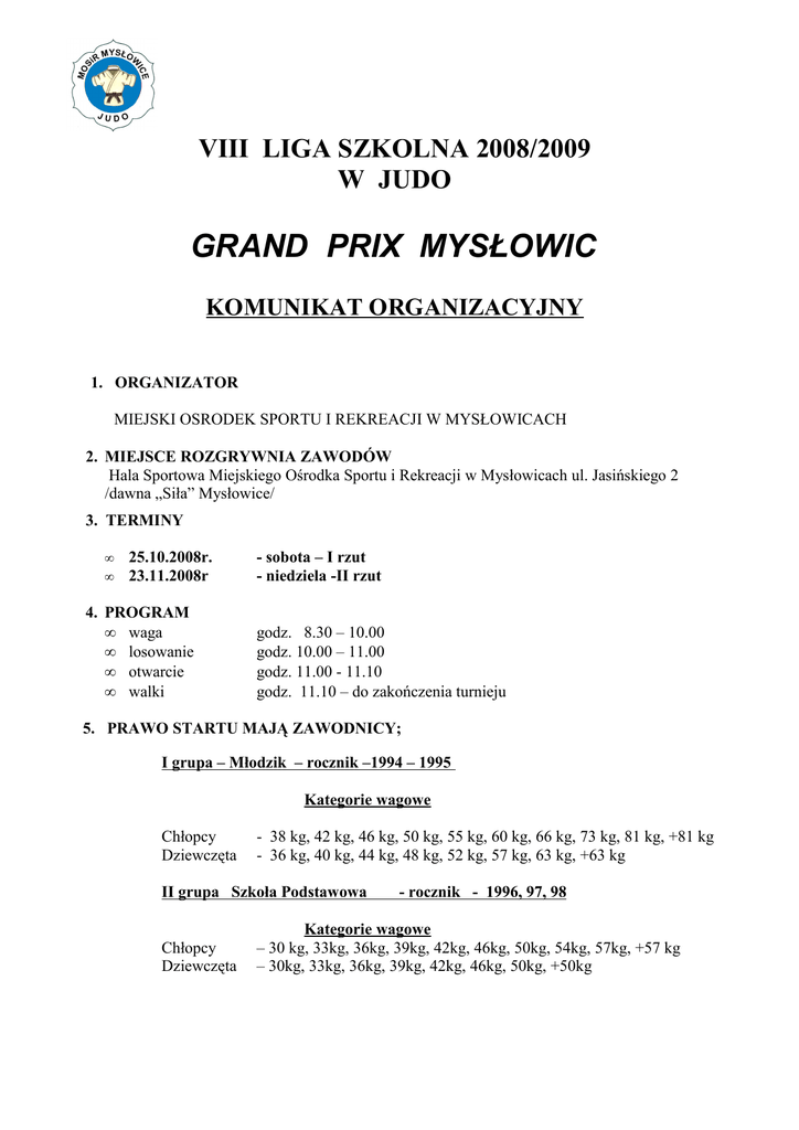 VIII LIGA SZKOLNA 2008/2009 W JUDO GRAND PRIX MYSŁOWIC KOMUNIKAT ORGANIZACYJNY 1. ORGANIZATOR MIEJSKI OSRODEK SPORTU I REKREACJI W MYSŁOWICACH 2. MIEJSCE ROZGRYWNIA ZAWODÓW Hala Sportowa Miejskiego Ośrodka Sportu i Rekreacji w Mysłowicach ul. Jasińskiego 2 /dawna „Siła” Mysłowice/ 3. TERMINY • • 25.10.2008r. 23.11.2008r 4. PROGRAM • waga • losowanie • otwarcie • walki - sobota – I rzut - niedziela -II rzut godz. 8.30 – 10.00 godz. 10.00 – 11.00 godz. 11.00 - 11.10 godz. 11.10 – do zakończenia turnieju 5. PRAWO STARTU MAJĄ ZAWODNICY; I grupa – Młodzik – rocznik –1994 – 1995 Kategorie wagowe Chłopcy Dziewczęta - 38 kg, 42 kg, 46 kg, 50 kg, 55 kg, 60 kg, 66 kg, 73 kg, 81 kg, +81 kg - 36 kg, 40 kg, 44 kg, 48 kg, 52 kg, 57 kg, 63 kg, +63 kg II grupa Szkoła Podstawowa Chłopcy Dziewczęta - rocznik - 1996, 97, 98 Kategorie wagowe – 30 kg, 33kg, 36kg, 39kg, 42kg, 46kg, 50kg, 54kg, 57kg, +57 kg – 30kg, 33kg, 36kg, 39kg, 42kg, 46kg, 50kg, +50kg III grupa Szkoła Podstawowa Chłopcy Dziewczęta - rocznik - 1999, 00, 01, Kategorie wagowe – 24 kg, 27kg, 30kg, 33kg, 36kg, 39kg, 42kg, + 42 kg – 21kg, 24kg, 27kg, 30kg, 33kg, 36kg, 39kg, +39kg Organizator zastrzega sobie prawo do łączenia kategorii wagowych w przypadku małej ilości zawodników Zawodnicy muszą posiadać aktualne badania lekarskie, legitymację szkolną oraz ubezpieczenie od nieszczęśliwych wypadków. W przypadku urazu organizator nie ponosi odpowiedzialności. 6. CZAS WALKI - I grupa - 3 minuty czas ciągły -II grupa - 2 minuty czas ciągły 7. ROZGRYWANIE WALK - systemem „KaŜdy z KaŜdym”, „Brukselski” i „Francuski” Punktacja – „KaŜdy z KaŜdym” I miejsce – 5 pkt II miejsce – 3 pkt III miejsce – 1 pkt Punktacja – system „Brukselski” i „Francuski” I miejsce – 6 pkt II miejsce – 4 pkt III miejsce – 2 pkt 8. OPŁATA STARTOWA - 15 zł. od zawodnika 9. ZAWODNICY ZAJMUJĄCY MIEJSCA 1-3 OTRZUMUJA MEDALE ORAZ DYPLOMY 10. PODSUMOWANIE LIGI SZKOLNEJ - GRAND PRIX Mysłowic – 2009 rok TELEFONY KONTAKTOWE – trenerzy - Ryszard Dziewulski – 0- 502 075 398 Andrzej Stępień – 0- 516 091 442 11. WAśNE !!! KaŜdy biorący udział Klub Sportowy w GRAND PRIX - Liga Szkolna winien posiadać w swojej ekipie SĘDZIEGO. Ze sportowym pozdrowieniem