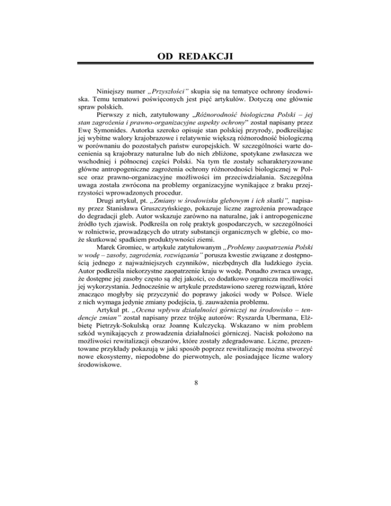 OD REDAKCJI Niniejszy numer „Przyszłości” skupia się na tematyce ochrony środowiska. Temu tematowi poświęconych jest pięć artykułów. Dotyczą one głównie spraw polskich. Pierwszy z nich, zatytułowany „Różnorodność biologiczna Polski – jej stan zagrożenia i prawno-organizacyjne aspekty ochrony” został napisany przez Ewę Symonides. Autorka szeroko opisuje stan polskiej przyrody, podkreślając jej wybitne walory krajobrazowe i relatywnie większą różnorodność biologiczną w porównaniu do pozostałych państw europejskich. W szczególności warte docenienia są krajobrazy naturalne lub do nich zbliżone, spotykane zwłaszcza we wschodniej i północnej części Polski. Na tym tle zostały scharakteryzowane główne antropogeniczne zagrożenia ochrony różnorodności biologicznej w Polsce oraz prawno-organizacyjne możliwości im przeciwdziałania. Szczególna uwaga została zwrócona na problemy organizacyjne wynikające z braku przejrzystości wprowadzonych procedur. Drugi artykuł, pt. „Zmiany w środowisku glebowym i ich skutki”, napisany przez Stanisława Gruszczyńskiego, pokazuje liczne zagrożenia prowadzące do degradacji gleb. Autor wskazuje zarówno na naturalne, jak i antropogeniczne źródło tych zjawisk. Podkreśla on rolę praktyk gospodarczych, w szczególności w rolnictwie, prowadzących do utraty substancji organicznych w glebie, co może skutkować spadkiem produktywności ziemi. Marek Gromiec, w artykule zatytułowanym „Problemy zaopatrzenia Polski w wodę – zasoby, zagrożenia, rozwiązania” porusza kwestie związane z dostępnością jednego z najważniejszych czynników, niezbędnych dla ludzkiego życia. Autor podkreśla niekorzystne zaopatrzenie kraju w wodę. Ponadto zwraca uwagę, że dostępne jej zasoby często są złej jakości, co dodatkowo ogranicza możliwości jej wykorzystania. Jednocześnie w artykule przedstawiono szereg rozwiązań, które znacząco mogłyby się przyczynić do poprawy jakości wody w Polsce. Wiele z nich wymaga jedynie zmiany podejścia, tj. zauważenia problemu. Artykuł pt. „Ocena wpływu działalności górniczej na środowisko – tendencje zmian” został napisany przez trójkę autorów: Ryszarda Ubermana, Elżbietę Pietrzyk-Sokulską oraz Joannę Kulczycką. Wskazano w nim problem szkód wynikających z prowadzenia działalności górniczej. Nacisk położono na możliwości rewitalizacji obszarów, które zostały zdegradowane. Liczne, prezentowane przykłady pokazują w jaki sposób poprzez rewitalizację można stworzyć nowe ekosystemy, niepodobne do pierwotnych, ale posiadające liczne walory środowiskowe. 8 OD REDAKCJI Ostatni artykuł tematu pt. „Ochrona przyrodniczych procesów usług środowiska w perspektywie ekonomii zrównoważonego rozwoju” został napisany przez Artura Michałowskiego. Ten tekst analizuje problematykę ochrony przyrody z punktu widzenia teorii ekonomii. Autor zwraca uwagę na różnice pomiędzy ekonomią neoklasyczną a ekonomią zrównoważonego rozwoju. Na tym tle została przedstawiona idea usług środowiska, czyli korzyści wynikających z funkcjonowania ekosystemu, ale niemających wyceny rynkowej. Ich włączenie do rachunku ekonomicznego działalności gospodarczej stanowiłoby rozwiązanie większości problemów środowiskowych. W drugiej części niniejszego numeru przedstawiamy dwa teksty. Pierwszy z nich został napisany przez Marka Chlebusia. Ten esej zatytułowany „Przyszłość. Poradnik użytkownika” zawiera teoretyczne rozważania na temat czasu oraz możliwości przewidywania przyszłości. Autor wskazuje liczne przyczyny, dla których prognozowanie przyszłych zjawisk może nie być możliwe. Ostatni tekst, napisany przez Kamila Zajączkowskiego, jest recenzją książki Katarzyny Nawrot pt. „Kraje rozwijające się we współczesnej gospodarce światowej. Przyczynek do ekonomii rozwoju”. Na koniec numeru przedstawiamy subiektywny przegląd najciekawszych, międzynarodowych trendów dotyczących studiów nad przyszłością. Ponadto prezentujemy kronikę działalności Komitetu oraz jego dorobek publikacyjny. Serdecznie zapraszamy osoby zainteresowane zamieszczaniem artykułów w „Przyszłości”. Każdy tekst dotyczący tematyki badań nad przyszłością będzie przez nas rozważony. Wymogi dla autorów oraz procedura recenzowania zostały opisane na stronie internetowej czasopisma: http://www.prognozy.pan.pl/index.php/wydawnictwa/38-biuletyn-komitetu. Redakcja publikuje recenzje oraz informacje o konferencjach. W tym ostatnim przypadku warto pamiętać, że czasopismo ma charakter półrocznika, co oznacza konieczność wysłania wiadomości ze znacznym wyprzedzeniem. Zapraszamy do lektury. Zespół Redakcyjny 9