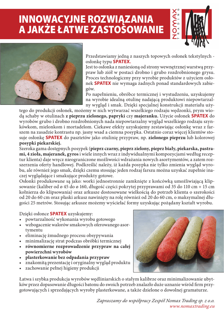 INNOWACYJNE ROZWIĄZANIA A JAKŻE ŁATWE ZASTOSOWANIE Przedstawiamy jedną z naszych topowych osłonek tekstylnych osłonkę typu SPATEX. Jest to osłonka z naniesioną od strony wewnętrznej warstwą przypraw lub ziół w postaci drobno i grubo rozdrobnionego grysu. Proces technologiczny przy wyrobie produktów z użyciem osłonek SPATEX nie wymaga żadnych ponad standardowych zabiegów. Po napełnieniu, obróbce termicznej i wystudzeniu, uzyskujemy na wyrobie idealną otulinę nadającą produktowi niepowtarzalny wygląd i smak. Dzięki specjalnej konstrukcji materiału użytego do produkcji osłonek, możemy w nich wytwarzać wszelkiego rodzaju wędzonki, prym wiodą schaby w otulinach z pieprzu zielonego, papryki czy majeranku. Użycie osłonek SPATEX do wyrobów grubo i drobno rozdrobnionych nada niepowtarzalny wygląd wszelkiego rodzaju szynkówkom, mielonkom i mortadelom. Ciekawe efekty uzyskujemy zestawiając osłonkę wraz z farszem na zasadzie kontrastu np. jasny wsad a ciemna posypka. Ostatnio coraz więcej klientów stosuje osłonkę SPATEX do pasztetów jako otulinię przypraw, np. zielonego pieprzu lub kolorowej posypki piekarskiej. Szeroka gama dostępnych posypek (pieprz czarny, pieprz zielony, pieprz biały, piekarska, pastrami, 4 zioła, majeranek, gyros i wiele innych wraz z indywidualnymi kompozycjami według receptur klienta) daje wręcz nieograniczone możliwości wdrażania nowych asortymentów, a zatem rozszerzenia oferty handlowej. Podkreślić należy, iż każda posypka nie tylko zmienia wygląd wyrobu, ale również jego smak, dzięki czemu stosując jeden rodzaj farszu można uzyskać zupełnie inaczej wyglądające i smakujące produkty gotowe. Osłonki produkowane są jako: worki jednostronnie zamknięte z końcówką umożliwiającą klipsowanie (kaliber od ø 45 do ø 160, długość części pokrytej przyprawami od 35 do 110 cm + 15 cm kołnierza do klipsowania) oraz arkusze dostosowane wielkością do potrzeb klienta o szerokości od 20 do 60 cm oraz płaski arkusz nawinięty na rolę również od 20 do 60 cm, o maksymalnej długości 25 metrów. Stosując arkusze możemy wyściełać formy uzyskując pożądany kształt wyrobu. Dzięki osłonce SPATEX uzyskujemy: • powtarzalność wykonania wyrobu gotowego • wzbogacenie walorów smakowych oferowanego asortymentu • eliminację żmudnego procesu obsypywania • minimalizację strat podczas obróbki termicznej • równomierne rozprowadzenie przypraw na całej powierzchni wyrobów • plasterkowanie bez odpadania przypraw • znakomitą prezentację i oryginalny wygląd produktu • zachowanie pełnej higieny produkcji Łatwa i szybka produkcja wyrobów wędliniarskich o stałym kalibrze oraz minimalizowanie ubytków przez dopasowanie długości batonu do swoich potrzeb znalazło duże uznanie wśród firm przygotowujących i sprzedających wyroby plasterkowane, a także dzielone o dowolnej gramaturze. Zapraszamy do współpracy Zespół Nomax Trading sp. z o.o. www.nomaxtrading.eu