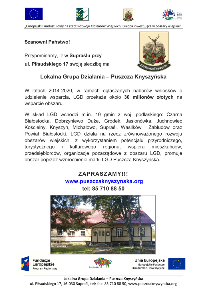 „Europejski Fundusz Rolny na rzecz Rozwoju Obszarów Wiejskich: Europa inwestująca w obszary wiejskie” Szanowni Państwo! Przypominamy, iż w Supraślu przy ul. Piłsudskiego 17 swoją siedzibę ma Lokalna Grupa Działania – Puszcza Knyszyńska W latach 2014-2020, w ramach ogłaszanych naborów wniosków o udzielenie wsparcia, LGD przekaże około 30 milionów złotych na wsparcie obszaru. W skład LGD wchodzi m.in. 10 gmin z woj. podlaskiego: Czarna Białostocka, Dobrzyniewo Duże, Gródek, Jasionówka, Juchnowiec Kościelny, Knyszyn, Michałowo, Supraśl, Wasilków i Zabłudów oraz Powiat Białostocki. LGD działa na rzecz zrównoważonego rozwoju obszarów wiejskich, z wykorzystaniem potencjału przyrodniczego, turystycznego i kulturowego regionu, wspiera mieszkańców, przedsiębiorców, organizacje pozarządowe z obszaru LGD, promuje obszar poprzez wzmocnienie marki LGD Puszcza Knyszyńska. ZAPRASZ AMY!!! www.puszczaknyszynska.org tel: 85 710 88 50 Lokalna Grupa Działania – Puszcza Knyszyńska ul. Piłsudskiego 17, 16-030 Supraśl, tel/ fax: 85 710 88 50, www.puszczaknyszynska.org