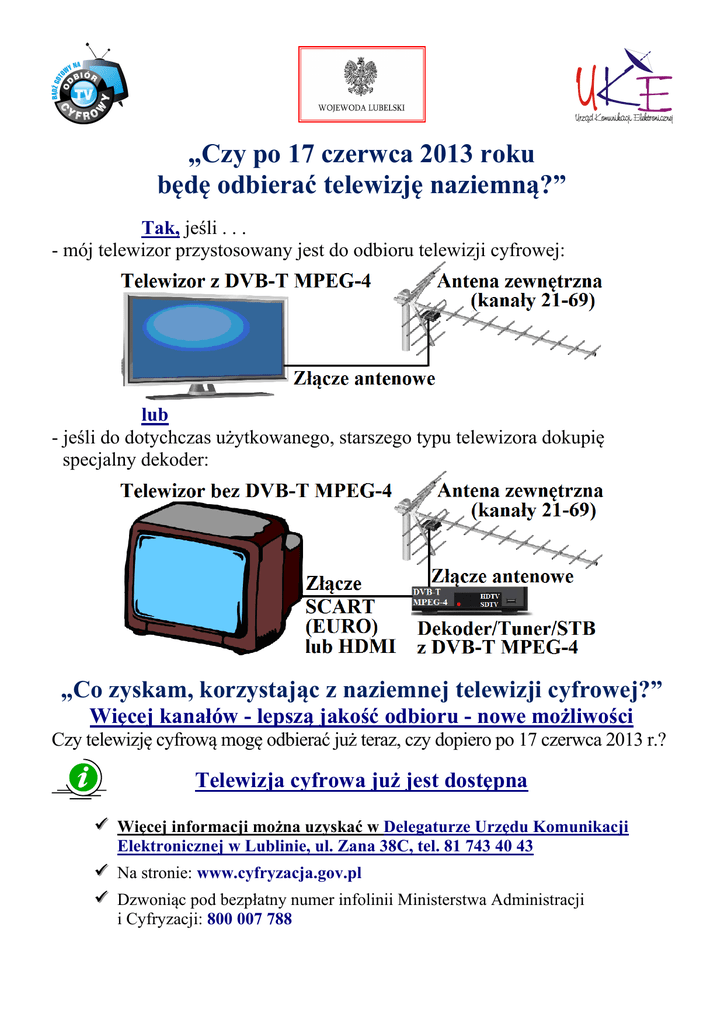 „Czy po 17 czerwca 2013 roku będę odbierać telewizję naziemną?” Tak, jeśli . . . - mój telewizor przystosowany jest do odbioru telewizji cyfrowej: lub - jeśli do dotychczas użytkowanego, starszego typu telewizora dokupię specjalny dekoder: „Co zyskam, korzystając z naziemnej telewizji cyfrowej?” Więcej kanałów - lepszą jakość odbioru - nowe możliwości Czy telewizję cyfrową mogę odbierać już teraz, czy dopiero po 17 czerwca 2013 r.? Telewizja cyfrowa już jest dostępna 9 9 Więcej informacji można uzyskać w Delegaturze Urzędu Komunikacji Elektronicznej w Lublinie, ul. Zana 38C, tel. 81 743 40 43 9 9 Na stronie: www.cyfryzacja.gov.pl 9 9 Dzwoniąc pod bezpłatny numer infolinii Ministerstwa Administracji i Cyfryzacji: 800 007 788