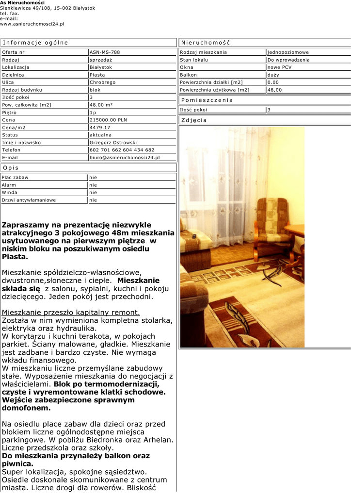 As Nieruchomości Sienkiewicza 49/108, 15-002 Białystok tel. fax. e-mail: www.asnieruchomosci24.pl Informacje ogólne Nieruchomość Oferta nr ASN-MS-788 Rodzaj mieszkania jednopoziomowe Rodzaj sprzedaż Stan lokalu Do wprowadzenia Lokalizacja Białystok Okna nowe PCV Dzielnica Piasta Balkon duży Ulica Chrobrego Powierzchnia działki [m2] 0.00 Rodzaj budynku blok Powierzchnia użytkowa [m2] 48,00 Ilość pokoi 3 Pow. całkowita [m2] 48.00 m² Piętro 1p Cena 215000.00 PLN Cena/m2 4479.17 Status aktualna Imię i nazwisko Grzegorz Ostrowski Telefon 602 701 662 604 434 682 E-mail [email protected] Opis Plac zabaw nie Alarm nie Winda nie Drzwi antywłamaniowe nie Zapraszamy na prezentację niezwykle atrakcyjnego 3 pokojowego 48m mieszkania usytuowanego na pierwszym piętrze w niskim bloku na poszukiwanym osiedlu Piasta. Mieszkanie spółdzielczo-własnościowe, dwustronne,słoneczne i ciepłe. Mieszkanie składa się z salonu, sypialni, kuchni i pokoju dziecięcego. Jeden pokój jest przechodni. Mieszkanie przeszło kapitalny remont. Została w nim wymieniona kompletna stolarka, elektryka oraz hydraulika. W korytarzu i kuchni terakota, w pokojach parkiet. Ściany malowane, gładkie. Mieszkanie jest zadbane i bardzo czyste. Nie wymaga wkładu finansowego. W mieszkaniu liczne przemyślane zabudowy stałe. Wyposażenie mieszkania do negocjacji z właścicielami. Blok po termomodernizacji, czyste i wyremontowane klatki schodowe. Wejście zabezpieczone sprawnym domofonem. Na osiedlu place zabaw dla dzieci oraz przed blokiem liczne ogólnodostępne miejsca parkingowe. W pobliżu Biedronka oraz Arhelan. Liczne przedszkola oraz szkoły. Do mieszkania przynależy balkon oraz piwnica. Super lokalizacja, spokojne sąsiedztwo. Osiedle doskonale skomunikowane z centrum miasta. Liczne drogi dla rowerów. Bliskość Pomieszczenia Ilość pokoi Zdjęcia 3 Galerii Handlowych sprawia to miejsce niezwykle atrakcyjnym. Czynsz w wysokości ok 400zł. Z chęcią pomagamy w uzyskaniu środków finansowych na zakup tej oraz innych nieruchomości. Zapraszamy na prezentację! © Wszelkie prawa zastrzeżone - As Nieruchomości