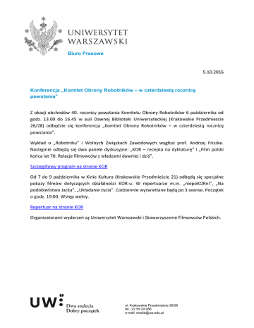 Biuro Prasowe 5.10.2016 Konferencja „Komitet Obrony Robotników – w czterdziestą rocznicę powstania” Z okazji obchodów 40. rocznicy powstania Komitetu Obrony Robotników 6 października od godz. 13.00 do 16.45 w auli Dawnej Biblioteki Uniwersyteckiej (Krakowskie Przedmieście 26/28) odbędzie się konferencja „Komitet Obrony Robotników – w czterdziestą rocznicę powstania”. Wykład o „Robotniku” i Wolnych Związkach Zawodowych wygłosi prof. Andrzej Friszke. Następnie odbędą się dwa panele dyskusyjne: „KOR – recepta na dyktaturę” i „Film polski końca lat 70. Relacje filmowców z władzami dawniej i dziś”. Szczegółowy program na stronie KOR Od 7 do 9 października w Kinie Kultura (Krakowskie Przedmieście 21) odbędą się specjalne pokazy filmów dotyczących działalności KOR-u. W repertuarze m.in. „niepoKORni”, „Na podobieństwo Jacka”, „Układanie życia”. Codziennie wyświetlane będą po 3 seanse. Początek o godz. 19.00. Wstęp wolny. Repertuar na stronie KOR Organizatorami wydarzeń są Uniwersytet Warszawski i Stowarzyszenie Filmowców Polskich. ul. Krakowskie Przedmieście 26/28 tel.: 22 55 24 066 e-mail: [email protected]