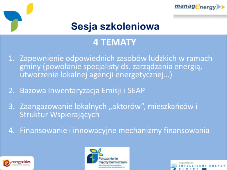 Sesja szkoleniowa 4 TEMATY 1. Zapewnienie odpowiednich zasobów ludzkich w ramach gminy (powołanie specjalisty ds. zarządzania energią, utworzenie lokalnej agencji energetycznej…) 2. Bazowa Inwentaryzacja Emisji i SEAP 3. Zaangażowanie lokalnych „aktorów”, mieszkaoców i Struktur Wspierających 4. Finansowanie i innowacyjne mechanizmy finansowania Sesja szkoleniowa – Część 1 Opracowanie i wdrożenie Planu Działao na rzecz Zrównoważonej Energii (SEAP) TEMAT 1 Budowa kapitału ludzkiego gminy Peter Schilken, Energy Cities Odpowiednie struktury administracyjne Zapewnienie odpowiednich zasobów ludzkich w ramach gminy: -> powołanie specjalisty ds. zarządzania energią -> utworzenie wydziału ds. zarządzania energią -> powołanie lokalnej agencji energetycznej -> powołanie lokalnej/regionalnej agencji energetycznej wspólnie z innymi miastami Specjalista/Jednostka ds. Zarządzania Energią • wewnętrzny/a (średnie i duże gminy) lub zewnętrzny/a (małe gminy) • Zadania: -> Koordynacja działao związanych z Porozumieniem podejmowanych w gminie – Koordynacja prac nad gminnym SEAP oraz jego wdrażania i monitoringu – Zarządzanie energią w budynkach komunalnych – Mobilizacja środków finansowych – Kontakty z lokalnymi „aktorami” – Koordynacja działao związanych z energią i ochroną klimatu realizowanych przez różne wydziały gminy – Kontakty z mediami, promocja osiągnięć Doświadczenia wybranych miast europejskich Bielsko-Biała (PL) Brasov (RO) Stuttgart (DE) Bielsko-Biała (PL) • Bielsko-Biała: 178,000 mieszkaoców • Biuro Zarządzania Energią utworzone w ramach miejskiej administracji w 1997 roku • Zadania: -> Badanie i rozwój lokalnego rynku energii -> Opracowanie, wdrożenie i monitoring lokalnego SEAP -> Monitoring wdrażania aktualnych regulacji w zakresie wykorzystania energii -> Monitoring zużycia energii w obiektach gminnych oraz rekomendowanie inwestycji na podstawie analiz ekonomicznych ABMEE Brasov • Braşov: 283.000 mieszkaoców • Personel ABMEE = 5 osób zatrudnionych na pełny etat • Agencja została utworzona przez władze lokalne w 2003 roku w ramach programu SAVE Zadania: -> Monitoring zużycia energii i wody oraz zgłaszanie propozycji inwestycji w tym obszarze -> Opracowanie i monitoring wdrażania SEAP -> Udzielanie pomocy technicznej władzom lokalnym -> Organizacja kampanii informacyjnych / Miejskich Dni Energii -> Udział w krajowych i unijnych projektach o tematyce energetycznej Stuttgart (DE) • Stuttgart: 602,000 mieszkaoców Zadania: -> Pomiary zużycia energii i wody -> Prowadzenie doradztwa dla dozorców, techników oraz różnych wydziałów administracji miejskiej -> Nadzór nad zakupami energii -> Realizacja projektów badawczych i demonstracyjnych -> Opracowywanie wytycznych -> Zmiana zachować użytkowników -> Działania w zakresie public relations Zużycie energii cieplnej w przypadku, gdy jest oraz gdy nie jest prowadzone zarządzanie energią 42 +0,1 % heat consumption [mio. kWh] 41 -6,0 % 40 +3,8 % 39 -0,3 % trend +2,2 % 38 37 +2,1% -11 % -3,0 % -0,8 % 36 35 restart energy management 10.000 MWh 360.000 Euro -1,8 % end energy management 34 - 6,2% 33 32 1991 1992 1993 1994 1995 1996 1997 1998 1999 2000 2001 2002 year Oszczędności a wydatki na personel i inwestycje Koszty Oszczędności Woda En. elektryczna Ogrzewanie Personel Wydatki Amortyzacja