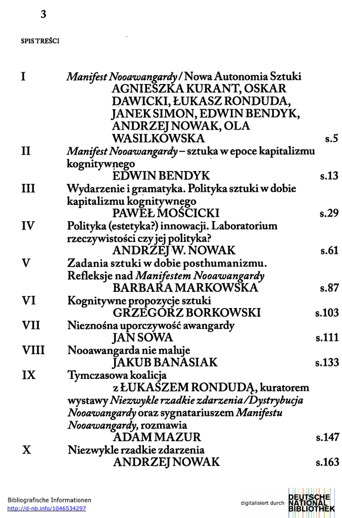 3 SPIS TREŚCI I II III IV V VI VII VIII IX X Manifest Nooawangardy / Nowa Autonomia Sztuki AGNIESZKA KURANT, OSKAR DAWICKI, ŁUKASZ RONDUDA, JANEK SIMON, EDWIN BENDYK, ANDRZEJ NOWAK, OLA WASILKOWSKA s.5 Manifest Nooawangardy—sztuka w epoce kapitalizmu kognitywnego EDWIN BENDYK s.13 Wydarzenie i gramatyka. Polityka sztuki w dobie kapitalizmu kognitywnego PAWEŁ MOŚCICKI s.29 Polityka (estetyka?) innowacji. Laboratorium rzeczywistości czyjej polityka? ANDRZEJ W. NOWAK s.61 Zadania sztuki w dobie posthumanizmu. Refleksje nad Manifestem Nooawangardy BARBARA MARKOWSKA s.87 Kognitywne propozycje sztuki GRZEGORZ BORKOWSKI s.103 Nieznośna uporczywość awangardy JAN SOWA s.111 Nooawangarda nie maluje JAKUB BANASIAK s.133 Tymczasowa koalicja z ŁUKASZEM RONDUDĄ, kuratorem wystawy Niezwykle rzadkie zdarzenia/Dystrybucja Nooawangardy oraz sygnatariuszem Manifestu Nooawangardy, rozmawia ADAM MAZUR s.147 Niezwykle rzadkie zdarzenia ANDRZEJ NOWAK s.163 http://d-nb.info/1046534297