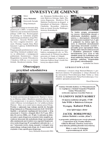 OGŁOSZENIA INWESTYCJE Nasze NaszeJutro Jutro77 INWESTYCJE GMINNE Mówi Jerzy Michalski Kierownik Zarządu Dróg Gminnych Ogłoszono przetargi na równanie dróg gruntowych w 2009 r. w Gminie Włoszakowice oraz na kruszenie kamienia polnego (2500 ton). Rozstrzygnięto też przetarg na wykonanie projektu budowlanego przebudowy drogi Włoszakowice – Krzycko Wielkie przez las, wraz z ciągiem rowerowo – pieszym. Przetarg wygrała firma Biuro Inżynierii Lądowej EUROSTRADA z Czarnkowa. Pragnę ponadto poinformować, że Zarząd Dróg Gminnych podpisał umowy na odśnieżanie z następującymi podmiotami: Kazimierzem i Janem Biegańskimi na terenie Włoszakowic i Ujazdowa; GZK sp. z o.o na terenie Grotnik, Boszkowa-Letniska, Domi- nic; Romanem Królikowskim na terenie Bukówca Górnego, Sądzi, Zbarzewa, Boguszyna, Boszkowa -Wsi; Markiem Grochowym na drogach w kierunkach od Skarżynia i DłużynyCharbielin; Ryszardem Antkowiakiem na terenie Krzycka Wielkiego i Jezierzyc Kościelnych. W ostatnim czasie zakończono przebudowę następujących ulic we Włoszakowicach: ul. Wolności (na zdjęciu powyżej), ul. Osady, ul. Zakątek. Na ulicu Podgórnej w Ujazdowie zakończono budowę drogi z kostki brukowej (na zdjęciu obok). Oburzający przykład szkodnictwa Na koniec pragnę przypomnieć raz jeszcze właścicielom posesji o odśnieżaniu chodników zgodnie z ustawą o obowiązkach właścicieli nieruchomości (rozdział 3 art. 5. pkt 1. podpunkt 4.), której zapis stanowi, że właściciele nieruchomośći zapewniają utrzymanie czystości i porządku przez uprzątnięcie błota, śniegu, lodu i innych zanieczyszczeń z chodników położonych wzdłuż nieruchomości, przy czym za taki chodnik uznaje się wydzieloną część drogi publicznej służącej dla ruchu pieszego położoną bezpośrednio przy granicy nieruchomości. wysłuchał Jan Janura S PR O S T O WAN I E W informacji o otwarciu drogi Skarżyń-Dłużyna w grudniowym numerze NJ pominąłem w relacji obecność na tej uroczystosci Przewodniczącej Rady Gminy p. Ireny Przezbór. Za niedopatrzenie Panią Przewodniczącą i Czytelników uprzejmie przepraszam. Paweł Borowiec Gminny Ośrodek Kultury we Włoszakowicach we współpracy z Kołami Gospodyń Wiejskich Gminy Włoszakowice serdecznie zaprasza wszystkie Panie na Na drodze powiatowej od miejscowości Skarżyń w kierunku na Dłużynę rolnik z Bronikowa przeorał pobocze drogi. Trwa postępowanie w tej sprawie. Podobnie dwa lata temu rolnik z Dłużyny wyrwał pługiem ok. 2 m2 asfaltu na drodze Dłużyna – Bucz, za co został surowo ukarany przez Policję. Prosimy o zgłaszanie tego rodzaju zjawisk do Zarządu Dróg Gminnych we Włoszakowicach (tel. 0-65 / 52 52 961). Zgodnie z przepisami regulującymi korzystanie z dróg zawartymi w Ustawie o drogach (Dz.U.Nr.71 poz. 838 z dnia 26 czerwca 2000r., art. 39 pkt. 1) zabrania się dokonywania w pasie drogowym czynności, które mogłyby powodować niszczenie lub uszkodzenie drogi i jej urządzeń albo zmniejszenie jej trwałości oraz zagrażać bezpieczeństwu ruchu drogowego.W szczególności zabrania się: (…) ust. 7 niszczenia rowów, skarp, nasypów i wykopów oraz samowolnego rozkopywania drogi, ust. 8 zaorywania lub zwężania w inny sposób pasa drogowego. Jerzy Michalski Kierownik ZDG VI GMINNY DZIEŃ KOBIET 14 marca (sobota) od godz. 17.00 Sala WDK w Bukówcu Górnym Wystąpią: Kabaret PAKA oraz śpiewający aktor JACEK BORKOWSKI (doktor Rafalski z serialu „Klan”) w programie: polskojęzyczne wersje piosenek z repertuaru m.in. Franka Sinatry, Gilberta Bécaud, Charlesa Aznavoura oraz klasyka polskiej piosenki rozrywkowej Bilety w cenie 15 zł dostępne u przewodniczących KGW