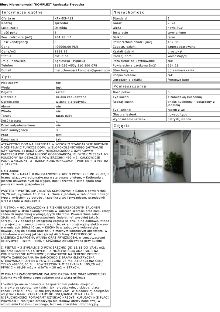 Biuro Nieruchomości "KOMPLEX" Agnieszka Trypucka Informacje ogólne Nieruchomość Oferta nr KPX-DS-412 Standard 5 Rodzaj sprzedaż Garaż kilka Lokalizacja Ostróda Okna nowe PCV Ilość pokoi 6 Instalacje wymienione Pow. całkowita [m2] 264.28 m² Balkon taras Ilość kondygnacji 3 Powierzchnia działki [m2] 492.00 Cena 499000.00 PLN Zagosp. działki zagospodarowana Cena/m2 1888.15 Kształt działki prostokąt Status aktualna Rodzaj domu wolnostojący Imię i nazwisko Agnieszka Trypucka Pozwolenie na użytkowanie tak Telefon 515-293-453; 510 500 078 Powierzchnia użytkowa [m2] 264,28 E-mail [email protected] Stan budynku do zamieszkania Podpiwniczenie tak Ogrodzenie działki frontowe kute Opis Plac zabaw nie Woda jest Pomieszczenia Dojazd asfalt Ilość pokoi 6 Otoczenie działki zabudowane Typ kuchni z zabudową kuchenną Ogrzewanie własne dla budynku Rodzaj kuchni Alarm nie aneks kuchenny - połączony z jadalnią Winda nie Typ łazienki razem z wc Tarasy taras duży Glazura łazienki nowego typu Ilość tarasów 1 Wyposażenie łazienki natrysk, wanna Drzwi antywłamaniowe nie Zdjęcia Ilość kondygnacji 3 Prąd jest Kanalizacja tak ATRAKCYJNY DOM NA SPRZEDAŻ W WYSOKIM STANDARDZIE BUDYNEK MOŻE PEŁNIĆ FUNKCJE DOMU WIELOPOKOLENIOWEGO (AKTUALNE UŻYTKOWANIE) BĄDŹ DOMU MIESZKALNEGO Z UŻYTKOWYM PARTEREM POD DZIAŁALNOŚĆ GOSPODARCZĄ. BUDYNEK MIESZKALNY POŁOŻONY NA DZIAŁCE O POWIERZCHNI 492 m2; CAŁKOWICIE PODPIWNICZONY, O TRZECH KONDYGNACJACH ( PARTER + II PIETRA) + STRYCH. Opis domu: PIWNICA: • GARAŻ JEDNOSTANOWISKOWY O POWIERZCHNI 25 m2, z brama wjazdową automatyczna n sterowana pilotem, • Kotłownia z piecem uniwersalnym na węgiel, miał i drzewo ; skład opału oraz pomieszczenia gospodarcze; PARTER: • WIATROŁAP , KLATKA SCHODOWA; • Salon o powierzchni 26,70 m2, sypialnia 13,7 m2, kuchnia z jadalnią w zabudowie nowego typu z wyjściem do ogrodu , łazienka z wc i prysznicem, przedpokój wraz z szafa w zabudowie; I PIĘTRO: • HOL POŁĄCZONY Z PIĘKNIE URZĄDZONYM SALONEM Urządzony w stylu skandynawskim w kolorach szarości oraz bieli, który zadowoli najbardziej wymagających klientów. Powierzchnia salonu 29,81 m2. Możliwość pozostawienia (odpłatnie) wysokiej jakości sprzętu RTV będącego integralną częścią salonu. Kino domowe, winda z projektorem zamontowana w suficie, ekran projekcyjny elektryczny o wymiarach 200x140 cm. • KUCHNIA w zabudowie kolorystyką nawiązującą do salonu oraz holu z mocnym kolorowym akcentem. W zabudowie wysokiej jakości sprzęt AGD firmy MASTERCOOK • ŁAZIENKA Z NAROŻNĄ WANNĄ ORAZ PRYSZNICEM, w ponadczasowej kolorystyce – czerni i bieli, • SPIŻARKA zlokalizowana przy kuchni II PIĘTRO • 3 SYPIALNIE O POWIERZCHNI OD 12,15 DO 17,61 m2; hol oraz ŁAZIENKA ; STRYCH – Z MOŻLIWOŚCIĄ ADAPTACJI NA POMIESZCZENIE UŻYTKOWE ; DODATKOWE NA TERENIE POSESJI WIATA ZABUDOWANA NA SAMOCHÓD Z BRAMA ELEKTRYCZNA STEROWANĄ PILOTEM O POWIERZCHNI 28 m2. ATRAKCYJNA CENA TYLKO 499000,00 ZŁ . POWIERZCHNIA MIESZKALNA: 195,29 m2, PIWNIC – 68,98 m2; + WIATA – 28 m2 + STRYCH. W OKNACH ZAMONTOWANE ŻALUZJE DREWNIANE ORAZ MOSKITIERY Działka wokół domu zagospodarowana z wiatą grillową Lokalizacja nieruchomości w bezpośrednim pobliżu miejsc o charakterze społecznym takich jak, przedszkole, , sklepy, place zabaw, kościół, orlik. Blisko przystanek ZKM. W niedalekiej odległości od jezior i lasów. ZAPRASZAMY DO OGLĄDANIA!!!! NA ZAKUP NIERUCHOMOŚCI POMAGAMY UZYSKAĆ KREDYT. KUPUJĄCY NIE PŁACI PROWIZJI !! Niniejsza propozycja nie stanowi oferty handlowej w rozumieniu kodeksu cywilnego, lecz ma charakter informacyjny Biuro Nieruchomości "KOMPLEX" Agnieszka Trypucka