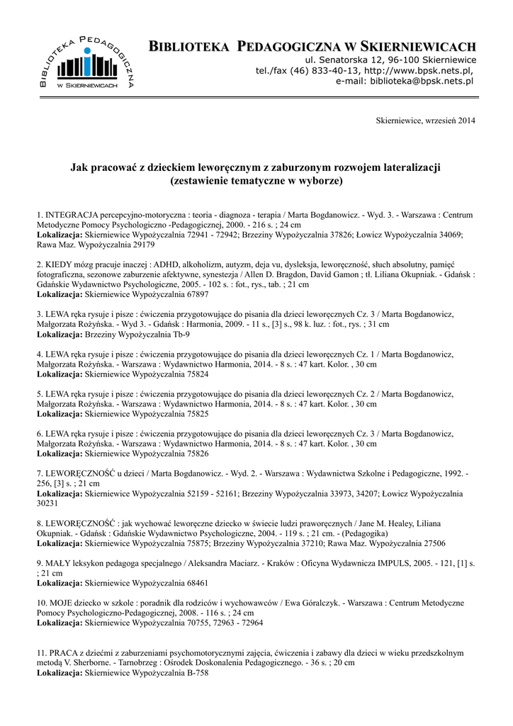 BIBLIOTEKA PEDAGOGICZNA W SKIERNIEWICACH ul. Senatorska 12, 96-100 Skierniewice tel./fax (46) 833-40-13, http://www.bpsk.nets.pl, e-mail: [email protected] Skierniewice, wrzesień 2014 Jak pracować z dzieckiem leworęcznym z zaburzonym rozwojem lateralizacji (zestawienie tematyczne w wyborze) 1. INTEGRACJA percepcyjno-motoryczna : teoria - diagnoza - terapia / Marta Bogdanowicz. - Wyd. 3. - Warszawa : Centrum Metodyczne Pomocy Psychologiczno -Pedagogicznej, 2000. - 216 s. ; 24 cm Lokalizacja: Skierniewice Wypożyczalnia 72941 - 72942; Brzeziny Wypożyczalnia 37826; Łowicz Wypożyczalnia 34069; Rawa Maz. Wypożyczalnia 29179 2. KIEDY mózg pracuje inaczej : ADHD, alkoholizm, autyzm, deja vu, dysleksja, leworęczność, słuch absolutny, pamięć fotograficzna, sezonowe zaburzenie afektywne, synestezja / Allen D. Bragdon, David Gamon ; tł. Liliana Okupniak. - Gdańsk : Gdańskie Wydawnictwo Psychologiczne, 2005. - 102 s. : fot., rys., tab. ; 21 cm Lokalizacja: Skierniewice Wypożyczalnia 67897 3. LEWA ręka rysuje i pisze : ćwiczenia przygotowujące do pisania dla dzieci leworęcznych Cz. 3 / Marta Bogdanowicz, Małgorzata Rożyńska. - Wyd 3. - Gdańsk : Harmonia, 2009. - 11 s., [3] s., 98 k. luz. : fot., rys. ; 31 cm Lokalizacja: Brzeziny Wypożyczalnia Tb-9 4. LEWA ręka rysuje i pisze : ćwiczenia przygotowujące do pisania dla dzieci leworęcznych Cz. 1 / Marta Bogdanowicz, Małgorzata Rożyńska. - Warszawa : Wydawnictwo Harmonia, 2014. - 8 s. : 47 kart. Kolor. , 30 cm Lokalizacja: Skierniewice Wypożyczalnia 75824 5. LEWA ręka rysuje i pisze : ćwiczenia przygotowujące do pisania dla dzieci leworęcznych Cz. 2 / Marta Bogdanowicz, Małgorzata Rożyńska. - Warszawa : Wydawnictwo Harmonia, 2014. - 8 s. : 47 kart. Kolor. , 30 cm Lokalizacja: Skierniewice Wypożyczalnia 75825 6. LEWA ręka rysuje i pisze : ćwiczenia przygotowujące do pisania dla dzieci leworęcznych Cz. 3 / Marta Bogdanowicz, Małgorzata Rożyńska. - Warszawa : Wydawnictwo Harmonia, 2014. - 8 s. : 47 kart. Kolor. , 30 cm Lokalizacja: Skierniewice Wypożyczalnia 75826 7. LEWORĘCZNOŚĆ u dzieci / Marta Bogdanowicz. - Wyd. 2. - Warszawa : Wydawnictwa Szkolne i Pedagogiczne, 1992. 256, [3] s. ; 21 cm Lokalizacja: Skierniewice Wypożyczalnia 52159 - 52161; Brzeziny Wypożyczalnia 33973, 34207; Łowicz Wypożyczalnia 30231 8. LEWORĘCZNOŚĆ : jak wychować leworęczne dziecko w świecie ludzi praworęcznych / Jane M. Healey, Liliana Okupniak. - Gdańsk : Gdańskie Wydawnictwo Psychologiczne, 2004. - 119 s. ; 21 cm. - (Pedagogika) Lokalizacja: Skierniewice Wypożyczalnia 75875; Brzeziny Wypożyczalnia 37210; Rawa Maz. Wypożyczalnia 27506 9. MAŁY leksykon pedagoga specjalnego / Aleksandra Maciarz. - Kraków : Oficyna Wydawnicza IMPULS, 2005. - 121, [1] s. ; 21 cm Lokalizacja: Skierniewice Wypożyczalnia 68461 10. MOJE dziecko w szkole : poradnik dla rodziców i wychowawców / Ewa Góralczyk. - Warszawa : Centrum Metodyczne Pomocy Psychologiczno-Pedagogicznej, 2008. - 116 s. ; 24 cm Lokalizacja: Skierniewice Wypożyczalnia 70755, 72963 - 72964 11. PRACA z dziećmi z zaburzeniami psychomotorycznymi zajęcia, ćwiczenia i zabawy dla dzieci w wieku przedszkolnym metodą V. Sherborne. - Tarnobrzeg : Ośrodek Doskonalenia Pedagogicznego. - 36 s. ; 20 cm Lokalizacja: Skierniewice Wypożyczalnia B-758 12. TERAPIA integracji sensorycznej : ćwiczenia usprawniające bazowe układy zmysłowe i korygujące zaburzenia planowania motorycznego / Bożenna Odowska-Szlachcic. - Wyd. 3. - Gdańsk : HARMONIA, 2012. - 42, [1] s. ; 21 cm Lokalizacja: Skierniewice Wypożyczalnia 75876 13. TERAPIA pedagogiczna T. 2, Zagadnienia praktyczne i propozycje zajęć / red. Ewa Małgorzata Skorek. - Kraków : Oficyna Wydawnicza IMPULS, 2010, 2004, 2005 - 178,[1] s.: rys. + CD-ROM ; 24 cm. - Ćwiczenia orientacji przestrzennej / Izabela Olszańska. - S.99-102. - Ćwiczenia utrwalające kierunki / Eugenia Zarzyńska. - S.116-119. - Ćwiczenia wyrabiające odruch równowagi / Renata Hływa. - s. 144-147. - Metoda ruchu rozwijającego. / Danuta Wróbel. - S.22-27. - Muzykoterapia i trening relaksacyjny w pracy z dziećmi / Barbara Milczarek. - S.17-21. - Usprawnianie lateralizacji. / Eugenia Zarzyńska. S.132-135. - Usprawnianie percepcji słuchowej. / Danuta Wróbel. - S.73-74. - Usprawnianie percepcji wzrokowej. / Danuta Wróbel. - S.41-45. - Wybrane zagadnienia z terapii muzycznej / Lidia Kataryńczuk-Mania. - s. 11-16 Lokalizacja: Skierniewice Wypożyczalnia 73836, 67034, 69782 14. TERAPIA pedagogiczna T. 1, Zaburzenia rozwoju psychoruchowego dzieci / red. Ewa Małgorzata Skorek. - Wyd. 2. Kraków : Oficyna Wydawnicza IMPULS, 2007. - 120, [4] s. ; 24 cm Lokalizacja: Skierniewice Wypożyczalnia 73835, 73980 15. ZAJĘCIA korekcyjno-kompensacyjne w szkole / Irena Czajkowska, Kazimierz Herda. - [Wyd. 8]. - Warszawa : Wydawnictwa Szkolne i Pedagogiczne, cop. 1989. - 149, [2] s. ; 24 cm. - (Psychologia, Pedagogika) Lokalizacja: Skierniewice Wypożyczalnia 69585 16. ZAJĘCIA korekcyjno-kompensacyjne w szkole / Irena Czajkowska, Kazimierz Herda. - Wyd. 2 dodruk. - Warszawa : Wydawnictwa Szkolne i Pedagogiczne, 1997. - 232 s. ; 21 cm. - (Psychologia, Pedagogika) Lokalizacja: Łowicz Wypożyczalnia 31093 Artykuły z czasopism 1. Badanie wzorca lateralizacji - dyskusyjność wyników / Zuzanna Zbróg // Nauczanie Początkowe : kształcenie zintegrowane. - 2010/2011, nr 3, s. 93-102 Omówienie sposobów badania kształtowania się asymetrii funkcjonalnej półkul mózgowych u 3-letnich przedszkolaków; przykłady zabaw diagnostycznych. 2. Dojrzałość szkolna a ryzyko dysleksji. (Cz. 2) / Wojciech Brejnak // Życie Szkoły. - 2009, nr 6, s. 40 46 3. Dominacja lewego ucha i jej skutki w procesie uczenia się / Dominika Kamińska // Wychowanie w Przedszkolu. 2012, nr 10, s. 42-44 4. Dziecko leworęczne. Cz. 1 / Urszula Owsza // Remedium. - 2002, nr 7/8. s. 22-23 5. Dziecko leworęczne. Cz. 2 / Urszula Owsza // Remedium. -2002, nr 10, s. 12 6. Dziecko z zabu