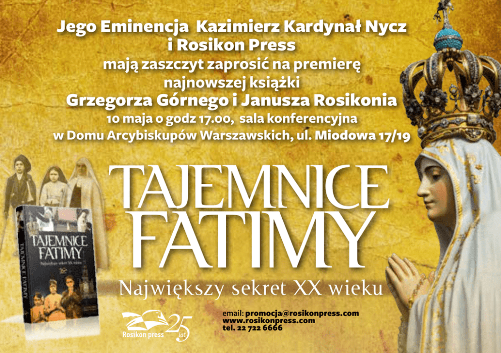 Jego Eminencja Kazimierz Kardynał Nycz i Rosikon Press mają zaszczyt zaprosić na premierę najnowszej książki Grzegorza Górnego i Janusza Rosikonia 10 maja o godz 17.00, sala konferencyjna w Domu Arcybiskupów Warszawskich, ul. Miodowa 17/19 TAJEMNICE FATIMY Największy sekret XX wieku email: [email protected] www.rosikonpress.com tel. 22 722 6666