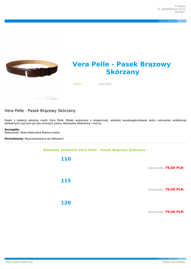 Ti Adoro ul. Jeziołowicza 25/12 Olsztyn Vera Pelle - Pasek Brązowy Skórzany Marka: Vera Pelle Vera Pelle - Pasek Brązowy Skórzany Pasek z kolekcji włoskiej marki Vera Pelle. Model wykonany z eleganckiej, włoskiej wysokogatunkowej skóry naturalnej ozdobionej delikatnymi szyciami po obu stronach paska. Niezwykle efektowny i mocny. Szczegóły: Wykonanie: Skóra Naturalna Klamra-metal Pochodzenie: Wyprodukowano we Włoszech Warianty produktu Vera Pelle - Pasek Brązowy Skórzany : 110 Cena brutto: 79,00 PLN Cena brutto: 79,00 PLN Cena brutto: 79,00 PLN 115 120 http://www.tiadoro.pl sklep internetowy