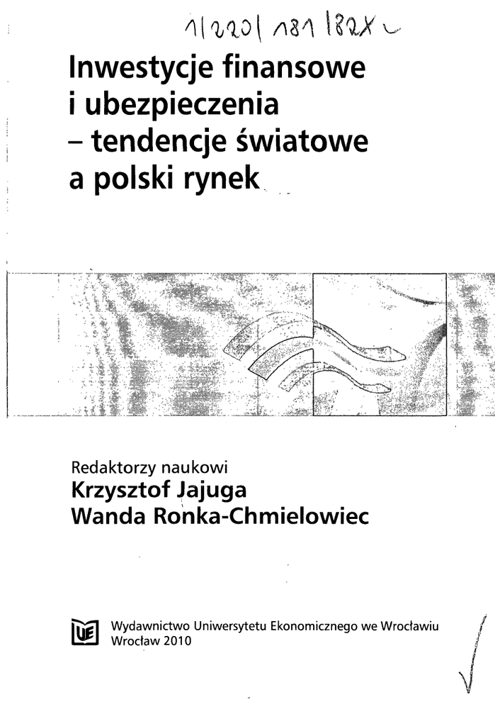 Inwestycje finansowe i ubezpieczenia - tendencje światowe a polski rynek Redaktorzy naukowi Krzysztof Jajuga Wanda Ronka-Chmielowiec Wydawnictwo Uniwersytetu Ekonomicznego we Wrocławiu Wrocław 2010 / Spis treści Wstęp Jan Acedański: Struktura terminowa stóp procentowych w Polsce w świetle modelu DSGE Sławomir Antkiewicz: Fundusze sekurytyzacyjne jako innowacja na polskim rynku powierniczym Jacek Białek: Uwagi o funkcjonujących definicjach przeciętnego zwrotu OFE Janusz Brzeszczyński, Jerzy Gajdka, Tomasz Schabek: Zmienność wartości współczynników beta w czasie na polskim rynku kapitałowym Katarzyna Byrka-Kita: Metodologia badania premii z tytułu kontroli w spółkach publicznych Magdalena Chmielowiec-Lewczuk: Analiza struktury przychodów i kosztów technicznych w polskich zakładach ubezpieczeń z podziałem na grupy ubezpieczeniowe dla lat 2006-2008 Teresa Tatiana Czerwińska: Polityka społecznej odpowiedzialności inwestycji -uwarunkowania i projekcja implementacji na rynku funduszy emerytalnych Dawid Dawidowicz: Rynki funduszy inwestycyjnych w wybranych krajach Europy Środkowo-Wschodniej w latach 2007-2008 Ewa Dziwok: Wykorzystanie procentowych instrumentów pochodnych w polityce pieniężnej banku centralnego do wyodrębniania oczekiwań rynkowych w warunkach wzrostu zmienności na rynkach finansowych .... Urszula Gierałtowska: Czy dywersyfikacja równoległa jest szansą w warunkach kryzysu gospodarczego? Michał Grudziński: Metody porównawcze - studium metodyki stosowanej w rekomendacjach giełdowych Grzegorz Jajuga, Wojciech Mróz: Analiza stóp zwrotu z inwestycji w spółki, w których akcjonariacie funkcjonowały fundusze podwyższonego ryzyka typu venture capitallprivate eąuity Marietta Janowicz-Lomott, Krzysztof Łyskawa: Realizacja umów ubezpieczenia dla podmiotów sektora finansów publicznych Paweł Kliber: Współzależność gwałtownych zmian kursów walut w Europie Środkowej Krzysztof Kontek: Funkcja względnej użyteczności a stosunek do ryzyka .. Julia Koralun-Bereźnicka: Specyfika kraju i sektora jako czynniki kształtujące rentowność przedsiębiorstw w wybranych krajach Unii Europejskiej 11 13 24 34 44 58 68 75 85 95 103 114 121 130 139 149 158 6 Spis treści Mieczysław Kowerski: Zmiany skłonności do płacenia dywidend spółek notowanych na Giełdzie Papierów Wartościowych w Warszawie Grażyna Kozuń-Cieślak: Polska, Czechy i Węgry na tle pozostałych emerging markets - dokąd płyną bezpośrednie inwestycje zagraniczne? Adam Kucharski: Wybór metody estymacji w badaniu szerokości rynku za pomocą wskaźnika Pastora-Stambaugha Anna Kufel-Siemińska: Bariery rozwoju assurfinance w Polsce Robert Kurek: Ocena działalności zakładów ubezpieczeń - przesłanki sprawowania nadzoru Marzanna Lament: Wycena lokat zakładu ubezpieczeń jako element ryzyka operacyjnego Malwina Lemkowska: Ekonomiczne podstawy zarządzania przez wartość w towarzystwie ubezpieczeń wzajemnych Eryk Łon: Polityka pieniężna i budżetowa a zmiany stóp zwrotu z indeksów giełdowych na przykładzie krajów Grupy Wyszehradzkiej Agnieszka Majewska: Czynniki kształtujące spready w swapach kredytowych Sebastian Majewski: Obciążenia poznawcze w procesie korzystania z zależności na rynkach papierów wartościowych Aleksandra Malek: Transfer ryzyka ubezpieczeniowego towarzystw na ży- •, cie na rynek kapitałowy Edyta Marcinkiewicz, Dorota Witkowska, Krzysztof Kompa: O niektórych warunkach stosowalności strategii inwestycyjnych - rynek indeksowych kontraktów futures na GPW w Warszawie Lesław Markowski: Asymetryczne miary ryzyka w wycenie aktywów kapitałowych na GPW w Warszawie Artur Mikulec: Nieklasyczne metody oceny wyników inwestycyjnych na przykładzie Otwartych Funduszy Emerytalnych Tomasz Miziołek: Wpływ kryzysu finansowego na wielkość i strukturę oszczędności finansowych gospodarstw domowych wPolsce Viera Pacakova: Pareto distribution in non-proportional reinsurance Monika Papież, Sławomir Śmiech: Klasyfikacja OFE z wykorzystaniem dystansu GARCH Anna Piechaczek: Istota i znaczenie „efektu śmierci" na rynku sztuki Radosław Pietrzyk, Bartłomiej Knichnicki: Alternatywny system obrotu akcjami w Polsce na tle innych rynków europejskich Tomasz Pisula: Prognozowanie zagrożenia bankructwem dla spółek giełdowych z sektora budowlanego Paweł Porcenaluk: Globalny efekt dyspozycji na przykładzie rynku opcji indeksowych Bogusław Półtorak: Przesłanki sekurytyzacji portfeli kredytów hipotecznych banków uniwersalnych 168 179 189 198 207 216 226 235 243 254 265 276 286 297 307 316 323 331 340 351 361 367 Spis treści Juliusz Preś: Wybrane metody oceny ofert zabezpieczenia finansowego, częściowo lub całkowicie opartego na indeksach pogody Marcin Salamaga: Statystyczna analiza struktury nakładów inwestycyjnych w Polsce w ujęciu regionalnym Anna Sroczyńska-Baron: Analiza przejęć spółek giełdowych w ujęciu teorii gier Anna Szelągowska: W poszukiwaniu skutecznego systemu finansowania społecznego budownictwa mieszkaniowego ....„ Anna Szymańska: Szacowanie stawek składki w ubezpieczeniach komunikacyjnych OC dla asymetrycznego rozkładu wielkości szkód Sławomir Śmiech: Dynamiczna ocena efektywności portfeli wybranych funduszy inwestycyjnych Grażyna Trzpiot, Przemysław Jeziorski: Implementacja modeli CaYiaR z wykorzystaniem rolowanej regresj i kwantylowej Jacek Welc: Wpływ stopnia dywersyfikacji na ryzyko portfela akcji na przykładzie wybranych strategii kontrariańskich Ryszard Węgrzyn: Analiza operacji arbitrażowych w zakresie opcji naWIG20 Ewa Widz: Zmiany na rynku funduszy inwestycyjnych w Polsce w okresie kryzysu na rynkach finansowych w latach 2007-2009 Stanisław Wieteska: Metody oceny ryzyka suszy w ubezpieczeniach upraw rolnych w polskim obszarze klimatycznym Dariusz Zarzecki: Szacowanie kosztu kapitału metodą składania Monika Zielińska-Sitkiewicz: Sytuacja na rynku nieruchomości na podst
