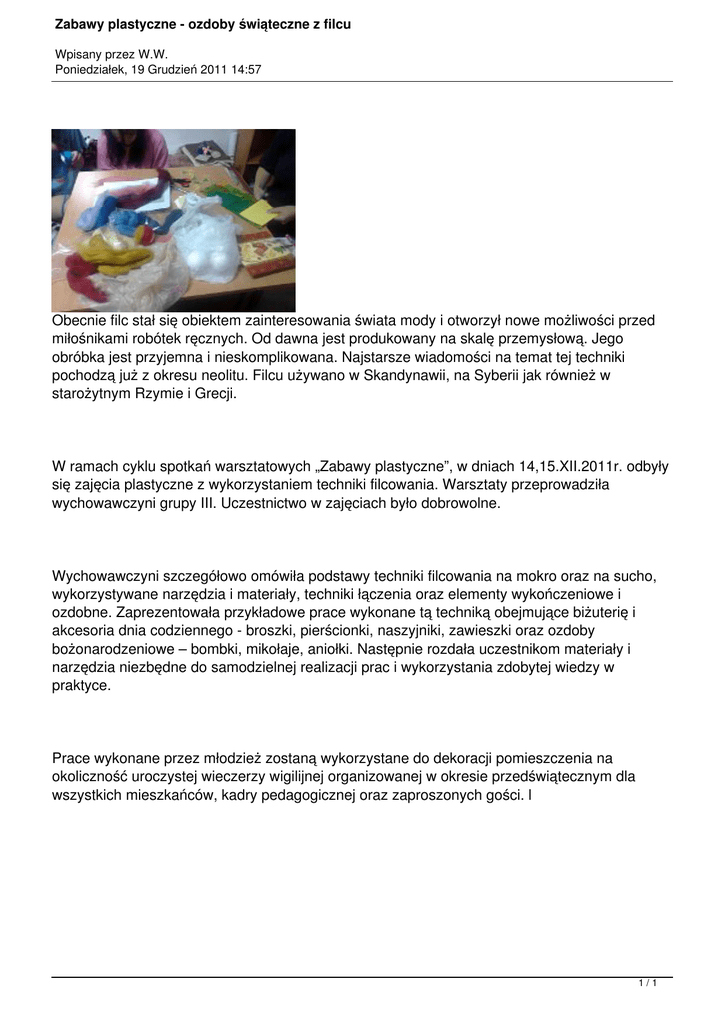 Zabawy plastyczne - ozdoby świąteczne z filcu Wpisany przez W.W. Poniedziałek, 19 Grudzień 2011 14:57 Obecnie filc stał się obiektem zainteresowania świata mody i otworzył nowe możliwości przed miłośnikami robótek ręcznych. Od dawna jest produkowany na skalę przemysłową. Jego obróbka jest przyjemna i nieskomplikowana. Najstarsze wiadomości na temat tej techniki pochodzą już z okresu neolitu. Filcu używano w Skandynawii, na Syberii jak również w starożytnym Rzymie i Grecji. W ramach cyklu spotkań warsztatowych „Zabawy plastyczne”, w dniach 14,15.XII.2011r. odbyły się zajęcia plastyczne z wykorzystaniem techniki filcowania. Warsztaty przeprowadziła wychowawczyni grupy III. Uczestnictwo w zajęciach było dobrowolne. Wychowawczyni szczegółowo omówiła podstawy techniki filcowania na mokro oraz na sucho, wykorzystywane narzędzia i materiały, techniki łączenia oraz elementy wykończeniowe i ozdobne. Zaprezentowała przykładowe prace wykonane tą techniką obejmujące biżuterię i akcesoria dnia codziennego - broszki, pierścionki, naszyjniki, zawieszki oraz ozdoby bożonarodzeniowe – bombki, mikołaje, aniołki. Następnie rozdała uczestnikom materiały i narzędzia niezbędne do samodzielnej realizacji prac i wykorzystania zdobytej wiedzy w praktyce. Prace wykonane przez młodzież zostaną wykorzystane do dekoracji pomieszczenia na okoliczność uroczystej wieczerzy wigilijnej organizowanej w okresie przedświątecznym dla wszystkich mieszkańców, kadry pedagogicznej oraz zaproszonych gości. l 1/1