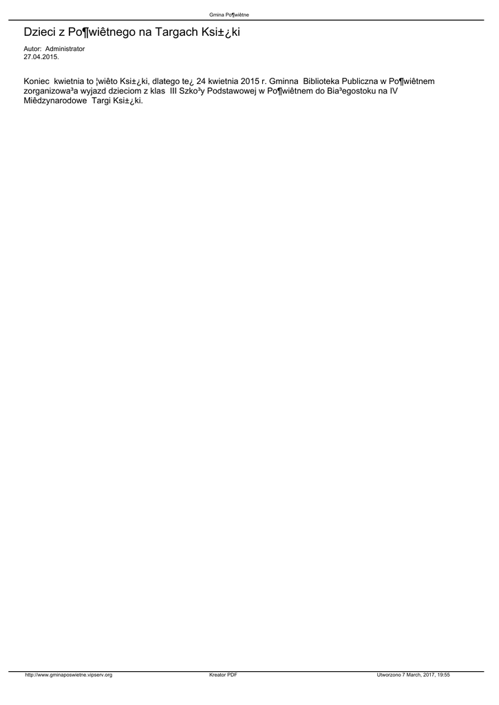Gmina Po¶wiêtne Dzieci z Po¶wiêtnego na Targach Ksi±¿ki Autor: Administrator 27.04.2015. Koniec kwietnia to ¦wiêto Ksi±¿ki, dlatego te¿ 24 kwietnia 2015 r. Gminna Biblioteka Publiczna w Po¶wiêtnem zorganizowa³a wyjazd dzieciom z klas III Szko³y Podstawowej w Po¶wiêtnem do Bia³egostoku na IV Miêdzynarodowe Targi Ksi±¿ki. http://www.gminaposwietne.vipserv.org Kreator PDF Utworzono 7 March, 2017, 19:55