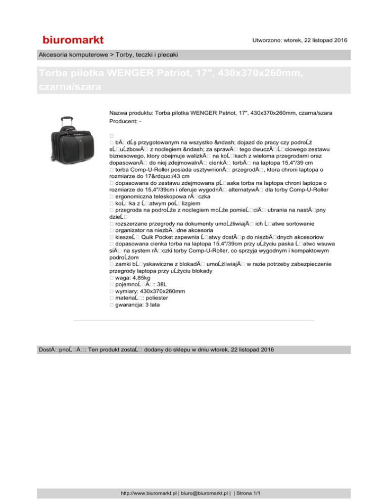 biuromarkt Utworzono: wtorek, 22 listopad 2016 Akcesoria komputerowe > Torby, teczki i plecaki Torba pilotka WENGER Patriot, 17", 430x370x260mm, czarna/szara Nazwa produktu: Torba pilotka WENGER Patriot, 17", 430x370x260mm, czarna/szara Producent: - bÄ dĹş przygotowanym na wszystko – dojazd do pracy czy podroĹź sĹ uĹźbowÄ z noclegiem – za sprawÄ tego dwuczÄ Ĺ ciowego zestawu biznesowego, ktory obejmuje walizkÄ na koĹ kach z wieloma przegrodami oraz dopasowanÄ do niej zdejmowalnÄ cienkÄ torbÄ na laptopa 15,4"/39 cm torba Comp-U-Roller posiada usztywnionÄ przegrodÄ , ktora chroni laptopa o rozmiarze do 17”/43 cm dopasowana do zestawu zdejmowana pĹ aska torba na laptopa chroni laptopa o rozmiarze do 15,4"/39cm i oferuje wygodnÄ alternatywÄ dla torby Comp-U-Roller ergonomiczna teleskopowa rÄ czka koĹ ka z Ĺ atwym poĹ lizgiem przegroda na podroĹźe z noclegiem moĹźe pomieĹ ciÄ ubrania na nastÄ pny dzieĹ rozszerzane przegrody na dokumenty umoĹźliwiajÄ ich Ĺ atwe sortowanie organizator na niezbÄ dne akcesoria kieszeĹ Quik Pocket zapewnia Ĺ atwy dostÄ p do niezbÄ dnych akcesoriow dopasowana cienka torba na laptopa 15,4"/39cm przy uĹźyciu paska Ĺ atwo wsuwa siÄ na system rÄ czki torby Comp-U-Roller, co sprzyja wygodnym i kompaktowym podroĹźom zamki bĹ yskawiczne z blokadÄ umoĹźliwiajÄ w razie potrzeby zabezpieczenie przegrody laptopa przy uĹźyciu blokady waga: 4,85kg pojemnoĹ Ä : 38L wymiary: 430x370x260mm materiaĹ : poliester gwarancja: 3 lata DostÄ pnoĹ Ä : Ten produkt zostaĹ dodany do sklepu w dniu wtorek, 22 listopad 2016 http://www.biuromarkt.pl | [email protected] | | Strona 1/1