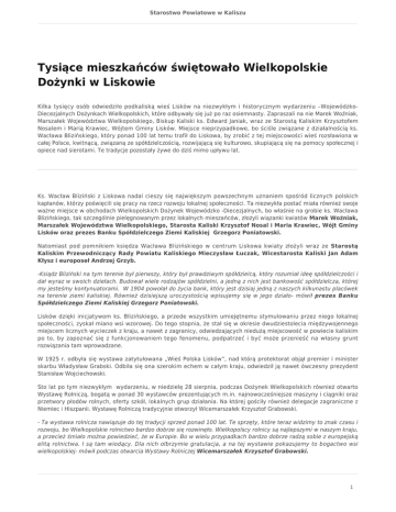 Starostwo Powiatowe w Kaliszu Tysiące mieszkańców świętowało Wielkopolskie Dożynki w Liskowie Kilka tysięcy osób odwiedziło podkaliską wieś Lisków na niezwykłym i historycznym wydarzeniu –WojewódzkoDiecezjalnych Dożynkach Wielkopolskich, które odbywały się już po raz osiemnasty. Zapraszali na nie Marek Woźniak, Marszałek Województwa Wielkopolskiego, Biskup Kaliski ks. Edward Janiak, wraz ze Starostą Kaliskim Krzysztofem Nosalem i Marią Krawiec, Wójtem Gminy Lisków. Miejsce nieprzypadkowe, bo ściśle związane z działalnością ks. Wacława Blizińskiego, który ponad 100 lat temu trafił do Liskowa, by zrobić z tej miejscowości wieś rozsławiona w całej Polsce, kwitnącą, związaną ze spółdzielczością, rozwijającą się kulturowo, skupiającą się na pomocy społecznej i opiece nad sierotami. Te tradycje pozostały żywe do dziś mimo upływu lat. Ks. Wacław Bliziński z Liskowa nadal cieszy się największym powszechnym uznaniem spośród licznych polskich kapłanów, którzy poświęcili się pracy na rzecz rozwoju lokalnej społeczności. Ta niezwykła postać miała również swoje ważne miejsce w obchodach Wielkopolskich Dożynek Wojewódzko -Diecezjalnych, bo właśnie na grobie ks. Wacława Blizińskiego, tak szczególnie pielęgnowanym przez lokalnych mieszańców, złożyli wiązanki kwiatów Marek Woźniak, Marszałek Województwa Wielkopolskiego, Starosta Kaliski Krzysztof Nosal i Maria Krawiec, Wójt Gminy Lisków oraz prezes Banku Spółdzielczego Ziemi Kaliskiej Grzegorz Poniatowski. Natomiast pod pomnikiem księdza Wacława Blizińskiego w centrum Liskowa kwiaty złożyli wraz ze Starostą Kaliskim Przewodniczący Rady Powiatu Kaliskiego Mieczysław Łuczak, Wicestarosta Kaliski Jan Adam Kłysz i europoseł Andrzej Grzyb. -Ksiądz Bliziński na tym terenie był pierwszy, który był prawdziwym spółdzielcą, który rozumiał ideę spółdzielczości i dał wyraz w swoich dziełach. Budował wiele rodzajów spółdzielni, a jedną z nich jest bankowość spółdzielcza, której my jesteśmy kontynuatorami. W 1904 powołał do życia bank, który jest dzisiaj jedną z naszych kilkunastu placówek na terenie ziemi kaliskiej. Również dzisiejszą uroczystością wpisujemy się w jego działo- mówił prezes Banku Spółdzielczego Ziemi Kaliskiej Grzegorz Poniatowski. Lisków dzięki inicjatywom ks. Blizińskiego, a przede wszystkim umiejętnemu stymulowaniu przez niego lokalnej społeczności, zyskał miano wsi wzorowej. Do tego stopnia, że stał się w okresie dwudziestolecia międzywojennego miejscem licznych wycieczek z kraju, a nawet z zagranicy, odwiedzających niedużą miejscowość w powiecie kaliskim po to, by zapoznać się z funkcjonowaniem tego fenomenu, podpatrzeć i być może przenieść na własny grunt rozwiązania tam wprowadzane. W 1925 r. odbyła się wystawa zatytułowana „Wieś Polska Lisków”, nad którą protektorat objął premier i minister skarbu Władysław Grabski. Odbiła się ona szerokim echem w całym kraju, odwiedził ją nawet ówczesny prezydent Stanisław Wojciechowski. Sto lat po tym niezwykłym wydarzeniu, w niedzielę 28 sierpnia, podczas Dożynek Wielkopolskich również otwarto Wystawę Rolniczą, bogatą w ponad 30 wystawców prezentujących m.in. najnowocześniejsze maszyny i ciągniki oraz przetwory płodów rolnych, oferty szkół, lokalnych grup działania. Na której gościły również delegacje zagraniczne z Niemiec i Hiszpanii. Wystawę Rolniczą tradycyjnie otworzył Wicemarszałek Krzysztof Grabowski. - Ta wystawa rolnicza nawiązuje do tej tradycji sprzed ponad 100 lat. Te sprzęty, które teraz widzimy to znak czasu i rozwoju, bo Wielkopolskie rolnictwo bardzo dobrze się rozwinęło. Wielkopolscy rolnicy są najlepszymi w naszym kraju, a przecież śmiało można powiedzieć, że w Europie. Bo w wielu przypadkach bardzo dobrze radzą sobie z europejską elitą rolnictwa. I są tam wiodący. Dla nich olbrzymie gratulacja, a na tej wystawie pokazujemy to bogactwo wsi wielkopolskiej- mówił podczas otwarcia Wystawy Rolniczej Wicemarszałek Krzysztof Grabowski. 1 Starostwo Powiatowe w Kaliszu -Ksiądz Wacław Bliziński organizował wielkie wystawy i był wielkim wizjonerem, ale pewnie nie śniło mu się, że polscy rolnicy będą jeździli w tych czasach tak dobrymi traktorami, wyposażonymi na poziomie dobrych aut. Dziś dziękujemy Panu Bogu za plony. Trzeba przyznać, że w tym roku współpraca rolników ze stwórcą była bardzo dobra nie było kataklizmów, a zebrane plony były przyzwoite- mówił Starosta Kaliski Krzysztof Nosal. - Wybranie Liskowa na miejsce Dożynek Wojewódzkich jest dla mnie ogromnym wyróżnieniem. Dziękuję za to wicemarszałkowi Krzysztofowi Grabowskiemu. Myślę, że też przyczyniła się do tego, nasza ciężka praca, a historia sprawiła, że właśnie tutaj możemy tego rodzaju wydarzenie zorganizować. Wokół są pola, łąki, lasy i w trakcie tych dożynek można to wszystko podziwiać- mówiła Wójt Gminy Lisków Maria Krawiec. Dożynkowe święto to w polskiej tradycji czas radości i podziękowań: Panu Bogu za plony, a ludziom za trud. -To jednak również czas refleksji nad tym, jak ważna jest ludzka solidarność i współdziałanie – aby było z czego dożynkowy chleb upiec i aby go sprawiedliwie podzielić. I nie ma chyba lepszego miejsca jak Lisków, aby mówić o sile, jaką daje współpraca i umiejętność jednoczenia się wokół wspólnego celu. To przecież tutaj, ponad sto lat temu, pod światłym przewodnictwem księdza Wacława Blizińskiego, wcielono w życie, tak bliskie Wielkopolsce, idee pracy organicznej – w sposób naprawdę imponujący – powiedział Marszałek Wielkopolski Marek Woźniak. Do uczestników i organizatorów regionalnego święta plonów okolicznościowy list skierował Andrzej Duda, Prezydent RP. W tegorocznych dożynkach wzięli udział przedstawiciele administracji rządowej, parlam