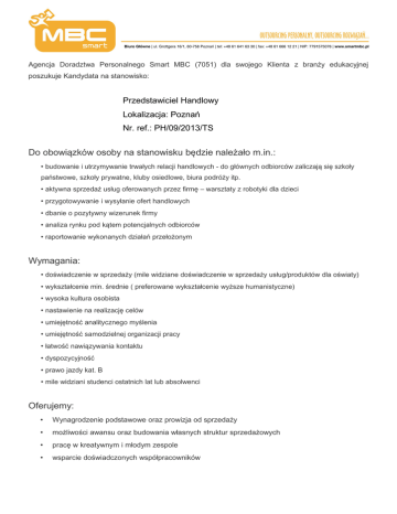 Agencja Doradztwa Personalnego Smart MBC (7051) dla swojego Klienta z branży edukacyjnej poszukuje Kandydata na stanowisko: Przedstawiciel Handlowy Lokalizacja: Poznań Nr. ref.: PH/09/2013/TS Do obowiązków osoby na stanowisku będzie należało m.in.: • budowanie i utrzymywanie trwałych relacji handlowych - do głównych odbiorców zaliczają się szkoły państwowe, szkoły prywatne, kluby osiedlowe, biura podróży itp. • aktywna sprzedaż usług oferowanych przez firmę – warsztaty z robotyki dla dzieci • przygotowywanie i wysyłanie ofert handlowych • dbanie o pozytywny wizerunek firmy • analiza rynku pod kątem potencjalnych odbiorców • raportowanie wykonanych działań przełożonym Wymagania: • doświadczenie w sprzedaży (mile widziane doświadczenie w sprzedaży usług/produktów dla oświaty) • wykształcenie min. średnie ( preferowane wykształcenie wyższe humanistyczne) • wysoka kultura osobista • nastawienie na realizację celów • umiejętność analitycznego myślenia • umiejętność samodzielnej organizacji pracy • łatwość nawiązywania kontaktu • dyspozycyjność • prawo jazdy kat. B • mile widziani studenci ostatnich lat lub absolwenci Oferujemy: • Wynagrodzenie podstawowe oraz prowizja od sprzedaży • możliwości awansu oraz budowania własnych struktur sprzedażowych • pracę w kreatywnym i młodym zespole • wsparcie doświadczonych współpracowników • nowoczesne i rozwojowe środowisko pracy Zainteresowane osoby prosimy o przesłanie dokumentów aplikacyjnych na adres mailowy:[email protected] wraz z uwzględnioną klauzulą o ochronie danych osobowych: "Zgodnie z ustawą z dn. 29.08.97 r. o Ochronie danych Osobowych Dz. Ust. nr 133 poz. 883, wyrażam zgodę na przetwarzanie moich danych osobowych dla potrzeb niezbędnych do realizacji procesu rekrutacji i selekcji." Uprzejmie informujemy, że skontaktujemy się tylko z wybranymi kandydatami.