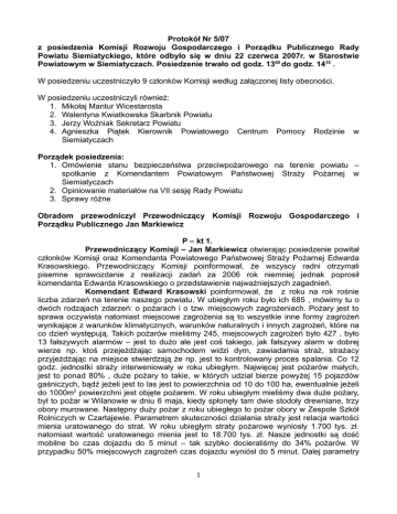 Protokół Nr 5/07 z posiedzenia Komisji Rozwoju Gospodarczego i Porządku Publicznego Rady Powiatu Siemiatyckiego, które odbyło się w dniu 22 czerwca 2007r. w Starostwie Powiatowym w Siemiatyczach. Posiedzenie trwało od godz. 1300 do godz. 1415 . W posiedzeniu uczestniczyło 9 członków Komisji według załączonej listy obecności. W posiedzeniu uczestniczyli również: 1. Mikołaj Mantur Wicestarosta 2. Walentyna Kwiatkowska Skarbnik Powiatu 3. Jerzy Woźniak Sekretarz Powiatu 4. Agnieszka Piątek Kierownik Powiatowego Siemiatyczach Centrum Pomocy Rodzinie w Porządek posiedzenia: 1. Omówienie stanu bezpieczeństwa przeciwpożarowego na terenie powiatu – spotkanie z Komendantem Powiatowym Państwowej Straży Pożarnej w Siemiatyczach 2. Opiniowanie materiałów na VII sesję Rady Powiatu 3. Sprawy różne Obradom przewodniczył Przewodniczący Komisji Rozwoju Gospodarczego i Porządku Publicznego Jan Markiewicz P – kt 1. Przewodniczący Komisji – Jan Markiewicz otwierając posiedzenie powitał członków Komisji oraz Komendanta Powiatowego Państwowej Straży Pożarnej Edwarda Krasowskiego. Przewodniczący Komisji poinformował, że wszyscy radni otrzymali pisemne sprawozdanie z realizacji zadań za 2006 rok niemniej jednak poprosił komendanta Edwarda Krasowskiego o przedstawienie najważniejszych zagadnień. Komendant Edward Krasowski poinformował, że z roku na rok rośnie liczba zdarzeń na terenie naszego powiatu. W ubiegłym roku było ich 685 , mówimy tu o dwóch rodzajach zdarzeń: o pożarach i o tzw. miejscowych zagrożeniach. Pożary jest to sprawa oczywista natomiast miejscowe zagrożenia są to wszystkie inne formy zagrożeń wynikające z warunków klimatycznych, warunków naturalnych i innych zagrożeń, które na co dzień występują. Takich pożarów mieliśmy 245, miejscowych zagrożeń było 427 , było 13 fałszywych alarmów – jest to dużo ale jest coś takiego, jak fałszywy alarm w dobrej wierze np. ktoś przejeżdżając samochodem widzi dym, zawiadamia straż, strażacy przyjeżdżając na miejsce stwierdzają że np. jest to kontrolowany proces spalania. Co 12 godz. jednostki straży interweniowały w roku ubiegłym. Najwięcej jest pożarów małych, jest to ponad 80% , duże pożary to takie, w których udział bierze powyżej 15 pojazdów gaśniczych, bądź jeżeli jest to las jest to powierzchnia od 10 do 100 ha, ewentualnie jeżeli do 1000m2 powierzchni jest objęte pożarem. W roku ubiegłym mieliśmy dwa duże pożary, był to pożar w Wilanowie w dniu 6 maja, kiedy spłonęły tam dwie stodoły drewniane, trzy obory murowane. Następny duży pożar z roku ubiegłego to pożar obory w Zespole Szkół Rolniczych w Czartajewie. Parametrem skuteczności działania straży jest relacja wartości mienia uratowanego do strat. W roku ubiegłym straty pożarowe wyniosły 1.700 tys. zł. natomiast wartość uratowanego mienia jest to 18.700 tys. zł. Nasze jednostki są dość mobilne bo czas dojazdu do 5 minut – tak szybko docieraliśmy do 34% pożarów. W przypadku 50% miejscowych zagrożeń czas dojazdu wyniósł do 5 minut. Dalej parametry 1 te rozkładają się różnie. Do 20 minut jeśli chodzi o pożar - takie były tylko 32 przypadki. Czas dojazdu jest istotny bo parametr czasu dojazdu świadczy o tym, czy ten pożar jest mały, czy ugasimy go w zarodku czy się rozwinie. Duży nacisk kładziemy na pełną dyspozycyjność i gotowość zarówno Państwowej Straży Pożarnej jak i jednostek ochotniczych bo strażacy w ciągu dnia muszą wyjechać w ciągu 45 sekund bez względu na to, czy ćwiczą, czy wykonują zajęcia gospodarcze natomiast w nocy mają czas czynnej reakcji wynoszący 1 minutę - 1,15 minuty. 68 pożarów były to pożary w rolnictwie, lasy – 66 przypadków obiekty mieszkalne – 35, środki transportu – 10 obiekty produkcyjno magazynowe – 9 , obiekty użyteczności publicznej 3 pożary. Najczęstsze przyczyny powstawania pożarów to nieostrożność w posługiwaniu się ogniem przez osoby dorosłe – ponad 100 pożarów , umyślne podpalenia – rok ubiegły to jeszcze ten rok, kiedy w okolicach Homot, Grabarki działała kobieta, która powodowała podpalenia, było ich 25. Jeżeli mówimy o miejscowych zagrożeniach, w jakich interweniowali strażacy były to gwałtowne opady atmosferyczne, interweniujemy tedy, kiedy zagrożone jest mienie znacznej wartości, kotłownia gazowa, olejowa, gdzie zalanie to może spowodować dalsze straty wtórne. Huragany, silne wiatry, wiadomo, strażacy działają tu na polu udrażniania przejazdów. Kolejnym przykładem kiedy wyjeżdżają strażacy jest niebezpieczeństwo stwarzane przez owady. 37 razy w ubiegłym roku strażacy wyjeżdżali – jest to dużo. Akcja taka trochę trwa, bierze w niej udział dwóch strażaków, generuje to koszty. Było również 8 przypadków uwalniania zwierząt. W roku ubiegłym 1 osoba poniosła śmierć w pożarze samochodu w Zalesiu Gmina Nurzec Stacja, 7 osób zginęło w wypadkach drogowych, dane te nie pokrywają się z danymi Policji, ponieważ Policja ma wgląd w stan zdrowia osób, które zostały przewiezione do szpitala. Nasza jednostka ratowniczo – gaśnicza zatrudnia 43 strażaków, dysponujemy jedenastoma samochodami jest to 5 samochodów gaśniczych, 3 samochody specjalne i 3 samochody operacyjne. Ponadto bardzo dużą siłą pomocniczą jest ochotnicza straż pożarna, takich jednostek mamy w powiecie 63 i zakładowa straż pożarna w Adamowie, która również sporadycznie jest dysponowana do działań ale z uwagi na swoje duże samochody jeżeli jest sytuacja że trzeba dowieźć dużą ilość wody wówczas wykorzystujemy te pojazdy. Ochotniczych straży pożarnych jest bardzo dużo niemniej jednak problemem straży ochotniczych jest wiek pojazdów bo mamy 54 samochody OSP ale średnia wieku tych pojazdów to jest 25 – 26 lat i tylko dzięki zaangażowaniu strażaków ochotników, którzy opiekują się tymi sam