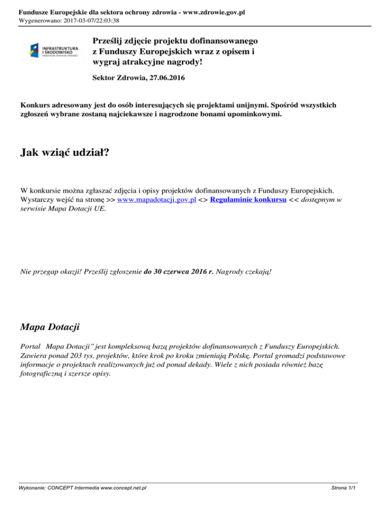 Fundusze Europejskie dla sektora ochrony zdrowia - www.zdrowie.gov.pl Wygenerowano: 2017-03-07/22:03:38 Prześlij zdjęcie projektu dofinansowanego z Funduszy Europejskich wraz z opisem i wygraj atrakcyjne nagrody! Sektor Zdrowia, 27.06.2016 Konkurs adresowany jest do osób interesujących się projektami unijnymi. Spośród wszystkich zgłoszeń wybrane zostaną najciekawsze i nagrodzone bonami upominkowymi. Jak wziąć udział? W konkursie można zgłaszać zdjęcia i opisy projektów dofinansowanych z Funduszy Europejskich. Wystarczy wejść na stronę >> www.mapadotacji.gov.pl <> Regulaminie konkursu << dostępnym w serwisie Mapa Dotacji UE. Nie przegap okazji! Prześlij zgłoszenie do 30 czerwca 2016 r. Nagrody czekają! Mapa Dotacji Portal „Mapa Dotacji” jest kompleksową bazą projektów dofinansowanych z Funduszy Europejskich. Zawiera ponad 203 tys. projektów, które krok po kroku zmieniają Polskę. Portal gromadzi podstawowe informacje o projektach realizowanych już od ponad dekady. Wiele z nich posiada również bazę fotograficzną i szersze opisy. Wykonanie: CONCEPT Intermedia www.concept.net.pl Strona 1/1