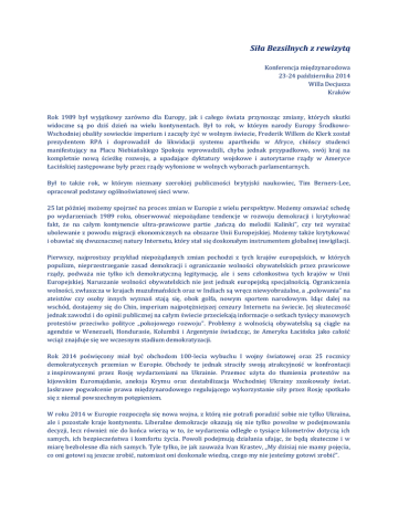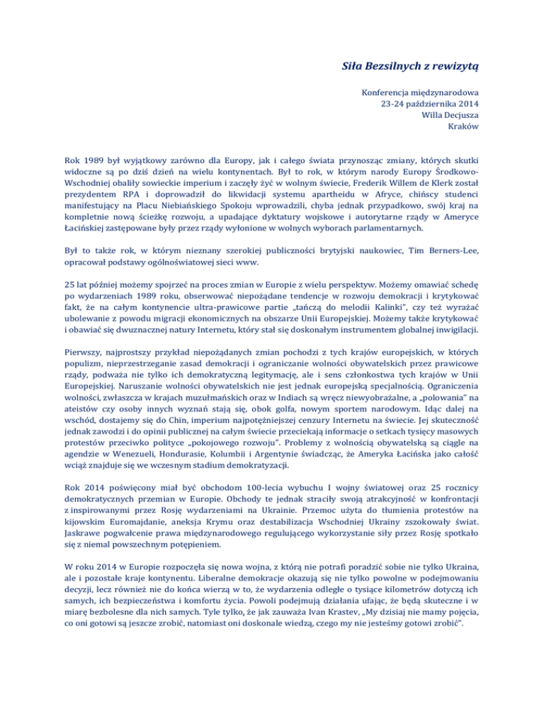Siła Bezsilnych z rewizytą Konferencja międzynarodowa 23-24 października 2014 Willa Decjusza Kraków Rok 1989 był wyjątkowy zarówno dla Europy, jak i całego świata przynosząc zmiany, których skutki widoczne są po dziś dzień na wielu kontynentach. Był to rok, w którym narody Europy ŚrodkowoWschodniej obaliły sowieckie imperium i zaczęły żyć w wolnym świecie, Frederik Willem de Klerk został prezydentem RPA i doprowadził do likwidacji systemu apartheidu w Afryce, chińscy studenci manifestujący na Placu Niebiańskiego Spokoju wprowadzili, chyba jednak przypadkowo, swój kraj na kompletnie nową ścieżkę rozwoju, a upadające dyktatury wojskowe i autorytarne rządy w Ameryce Łacińskiej zastępowane były przez rządy wyłonione w wolnych wyborach parlamentarnych. Był to także rok, w którym nieznany szerokiej publiczności brytyjski naukowiec, Tim Berners-Lee, opracował podstawy ogólnoświatowej sieci www. 25 lat później możemy spojrzeć na proces zmian w Europie z wielu perspektyw. Możemy omawiać schedę po wydarzeniach 1989 roku, obserwować niepożądane tendencje w rozwoju demokracji i krytykować fakt, że na całym kontynencie ultra-prawicowe partie „tańczą do melodii Kalinki”, czy też wyrażać ubolewanie z powodu migracji ekonomicznych na obszarze Unii Europejskiej. Możemy także krytykować i obawiać się dwuznacznej natury Internetu, który stał się doskonałym instrumentem globalnej inwigilacji. Pierwszy, najprostszy przykład niepożądanych zmian pochodzi z tych krajów europejskich, w których populizm, nieprzestrzeganie zasad demokracji i ograniczanie wolności obywatelskich przez prawicowe rządy, podważa nie tylko ich demokratyczną legitymację, ale i sens członkostwa tych krajów w Unii Europejskiej. Naruszanie wolności obywatelskich nie jest jednak europejską specjalnością. Ograniczenia wolności, zwłaszcza w krajach muzułmańskich oraz w Indiach są wręcz niewyobrażalne, a „polowania” na ateistów czy osoby innych wyznań stają się, obok golfa, nowym sportem narodowym. Idąc dalej na wschód, dostajemy się do Chin, imperium najpotężniejszej cenzury Internetu na świecie. Jej skuteczność jednak zawodzi i do opinii publicznej na całym świecie przeciekają informacje o setkach tysięcy masowych protestów przeciwko polityce „pokojowego rozwoju”. Problemy z wolnością obywatelską są ciągle na agendzie w Wenezueli, Hondurasie, Kolumbii i Argentynie świadcząc, że Ameryka Łacińska jako całość wciąż znajduje się we wczesnym stadium demokratyzacji. Rok 2014 poświęcony miał być obchodom 100-lecia wybuchu I wojny światowej oraz 25 rocznicy demokratycznych przemian w Europie. Obchody te jednak straciły swoją atrakcyjność w konfrontacji z inspirowanymi przez Rosję wydarzeniami na Ukrainie. Przemoc użyta do tłumienia protestów na kijowskim Euromajdanie, aneksja Krymu oraz destabilizacja Wschodniej Ukrainy zszokowały świat. Jaskrawe pogwałcenie prawa międzynarodowego regulującego wykorzystanie siły przez Rosję spotkało się z niemal powszechnym potępieniem. W roku 2014 w Europie rozpoczęła się nowa wojna, z którą nie potrafi poradzić sobie nie tylko Ukraina, ale i pozostałe kraje kontynentu. Liberalne demokracje okazują się nie tylko powolne w podejmowaniu decyzji, lecz również nie do końca wierzą w to, że wydarzenia odległe o tysiące kilometrów dotyczą ich samych, ich bezpieczeństwa i komfortu życia. Powoli podejmują działania ufając, że będą skuteczne i w miarę bezbolesne dla nich samych. Tyle tylko, że jak zauważa Ivan Krastev, „My dzisiaj nie mamy pojęcia, co oni gotowi są jeszcze zrobić, natomiast oni doskonale wiedzą, czego my nie jesteśmy gotowi zrobić”. Siła Bezsilnych z rewizytą PROGRAM (wersja robocza, 16 września) czwartek, 23 października 10:00 – 10:15 Powitania 10:15 – 11:00 Wykład otwierający 11:00 – 12:30 Debata: CZASY NIEWINNOŚCI Wspominając Solidarność. Zmiany polityczne w Europie Środkowej w 1989 roku. Wyzwania transformacji. Eksperci: Magda Vášáryová (Słowacja) Jan Lityński (Polska)* Andrei Pleșu (Rumunia) László Rajk (Węgry) Michael Žantovský (Czechy)* Moderator: Krzysztof Bobiński 13:00 – 13:30 Wykład specjalny 13:30 – 15:00 Debata: UTRACONE EKWILIBRUM Koniec post zimnowojennego świata. Anarchizacja stosunków wewnętrznych i międzynarodowych. Obywatele w pułapce mediów. Eksperci: Wolfgang Eichwede (Niemcy) Mauricio Alarcón-Salvador (Ekwador)* Karolina Wigura (Polska) Taras Wozniak (Ukraina) Moderator: Małgorzata Nocuń* 15:00 – 15.30 Otwarcie wystawy fotografii dokumentalnej „Siła” WYDARZENIE SPECJALNE 16:30 – 18:30 XI Gala Wręczenia Polskiej Nagrody Sérgio Vieira de Mello, Wysokiego Komisarza ONZ ds. Praw Człowieka w latach 2002–2003 Z udziałem Kapituły Polskiej Nagrody Sérgio Vieira de Mello*: J.E. Jorge Geraldo Kadri, Ambasador Federacyjnej Republiki Brazylii w Polsce, J.E. Staffan Herrström, Ambasador Królestwa Szwecji w Polsce, Krystyna Żurek, Dyrektor Departamentu Narodów Zjednoczonych i Praw Człowieka MSZ, Anna-Carin Öst, Przedstawiciel Wysokiego Komisarza NZ ds. Uchodźców, Łukasz Kamiński, Prezes Instytutu Pamięci Narodowej, Irena Lipowicz, Rzecznik Praw Obywatelskich, Ellen Germain, Konsul Generalna Stanów Zjednoczonych w Krakowie, Wiesław Nowak, Prezes Zarządu ZUE S.A., Jan Pamuła, Prezes Zarządu Kraków Airport, Tomasz Sendyka, Smart Practical Logic sp. z o. o., Jacek Weremczuk, Dyrektor Regionalny PZU. Tłumaczenie symultaniczne: język polski, język angielski Blogi: polski: Marcel Wandas angielski: Ziemowit Jóźwik arabski: Kareem Amer *czekamy na potwierdzenie piątek, 24 października SEMINARIUM EKSPERCKIE Obrady okrągłego stołu: SIŁA 10:00 – 12:30 Ukraina – Europa: Imperatyw bezpieczeństwa. Reżim transformacji i przymus dialogu. Zmuszeni do użycia siły? Wprowadzenia: J.E. Andrij Deszczycia (Ukraina) Charles F. D