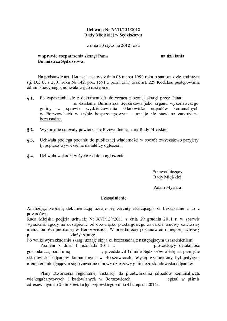 Uchwała Nr XVII/132/2012 Rady Miejskiej w Sędziszowie z dnia 30 stycznia 2012 roku w sprawie rozpatrzenia skargi Pana Mariana Jaskórzyńskiego na działania Burmistrza Sędziszowa. Na podstawie art. 18a ust.1 ustawy z dnia 08 marca 1990 roku o samorządzie gminnym (tj. Dz. U. z 2001 roku Nr 142, poz. 1591 z późn. zm.) oraz art. 229 Kodeksu postępowania administracyjnego, uchwala się co następuje: § 1. Po zapoznaniu się z dokumentacją dotyczącą złożonej skargi przez Pana Mariana Jaskórzyńskiego na działania Burmistrza Sędziszowa jako organu wykonawczego gminy w sprawie wydzierżawienia składowiska odpadów komunalnych w Borszowicach w trybie bezprzetargowym – uznaje się stawiane zarzuty za bezzasadne. § 2. Wykonanie uchwały powierza się Przewodniczącemu Rady Miejskiej. § 3. Uchwała podlega podaniu do publicznej wiadomości w sposób zwyczajowo przyjęty tj. poprzez wywieszenie na tablicy ogłoszeń. § 4. Uchwała wchodzi w życie z dniem ogłoszenia. Przewodniczący Rady Miejskiej Adam Mysiara Uzasadnienie Analizując zebraną dokumentację uznaje się zarzuty skarżącego za bezzasadne a to z powodów: Rada Miejska podjęła uchwałę Nr XVI/129/2011 z dnia 29 grudnia 2011 r. w sprawie wyrażenia zgody na odstąpienie od obowiązku przetargowego zawarcia umowy dzierżawy nieruchomości położonej w Borszowicach. W przedmiocie postanowień niniejszej uchwały p. Marian Jaskórzyński złożył skargę. Po wnikliwym zbadaniu skargi uznaje się ją za bezzasadną z następującym uzasadnieniem: Pismem z dnia 4 listopada 2011 r. Tadeusz Cieślak prowadzący działalność gospodarczą pod firmą PPHU TAMAX, przedstawił Gminie Sędziszów ofertę na przejęcie składowiska odpadów komunalnych w Borszowicach. Wyżej wymieniony był jedynym oferentem ubiegającym się o zawarcie umowy dzierżawy gminnego składowiska odpadów. Plany stworzenia regionalnej instalacji do przetwarzania odpadów komunalnych, wielkogabarytowych i budowlanych w Borszowicach Tadeusz Cieślak opisał w piśmie adresowanym do Gmin Powiatu Jędrzejowskiego z dnia 4 listopada 2011r. Dnia 1 lipca 2011 r. Sejm uchwalił Ustawę o zmianie ustawy o utrzymaniu czystości i porządku w gminach oraz niektórych innych ustaw (Dz.U.11.152.897), która zaczęła obowiązywać od dnia 1 stycznia 2012 r. Istotnym novum tej ustawy było wprowadzenie m. in. regionalnej instalacji do przetwarzania odpadów komunalnych oraz nowych zasad zbierania i przetwarzania odpadów, w wyniku czego doszłoby do likwidacji składowiska w Borszowicach, które miałoby zostać zamknięte lub zakwalifikowane jako zastępcze, zaś odpady dotychczas składowane w Borszowicach miałyby być transportowane do Włoszczowy lub Promnika, które to Gminy zobowiązane są do budowy zakładów przetwarzania. Do dnia 31 grudnia 2011 r. znajdowały zastosowanie zapisy Ustawy o odpadach z dnia 27 kwietnia 2001 r. w brzmieniu ogłoszonym w tekście jednolitym w Dz.U.10.185.1243 ze zm. Gmina Sędziszów jest właścicielem składowiska odpadów komunalnych w Borszowicach prowadzonego dotychczas przez Zakład Usług Komunalnych w Sędziszowie jako jednostkę organizacyjną gminy. Składowisko jest obiektem przeznaczonym do prowadzenia gospodarki odpadami z możliwością jego modernizacji i przebudowy zgodnie z obowiązującymi w tym zakresie standardami. Z uwagi na planowane zmiany regulacji prawnych, w związane z likwidacją składowiska w Borszowicach Gmina podjęła kroki zmierzające do efektywnego zagospodarowania nieruchomości. W listopadzie 2011 r. Gmina Sędziszów zleciła rzeczoznawcy majątkowemu posiadającemu stosowne uprawnienia opracowanie operatu w sprawie ustalenia czynszu za dzierżawę składowiska odpadów w Borszowicach. Jak wynika z przedmiotowej opinii miesięczną stawkę czynszu za 1 ha gruntu w Borszowicach oszacowano na kwotę 1091 zł netto, co biorąc pod uwagę powierzchnię składowiska (2,31 ha) daje miesięczny czynsz dzierżawny w kwocie 2520 zł netto. Wystąpiono również o stosowną opinię do prawnika, celem ustalenia, czy w świetle obowiązujących regulacji prawnych dzierżawa składowiska jest możliwa, a jeśli tak to na jakich zasadach. Zarządzeniem Burmistrza Sędziszowa z dnia 1 grudnia 2011 r. nr 148/2011 w sprawie sporządzenia wykazu nieruchomości przeznaczonej do wydzierżawienia ogłoszono o planach wydzierżawienia nieruchomości w Borszowicach, zaś Zarządzeniem nr 147/2011 w sprawie określenia wysokości opłaty z tytułu dzierżawy nieruchomości położonej w Borszowicach oznaczonej numerami działek 83/3. 84/6, 84/9, 85/4, 86/4 i 86/7 ogłoszono, iż czynsz dzierżawny nie może być niższy niż 2500 zł netto miesięcznie. Zarządzenia zostały w sposób prawidłowy opublikowane. I tak zarządzenia zostały wywieszone na tablicy ogłoszeń urzędowych w Urzędzie Miejskim w Sędziszowie, a także opublikowane na stronie internetowej Urzędu Miejskiego w Sędziszowie, w Biuletynie Informacji Publicznej Urzędu Miejskiego w Sędziszowie oraz w Gazecie Jędrzejowskiej. Spełniony więc został wymóg jawności w zakresie gospodarowania nieruchomościami stanowiącymi własność Skarbu Państwa i jednostek samorządu terytorialnego określony w art. 35 ust. 1 Ustawy o gospodarce nieruchomościami z dnia 21 sierpnia 1997 r. (Dz.U.10.102.651 ze zm.; dalej ugn) Na podstawie art. 15 ust 1 oraz art. 18 ust 2 Ustawy o samorządzie gminnym z dnia 8 marca 1990 r. (Dz.U.01.142.1591 ze zm.) Rada Miejska w Sędziszowie w dniu 27 czerwca 2008 r. podjęła uchwałę nr XX/212/2008 w sprawie zasad nabywania, zbywania i obciążania nieruchomości oraz ich wydzierżawiania lub wynajmowania na czas nieoznaczony, oznaczony dłuższy niż 3 lata oraz w przypadku, gdy po umowie zawartej na czas oznaczony do 3 lat strony zawierają kolejne umowy, których przedmiotem jest ta sama nieruchomość. Warunki zbywania nieruchomości stanowiących własność Skarbu Państwa i jednostek samorządu te