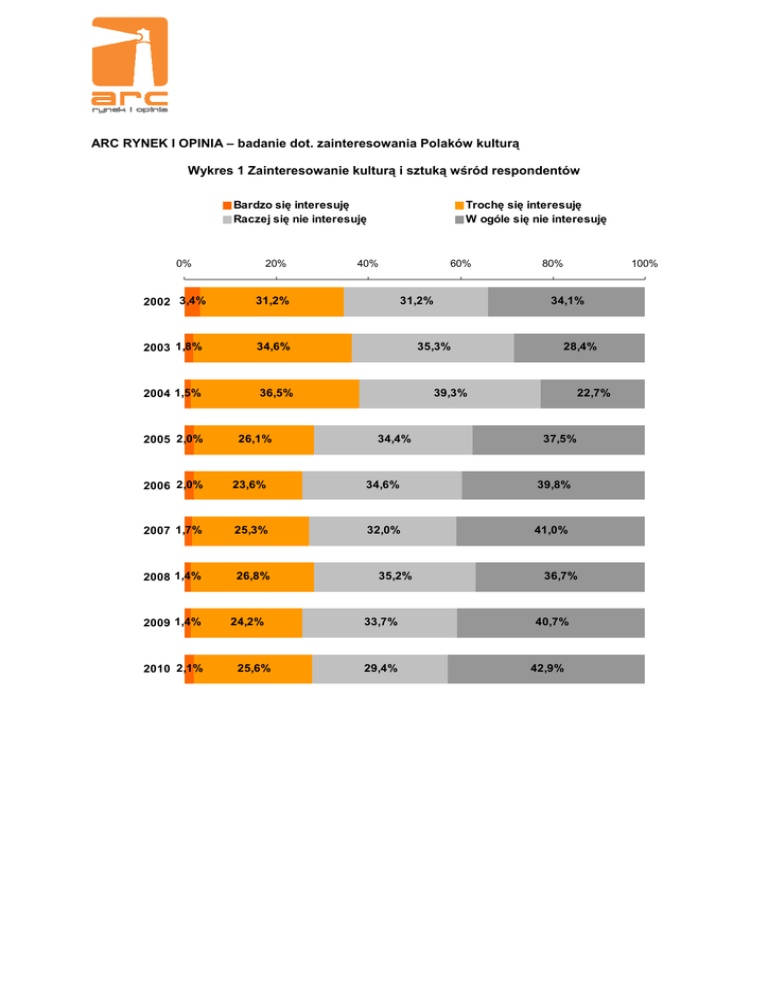 ARC RYNEK I OPINIA – badanie dot. zainteresowania Polaków kulturą Wykres 1 Zainteresowanie kulturą i sztuką wśród respondentów Bardzo się interesuję Raczej się nie interesuję 0% 20% 2002 3,4% 31,2% 2003 1,8% 34,6% 2004 1,5% 36,5% 2005 2,0% 26,1% Trochę się interesuję W ogóle się nie interesuję 40% 60% 31,2% 80% 100% 34,1% 35,3% 28,4% 39,3% 34,4% 22,7% 37,5% 2006 2,0% 23,6% 34,6% 39,8% 2007 1,7% 25,3% 32,0% 41,0% 2008 1,4% 26,8% 2009 1,4% 2010 2,1% 24,2% 25,6% 35,2% 33,7% 29,4% 36,7% 40,7% 42,9% Wykres 2 Stopień zainteresowania kulturą wyŜszą vs masową 1 - wcale 2 3 0% 4 5 - bardzo 20% W jakim stopniu uwaŜa się Pan/i za osobę zainteresowaną kulturą wyŜszą? 40% 60% 80% 61,5% W jakim stopniu uwaŜa się Pan/i za osobę zainteresowaną rozrywką/ kulturą masową? 39,7% W jakim stopniu jest Pan/i zainteresowany/a poszerzaniem swojej wiedzy z zakresu wydarzeń dotyczących tzw. kultury wyŜszej? 3,7% 11,3% 0,4% 23,1% 27,3% 100% 22,0% 9,1% 1,9% 4,2% 56,1% W jakim stopniu jest Pan/i zainteresowany/a poszerzaniem swojej wiedzy z zakresu wydarzeń rozrywkowych/ kultury masowej? 25,0% 46,7% 13,9% 0,8% 6,4% 18,5% 1,5% 26,9% Wykres 3 Samoocena wiedzy na temat wydarzeń kulturalnych 1-mam bardzo małą wiedzę 0% 2 20% Samoocena wiedzy na temat wydarzeń dotyczących tzw. kultury wyŜszej Samoocena wiedzy na temat wydarzeń rozrywkowych/ kultury masowej 3 4 5-mam bardzo duŜą wiedzę 40% 60% 63,3% 80% 22,5% 100% 12,1% 0,1% 2,0% 45,5% 28,1% 21,2% 4,7% 0,5% Informacje o badaniu: Badanie zostało przeprowadzone metodą bezpośrednich wywiadów kwestionariuszowych wspomaganych komputerowo (CAPI) w 3 falach od maja do grudnia 2010 r. na reprezentatywnej próbie N=1218 mieszkańców Polski w wieku 15-65 lat. ARC Rynek i Opinia juŜ od 19 lat przeprowadza badania marketingowe oraz sondaŜe opinii publicznej i ma stałe miejsce wśród najlepszych instytutów badawczych w Polsce. Dzięki przynaleŜności do największej międzynarodowej sieci zrzeszającej niezaleŜne agencje badawcze – IriS – realizuje projekty badawcze w większości państw europejskich. Instytut ARC Rynek i Opinia posiada certyfikat jakości pracy ankieterów PKJPA, a wszystkie badania są realizowane w zgodzie ze standardami ESOMAR-u. http://www.arc.com.pl/