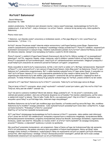 Ko?ció? Salomona! Published on World Challenge (https://worldchallenge.org) Ko?ció? Salomona! David Wilkerson December 19, 1994 Jestem przekonany, ?e Salomon jest obrazem ducha i natury wspó?czesnego, laodycejskiego ko?cio?a dni ostatecznych. A ten ko?ció? - tutaj w Ameryce i na ca?ym ?wiecie - zmierza do tej samej ruiny, która spotka?a Salomona. Pismo mówi nam: "I Salomon, syn Dawida zosta? umocniony w królestwie swoim, a Pan jego Bóg by? z nim i powi?kszy? go niezmiernie..." (2 Kron. 1:1). Ko?ció? Jezusa Chrystusa zosta? obecnie wielce wzmocniony i pob?ogos?awiony przez Boga. Zapewnione zosta?o zaopatrzenie pozwalaj?ce na realizacj? wszelkiego rodzaju przedsi?wzi??. Pomy?l o wielkich, wspania?ych budowlach wznoszonych w naszym kraju. Ostatnio wybudowano pewien du?y ko?ció? zielono?wi?tkowy za cen? 28 milionów dolarów. Istniej? inne kompleksy ko?cielne o warto?ci 40-50 milionów. Pomy?l równie? o wielkich b?ogos?awie?stwach finansowych dla ko?cio?a. Miliony wydaje si? na ewangelizacj? telewizyjn?, ksi??ki, nagrania i kasety, misje, instytucje, szko?y biblijne i parako?cielne us?ugi ka?dego rodzaju. Pomy?l o wszystkich du?ych konferencjach, ciesz?cych si? zainteresowaniem seminariach, religijnym przepychu i przyk?adaj?cych znaczenie do ceremonii ponad-ko?cielnych us?ugach i programach. Kiedy wszystkie te dzie?a by?y rozpoczynane, ka?de z nich mia?o w sobie co? z Bo?ego namaszczenia. Naprawd? wi?kszo?? z nich zaczyna?a si? z tym samym b?ogos?awie?stwem, które Bóg wyla? na Salomona. Pomy?l o tym: Salomon by? znakomicie zorganizowany. By? o wiele bardziej wykszta?cony ni? jego ojciec Dawid. A wszystko co robi? by?o wi?ksze i lepsze ni? to o czym poprzednie pokolenia by?yby nawet w stanie pomy?le?. Zdolno?ci organizacyjne Salomona by?y tak wielkie, jego przepych i ceremonie tak pe?ne splendoru i zapieraj?ce dech w piersiach, ?e kiedy Królowa Saby zobaczy?a go jedynie wchodz?cego do ?wi?tyni, prawie omdla?a na ten widok. Jednak?e si?? nap?dow? Salomona by?a m?dro?? i poznanie. Takie by?o wo?anie jego serca do Boga: "Daj mi teraz m?dro?? i poznanie, abym móg? wychodzi? i wchodzi? przed tym ludem, gdy? kto mo?e s?dzi? ten Twój lud, który jest tak wielki?" (werset 10). Czy? nie jest to cudowna modlitwa? Brzmi tak dobrze i Bogu podoba?o si?, ?e nie prosi? o samolubny zysk. Jednak jest pewien problem: Jest ona ca?kowicie skupiona na cz?owieku! Ten bardzo utalentowany, pe?en wiary w siebie król mówi? w istocie: "Daj mi tylko ?rodki, Bo?e, a ja wykonam prac?. Daj mi m?dro?? i poznanie, a ja wszystko uporz?dkuj? w po?ród tego ludu, dokonam tego wszystkiego!" Modlitwa Salomona nie by?a tak? jak modlitwa jego ojca Dawida, cz?owieka wed?ug serca Bo?ego. Nie, modlitwa Salomona by?a modlitw? nowego pokolenia - ludzi wykszta?conych posiadaj?cych nowe idee i umiej?tno?ci. A jego wo?anie brzmia?o: "Potrzebuj? m?dro?ci i poznania!" Stali?my si? ko?cio?em dyskietki komputerowej! Si?? nap?dow? dzisiejszego laodycejskiego ko?cio?a stanowi m?dro?? i poznanie. Jakie wielkie rzeki informacji p?yn? przez ten ko?ció? dni ostatecznych: komputery wyposa?one w niezliczone megabajty, komputerowe Biblie, skomputeryzowane komentarze, programy komputerowe dotycz?ce filozofii, duchowego doradztwa, organizowania funduszy, opieki nad dzie?mi. Wszystko co musisz zrobi?, to w?o?y? ma?a dyskietk? do swojego komputera, przycisn?? klawisz, a odpowied? wyskoczy ci prosto na spotkanie. Nie wyst?puj? przeciwko komputerom, ani programom. Nasz w?asna us?uga nie funkcjonowa?aby tak sprawnie, b?d?c ich pozbawiona. Ale jestem zdumiony tymi wszystkimi m?odymi kaznodziejami, którzy sp?dzaj? wiele swojego czasu stukaj?c w klawiatury i wykorzystuj?c faksy do wypluwania ca?ych ryz papieru pe?nych informacji, pomys?ów, ofert wspó?pracy i strategii. G?osz? skomputeryzowan? ewangeli?, jednak tak ma?o ludzi zostaje kiedykolwiek zbawionych lub wyzwolonych za ich po?rednictwem! Page 1 of 7 Ko?ció? Salomona! Published on World Challenge (https://worldchallenge.org) Obecnie wyst?puje nienasycony g?ód informacji, m?dro?ci i poznania, taki jak nigdy przedtem. Nigdy nie by?o tak wielu seminariów i rozbudowanych konferencji nauczaj?cych. Potrzebne s? wielkie ekrany tylko po to, aby pokaza? kto jest nauczycielem na oddalonym podium. A potem ludzie t?ocz? si? wokó? stolików s?u??cych do sprzeda?y, aby kupi? kasety o warto?ci setek dolarów. Nacisk jest k?adziony na wi?cej narz?dzi, wi?cej informacji, wi?cej m?dro?ci. My?lenie jest takie: "Je?eli b?dziemy mieli tylko wystarczaj?c? ilo?? wiedzy na te tematy - wystarczaj?co ksi??ek, wyk?adów, czy nauczania - to wykonamy prac?. Bo?e daj nam tylko ?rodki, a my zewangelizujemy ?wiat!" Ostatnio s?ysza?em, jak lider pewnej organizacji m?odzie?owej powiedzia?: "Gdybym tylko mia? 1000 milionów dolarów, to zdoby?bym ?wiat." Podró?owa? on po ca?ym kraju, próbuj?c zebra? t? kwot?. Mówi?: "Je?eli tylko b?dziemy mieli wystarczaj?c? ilo?? pieni?dzy, wiedzy i strategii, mo?emy zewangelizowa? dla Boga ca?y ?wiat!" Umi?owani, nigdy nie osi?gniemy niczego dla Boga dzi?ki samej m?dro?ci, bez wzgl?du na to jak wa?na czy potrzebna by nie by?a. Jego s?owo mówi: "Skoro bowiem ?wiat przez m?dro?? swoj? nie pozna? Boga w jego Bo?ej m?dro?ci, przeto upodoba?o si? Bogu zbawi? wierz?cych przez g?upie zwiastowanie" (1 Kor. 1:21). Wszystkie prawdziwe skarby m?dro?ci i wiedzy s? ukryte w Jezusie Chrystusie - "w którym s? ukryte wszystkie skarby m?dro?ci i poznania" (Kolosan 2:3). Jednak ewangelia Salomona by?a inna. O Salomonie zosta?o powiedziane: "U?o?y? on trzy tysi?ce przypowie?ci i tysi?c pi?? pie?ni. Mówi? on w nich o drzewach, pocz?wszy od cedru, który ro?nie w Libanie, a? do hizopu, który wyrasta z muru; mówi? o zwierz?tach i ptakach, o p?azach i o rybach" (1 Królewska 4:32-33). To by?a ewangelia Salomona - trzy tysi?ce krótkich kaza? pe?nych praktycznej m?dro?ci i wiedzy! Stworzy? nowe pie?ni, wspania?e historie, wielkie opisy prawdy dotycz?cej ludzkiej natury i zachowania. Mo?ecie przec