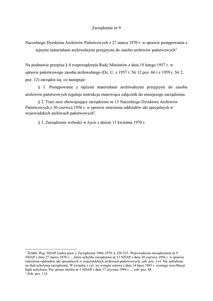 Zarządzenie nr 9 Naczelnego Dyrektora Archiwów Państwowych z 27 marca 1970 r. w sprawie postępowania z tajnymi materiałami archiwalnymi przejętymi do zasobu archiwów państwowych 1 Na podstawie przepisu § 4 rozporządzenia Rady Ministrów z dnia 19 lutego 1957 r. w sprawie państwowego zasobu archiwalnego (Dz. U. z 1957 r. Nr 12 poz. 66 i z 1959 r. Nr 2, poz. 12) zarządza się, co następuje: § 1. Postępowanie z tajnymi materiałami archiwalnymi przejętymi do zasobu archiwów państwowych reguluje instrukcja stanowiąca załącznik do niniejszego zarządzenia. § 2. Traci moc obowiązujące zarządzenie nr 13 Naczelnego Dyrektora Archiwów Państwowych z 30 czerwca 1956 r. w sprawie zniesienia oddziałów akt specjalnych w wojewódzkich archiwach państwowych2. § 3. Zarządzenie wchodzi w życie z dniem 15 kwietnia 1970 r. Źródło: Reg. NDAP (radca praw.), Zarządzenia 1966-1970, k.320-323. Wprowadzona zarządzeniem nr 9 NDAP z dnia 27 marca 1970 r...., które uchyliło zarządzenie nr 13 NDAP z dnia 30 czerwca 1956 r. w sprawie zniesienia oddziałów akt specjalnych w wojewódzkich archiwach państwowych, zob. poz. 114. Nie natrafiono na ślad uchylenia zarządzenia. W związku z cyt. we wstępie ustawą z dnia 14 lipca 1983 r. wymaga weryfikacji bądź uchylenia. Por. pismo okólne nr 1 NDAP z dnia 17 stycznia 1994 r...., zob. poz. 88 2 Zob. poz. 114 1 Załącznik Instrukcja o postępowaniu z tajnymi materiałami archiwalnymi przejętymi do zasobu archiwów państwowych 1. Postanowienia ogólne 1. 1. Tajne materiały archiwalne przejęte do zasobu archwów państwowych, do czasu ich odtajnienia w sposób ustalony w zarządzeniu Nr 6 Naczelnego Dyrektora Archiwów Państwowych z dnia 6 marca 1968 r. w sprawie trybu przekwalifikowania (odtajnienia) materiałów archiwalnych3, przechowuje się w magazynach materiałów tajnych. 1. 2. Magazyny tajnych materiałów archiwalnych tworzy się w centralnych i wojewódzkich archiwach państwowych. Decyzję o utworzeniu magazynu materiałów tajnych w oddziałach terenowych wojewódzkich archiwów państwowych i powiatowych archiwach państwowych podejmuje dyrektor właściwego wojewódzkiego archiwum państwowego, jeżeli w archiwach tych istnieją odpowiednie warunki do ich utworzenia. W przypadku braku takich warunków materiały tajne, przejęte do zasobu archiwów terenowych, przechowuje się w magazynach materiałów tajnych właściwych wojewódzkich archiwów państwowych. 1. 3. Jeżeli ilość tajnych materiałów archiwalnych nie uzasadnia potrzeby utworzenia oddzielnego magazynu, zabezpieczenie tych materiałów można zorganizować w sposób uproszczony (np. w szafach żelaznych), nienaruszający jednak podstawowych zasad w zakresie zabezpieczania tajemnicy państwowej i służbowej. 1. 4. Dyrektor archiwum wyznacza do prowadzenia magazynu tajnych materiałów archiwalnych odpowiedniego pracownika. 1. 5. Do archiwalnego opracowania materiałów tajnych dyrektor archiwum kieruje niezbędną dla tych prac liczbę pracowników. 1. 6. Pracownikowi archiwalnemu należy udostępnić tajne materiały archiwalne tylko w zakresie niezbędnych do wykonania powierzonych mu prac archiwalnych. 1. 7. Dyrektorzy archiwów obowiązani są uzyskać od pracowników, o których mowa w ust. 1.4 i 1.5, pisemne oświadczenia o przyjęciu do wiadomości obowiązujących przepisów o postępowaniu z materiałami tajnymi (wzór w załączeniu). Oświadczenia te przechowuje się w aktach osobowych pracowników. 3 Zob. poz. 152 2. Obowiązek zachowania tajemnicy państwowej i służbowej. 2. 1. Pracownicy dopuszczeni do prac nad tajnymi materiałami archiwalnymi obowiązani są: a) zapoznać się z treścią przepisów niniejszej instrukcji i dekretu z dnia 26 października 1949 r. o ochronie tajemnicy państwowej i służbowej (Dz. U. Nr 55, poz. 437)4. b) podpisać oświadczenie (wzór w załączeniu). 2. 2. Pracownikom dopuszczonym do tajnych materiałów archiwalnych zabrania się: a) informowania pozostałych pracowników archiwum a także innych osób postronnych o treści tych materiałów, b) prowadzenia rozmów na temat informacji zawartych w materiałach tajnych, w obecności osób nie dopuszczonych do materiałów tajnych, c) przekazywania treści materiałów tajnych w sposób niezgodny z przepisami obowiązującymi w tym zakresie, d) pozostawiania materiałów tajnych bez zabezpieczenia. 3. Zabezpieczenie pomieszczeń, przeznaczonych na magazyn materiałów tajnych. 3. 1. Pomieszczenie, w których są przechowywane materiały tajne, powinno być przygotowane pod względem technicznym w sposób dostatecznie zabezpieczający te materiały. 3. 2. Pomieszczenie magazynu materiałów tajnych powinno być w szczególności: a) oddzielone trwałą wewnętrzną ścianą od innych pomieszczeń, b) posiadać drzwi zaopatrzone w dwa odpowiednie zamki i zabezpieczone przez obicie od wewnątrz lub obustronnie, grubą blachą, albo też przez założenie ruchomych krat żelaznych z odpowiednimi zamkami. c) posiadać odpowiednio zabezpieczone okna. 3. 3. Prace remontowe, sprzątanie i opalanie magazynu materiałów tajnych może odbywać się tylko w obecności pracownika odpowiedzialnego za magazyn materiałów tajnych. 3. 4. Po zakończeniu pracy, pomieszczenie magazynu materiałów tajnych zamyka się i pieczętuje. Przechowywanie kluczy oraz pieczętowanie pomieszczeń odbywa się w sposób ustalony przez dyrektora archiwum. Klucze zapasowe od magazynu materiałów tajnych przechowuje dyrektor archiwum. W przypadku zagubienia kluczy, należy niezwłocznie wymienić zamki. 4. Zadania pracownika wyznaczonego do prowadzenia magazynu tajnych materiałów archiwalnych. Obecnie obowiązuje ustawa o ochronie tajemnicy państwowej i służbowej, Dz.U nr 40, poz. 271 z 1982 r. z późniejszymi zmianami. 4 4. 1. Do zadań pracownika wyznaczonego do prowadzenia magazynu materiałów tajnych należy: a) przejmowanie tajnych materiałów archiwalnych z posz