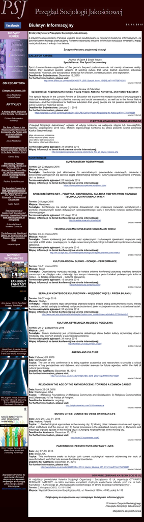 Biuletyn Informacyjny BIEŻĄCY NUMER 21 . 11 .2 0 15 Drodzy Czytelnicy Przeglądu Socjologii Jakościowej, z przyjemnością polecamy Państwa uwadze treści opublikowane w niniejszym biuletynie informacyjnym, za pośrednictwem którego przekazujemy Państwu najbardziej aktualne informacje dotyczące wydarzeń z kręgu nauk jakościowych w kraju i na świecie. Życzymy Państwu przyjemnej lektury! CALLS FOR PAPERS Journal of Sport & Social Issues Special Issue: The Sport Documentary Sport documentaries—regardless of the genre’s frequent pretensions—do not merely showcase reality. Rather, they construct specific versions of sporting culture that serve distinct economic, industrial, institutional, historical, and sociopolitical ends ripe for criticism, contextualization, and exploration. Deadline for Submissions: December 15, 2015 For further information, please visit: http://www.britsoc.co.uk/media/92630/CFP_JSSI_Special_Issue_151215.pdf?1447758745251 OD REDAKTORA Changes in a Human Life Jakub Niedbalski Izabela Ślęzak ARTYKUŁY A History of the Exclusion of the Mentally Handicapped source: Internet London Review of Education Special Issue: Negotiating the Nation. Young People, National Narratives, and History Education This special feature in the London Review of Education will explore the multiple sources of young people’s historical knowledge—through collective memory and social conversation, as well as in the formal history classroom—and the implications for historical education that young people are not passive assimilators but active builders of historical sense. Deadline for Submissions: January 31, 2016 For further information, please visit: https://ioepress.co.uk/ioe-content/uploads/2014/03/LRE-Call-for-Papers-Negotiating-the-Nation.pdf?1447758745251 source: Internet Elżbieta ZakrzewskaManterys The Role of Sport in the Reconstruction Process of the Identity of a Person with an Acquired Body Dysfunction Jakub Niedbalski Professional Biographies of Polish Corporation Workers in the Late Capitalist World Kamila Biały Becoming a Teenage Father. Having a Baby as a Turning Point in Biographies of Young Men of Low Socioeconomic Status Inhabiting Poverty Enclaves Paulina Bunio-Mroczek VI EDYCJA KONKURSU FOTOGRAFICZNEGO „Przegląd Socjologii Jakościowej” ogłasza VI edycję konkursu na najlepsze zdjęcie lub foto-esej/fotoreportaż socjologiczny 2015 roku. Mottem tegorocznego konkursu są słowa piosenki Arahja autorstwa Kazika Staszewskiego: Moja ulica murem podzielona Świeci neonami prawa strona Lewa strona cała wygaszona Zza zasłony obserwuję obie strony Termin nadsyłania zgłoszeń: 31 stycznia 2016 Więcej informacji na temat konkursu na stronie internetowej: http://przegladsocjologiijakosciowej.org/konkurs_foto_pl_edycja_biezaca.php KONFERENCJE SUPERSYSTEMY ROZRYWKOWE Termin: 22‒23 stycznia 2016 Miejsce: Wrocław Tematyka: Konferencja jest skierowana do samodzielnych pracowników naukowych, doktorów i doktorantów zajmujących się szeroko pojętą problematyką literatury i kultury popularnej zarówno w Polsce, jak i na świecie. Termin nadsyłania zgłoszeń: 20 listopada 2015 Więcej informacji na temat konferencji na stronie internetowej: https://supersystemyrozrywkowe.wordpress.com/ The Socialist Project for a New Intelligentsia and Its Limits. Academic Careers in the Polish Postwar University: a Biographical Perspective źródło: Internet SPOŁECZEŃSTWO. NET ‒ POLITYKA, GOSPODARKA, KULTURA POD WPŁYWEM ROZWOJU TECHNOLOGII INFORMACYJNYCH . Termin: 24 lutego 2016 Miejsce: Warszawa Tematyka: Konferencja ma służyć wymianie doświadczeń oraz prezentacji rozważań teoretycznych i wyników prowadzonych badań dotyczących wieloaspektowego stanu i kierunków rozwoju społeczeństwa The Importance of informacyjnego. Subjectively Constructed Meaning: Integration Viewed Termin nadsyłania zgłoszeń: 01 lutego 2016 from the Perspective of Więcej informacji na temat konferencji na stronie internetowej: Agata Zysiak Immigrants http://is.wnhis.uksw.edu.pl/node/496 źródło: Internet Antonella Spanò Markieta Domecka TECHNOLOGICZNO-SPOŁECZNE OBLICZA XXI WIEKU The Influence of Significant Others on the Course of the Process of Leaving Sex Work Izabela Ślęzak Termin: 03‒04 marca 2016 Miejsce: Kraków Tematyka: Celem konferencji jest dyskusja nad społecznymi i kulturowymi zjawiskami, mającymi swój początek w XXI wieku, powstającymi na styku nowoczesnych technologii i działalności społeczno-kulturowej człowieka. Termin nadsyłania zgłoszeń: 31 stycznia 2016 Więcej informacji na temat konferencji na stronie internetowej: http://wh.uci.agh.edu.pl/konferencje/technologiczno-spoleczne-oblicza-xxi-wieku/ NOWOŚCI WYDAWNICZE źródło: Internet KULTURA ROCKA. SŁOWO ‒ DZWIĘK ‒ PERFORMANCE Termin: 10‒11 marca 2016 Miejsce: Toruń Tematyka: Organizatorzy wyrażają nadzieję, że kolejna odsłona konferencji poszerzy wachlarz tematów poruszonych w ubiegłym roku, otwierając tym samym interesujące pola dociekań poświęconych kulturze rocka i – w dalszej perspektywie – kulturze popularnej. Termin nadsyłania zgłoszeń: 15 stycznia 2016 Więcej informacji na temat konferencji na stronie internetowej: https://kulturarocka.wordpress.com/ źródło: Internet SERIALE W KONTEKŚCIE KULTUROWYM – WI(E)DZIEĆ WIĘCEJ. PRÓBA BILANSU Aho James (2015) Far-Right Fantasy. Routledge. Termin: 05‒07 maja 2016 Miejsce: Olsztyn Tematyka: Trzecia odsłona tego serialowego przedsięwzięcia będzie próbą podsumowania stanu wiedzy o serialach, ale też zachętą do refleksji nad przeobrażeniami, jakim może/powinna ulec ta dziedzina badań. Termin nadsyłania zgłoszeń: 31 stycznia 2016 Więcej informacji na temat konferencji na stronie internetowej: http://www.uwm.edu.pl/polonistyka/index.php?option=com_content&view=article&id=2378&Itemid=1 źródło: Internet KULTURA CZYTELNICZA MŁODEGO POKOLENIA Termin: 20‒21 października 2016 Miejsce: 