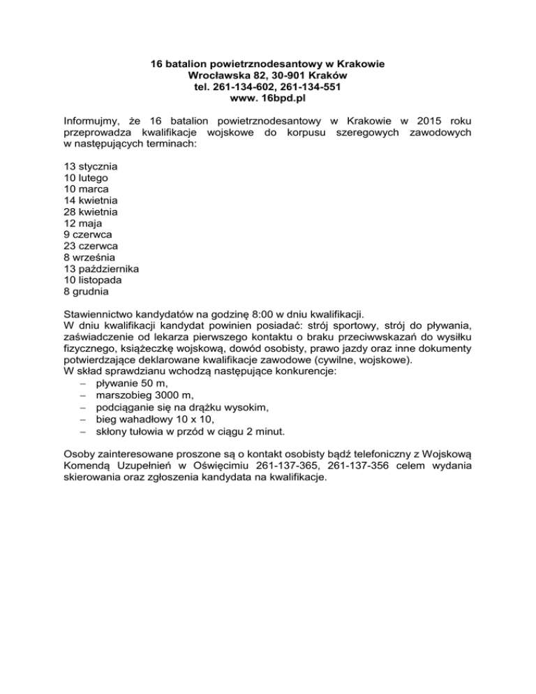 16 batalion powietrznodesantowy w Krakowie Wrocławska 82, 30-901 Kraków tel. 261-134-602, 261-134-551 www. 16bpd.pl Informujmy, że 16 batalion powietrznodesantowy w Krakowie w 2015 roku przeprowadza kwalifikacje wojskowe do korpusu szeregowych zawodowych w następujących terminach: 13 stycznia 10 lutego 10 marca 14 kwietnia 28 kwietnia 12 maja 9 czerwca 23 czerwca 8 września 13 października 10 listopada 8 grudnia Stawiennictwo kandydatów na godzinę 8:00 w dniu kwalifikacji. W dniu kwalifikacji kandydat powinien posiadać: strój sportowy, strój do pływania, zaświadczenie od lekarza pierwszego kontaktu o braku przeciwwskazań do wysiłku fizycznego, książeczkę wojskową, dowód osobisty, prawo jazdy oraz inne dokumenty potwierdzające deklarowane kwalifikacje zawodowe (cywilne, wojskowe). W skład sprawdzianu wchodzą następujące konkurencje: pływanie 50 m, marszobieg 3000 m, podciąganie się na drążku wysokim, bieg wahadłowy 10 x 10, skłony tułowia w przód w ciągu 2 minut. Osoby zainteresowane proszone są o kontakt osobisty bądź telefoniczny z Wojskową Komendą Uzupełnień w Oświęcimiu 261-137-365, 261-137-356 celem wydania skierowania oraz zgłoszenia kandydata na kwalifikacje.