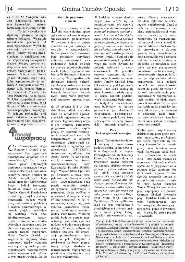 Gmina Tarnow Opolski 14 cd ze str. 13. Kandydaci do... Jest jednocześnie menedżerem, kierownikiem i instruktorem zespołu w jednej osobie. To już wszystkie kandydatury zgłoszone do organizatora konkursu. Wszystkie uzasadnienia pochodzą od osób zgłaszających. Wyniki tej ciekawej, pierwszej edycji Złotej Tarniny zostaną przedstawione w najbliższym czasie. Zapowiadają się ogromne emocje. Pragnę gorąco podziękować tym osobom, które zgłosiły kandydatów – podsumowuje Piotr Koziol. Szczególnie aktywne, czyli takie, które zaproponowały co najmniej 2 kandydatów to: Waldemar Wilk, Joanna Pietruszka, Franciszek Michala, Bożena Piechówka, Anna Patoła. W kilku przypadkach zostały zgłoszone te same osoby. Wójt Krzysztof Mutz z zainteresowaniem przegląda propozycje. W jednym przypadku pięć osób wskazało na konkretną kandydaturę! Czy będą faworytami? Czas pokaże. C zy stowarzyszenia mogą skutecznie działać z samorządem? Czy organizacje pozarządowe dogadają się z administracją? Te i wiele innych pytań dotyczących współpracy samorządu i organizacji społecznych, poruszone zostały w ramach projektu pt. „Model Współpracy”. Jego realizatorem jest Ministerstwo Pracy i Polityki Społecznej. Dotarł on również do Gminy Tarnów Opolski. Przedmiotem działań tego projektu jest wypracowanie modelu współpracy administracji publicznej i sektora pozarządowego. W ramach projektu przewiduje się realizację wielu działań diagnostyczno – badawczych i metodyczno – edukacyjnych, a następnie upowszechnianie i promocja wypracowanego modelu współpracy. Gmina Tarnów Opolski za względu na przyjazny klimat współpracy między jednostką samorządu terytorialnego oraz organizacjami pozarządowymi została zaproszona do udziału w tym przedsięwzięciu. Od 26 Kontrole podatkowe w gminie D o Urzędu Gminy w ostatnim czasie dociera sporo zgłoszeń o rzekomych nieprawidłowościach podatkowych. W związku z tym w gminie sprawdzi się jak sytuacja ta wygląda w rzeczywistości. Każda gmina może stosować inne procedury weryfikacji informacji podawanych przez podatników, jednak opierają się one na podobnych działaniach. Tryb postępowania wobec osób fizycznych i firm jest identyczny. W przypadku osób fizycznych kontrola najczęściej dotyczy rozbieżności w informacji o podstawie opodatkowania budynków mieszkalnych. Tutaj warto przypomnieć podstawę prawną w art. do 27 stycznia 2011 w Urzędzie Gminy odbyło się szkolenie dla urzędników i przedstawicieli organizacji pozarządowych. Jego uczestnicy uczyli się tworzenia partnerstw, programów i modeli współpracy, by zapewnić rozbudowanie w regionach sieci osób kompetentnych w obszarze współpracy administracji samorządowej i organizacji pozarządowych (JST-NGO’s). Budowanie współpracy jest dzisiaj bardzo ważną umiejętnością – mówi Piotr Koziol, wiceprzewodniczący Rady Działalności Pożytku Publicznego Województwa Opolskiego. Zwłaszcza w nowej perspektywie budżetowej w latach 2014 – 2020 realizowane będą przede wszystkim projekty zintegrowane, realizowane z partnerami. Jeżeli myślimy o poważnych dotacjach w najbliższej przyszłości, to już teraz musimy nauczyć się partnerstwa, prawdziwej współpracy i działania w zespole – dodaje Piotr Koziol. W naszej gminie budowa portalu internetowego jest właściwym kierunkiem w budowaniu pełnego dialogu. 22 marca odbyło się kolejne szkolenie dla organizacji pozarządowych, które chcą w pełni korzystać z możliwości platformy internetowej. Kolejne działania w ramach modelu współpracy są przed nami. Obyśmy ten czas owocnie wykorzystali. 1 12 54 kodeksu karnego skarbowego: „kto uchyla się od opodatkowania, nie ujawnia organowi podatkowemu przedmiotu lub podstawy opodatkowania lub nie składa deklaracji, przez co naraża podatek na uszczuplenie, podlega karze grzywny albo karze pozbawienia wolności, albo obu tym karom łącznie” - ostrzega Radca Prawny Urzędu. 14 dni od dnia powstania obowiązku podatkowego ma osoba fizyczna na złożenie informacji o nieruchomościach. Od początku czerwca rozpoczną się kontrole nieruchomości na terenie gminy Tarnów Opolski. Przez kilka miesięcy pod lupą urzędników i nie tylko znajdą się nieruchomości i zakłady pracy. W czasie kontroli podatkowych sprawdzane będą metraże budynków mieszkalnych oraz budynków, w których prowadzona jest działalność gospodarcza. - To kompleksowa kontrola podatkowa, którą sukcesywnie będziemy prowadzić – informują urzędnicy z gminy. Chcemy urzeczywistnić dane zgłaszane w deklaracjach podatkowych. Część z nich się rozbudowuje i niekiedy nieprawidłowości wynikają z niewiedzy, że nowo postawiony na własnym terenie budynek należy zgłosić do urzędu. Metraże obiektów będą sprawdzane z aktualną gminną bazą nieruchomości. Jeśli nieprawidłowość zostanie wykryta w czasie kontroli, w stosunku do mieszkańca wszczęte zostanie postępowanie podatkowe. W trakcie takiego postępowania organ podatkowy, po odpowiednim udokumentowaniu, może naliczyć podatek od nieruchomości nawet do pięciu lat wstecz. Z kontroli prowadzonych przez urzędników w poprzednich latach wynika, że około trzech procent mieszkańców nie zgłasza rozbieżności pomiędzy stanem faktycznym, a podanym w deklaracji. Takie niedopatrzenie właścicieli nieruchomości może jednak uszczuplić zawartość portfeli. Park Spółka poza dotychczasową działalnością, poza pozyskiwaniem inwestorów, profesjonalnie będzie zajmowała się obsługą inwestorów na terenie gminy oraz tematem innowacji. Największa część budżetu przeznaczona w latach 2014 – 2020 będzie właśnie na innowacje. Większość gmin nie będzie na to przygotowana, a poprzez takie działania jest duża szansa, że gmina Tarnów Opolski wyprzedzi innych w pozyskiwaniu pieniędzy – mówi Piotr Koziol, Zastępca Wójta. W najbliższym czasie przy