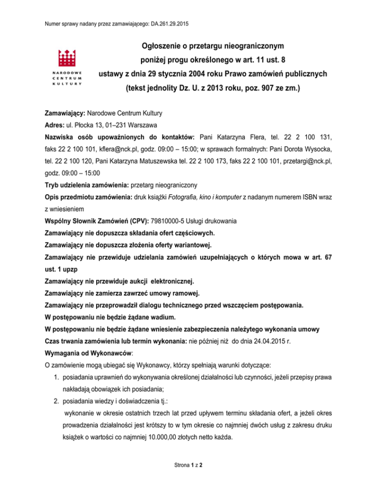 Ogłoszenie o przetargu - druk Fotografia, kino i komputer