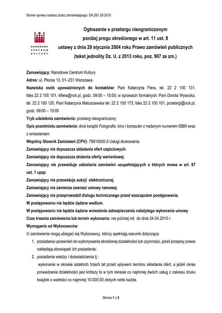 Numer sprawy nadany przez zamawiającego: DA.261.29.2015 Ogłoszenie o przetargu nieograniczonym poniżej progu określonego w art. 11 ust. 8 ustawy z dnia 29 stycznia 2004 roku Prawo zamówień publicznych (tekst jednolity Dz. U. z 2013 roku, poz. 907 ze zm.) Zamawiający: Narodowe Centrum Kultury Adres: ul. Płocka 13, 01–231 Warszawa Nazwiska osób upoważnionych do kontaktów: Pani Katarzyna Flera, tel. 22 2 100 131, faks 22 2 100 101, [email protected], godz. 09:00 – 15:00; w sprawach formalnych: Pani Dorota Wysocka, tel. 22 2 100 120, Pani Katarzyna Matuszewska tel. 22 2 100 173, faks 22 2 100 101, [email protected], godz. 09:00 – 15:00 Tryb udzielenia zamówienia: przetarg nieograniczony Opis przedmiotu zamówienia: druk książki Fotografia, kino i komputer z nadanym numerem ISBN wraz z wniesieniem Wspólny Słownik Zamówień (CPV): 79810000-5 Usługi drukowania Zamawiający nie dopuszcza składania ofert częściowych. Zamawiający nie dopuszcza złożenia oferty wariantowej. Zamawiający nie przewiduje udzielania zamówień uzupełniających o których mowa w art. 67 ust. 1 upzp Zamawiający nie przewiduje aukcji elektronicznej. Zamawiający nie zamierza zawrzeć umowy ramowej. Zamawiający nie przeprowadził dialogu technicznego przed wszczęciem postępowania. W postępowaniu nie będzie żądane wadium. W postępowaniu nie będzie żądane wniesienie zabezpieczenia należytego wykonania umowy Czas trwania zamówienia lub termin wykonania: nie później niż do dnia 24.04.2015 r. Wymagania od Wykonawców: O zamówienie mogą ubiegać się Wykonawcy, którzy spełniają warunki dotyczące: 1. posiadania uprawnień do wykonywania określonej działalności lub czynności, jeżeli przepisy prawa nakładają obowiązek ich posiadania; 2. posiadania wiedzy i doświadczenia tj.: wykonanie w okresie ostatnich trzech lat przed upływem terminu składania ofert, a jeżeli okres prowadzenia działalności jest krótszy to w tym okresie co najmniej dwóch usług z zakresu druku książek o wartości co najmniej 10.000,00 złotych netto każda. Strona 1 z 2 Numer sprawy nadany przez zamawiającego: DA.261.29.2015 3. dysponowania odpowiednim potencjałem technicznym oraz osobami zdolnymi do wykonania zamówienia, 4. sytuacji ekonomicznej i finansowej; Opis sposobu dokonania oceny spełniania warunków udziału w postępowaniu Ocena spełniania warunków udziału w postępowaniu zostanie dokonana na podstawie dokumentów złożonych przez Wykonawcę oraz Oświadczeń stanowiących załączniki do Specyfikacji Istotnych Warunków Zamówienia. Ocena spełniania warunków udziału w postępowaniu zostanie dokonana metodą: spełnia – nie spełnia. Kryteria oceny ofert: A. B. Kryterium Cena za dodruk książki Fotografia, kino i komputer z nadanym numerem ISBN wraz z wniesieniem (cały nakład) Termin realizacji Przedmiotu zamówienia (data) Razem Liczba pkt 90 10 100 Termin i miejsce składania ofert: do godziny 10:00 w dniu 30.03.2014 r., Narodowe Centrum Kultury, ul. Płocka 13, 01–231 Warszawa, recepcja. Termin związania z ofertą: 30 dni, licząc od upływu terminu składania ofert. Określenie sposobu uzyskania specyfikacji istotnych warunków zamówienia oraz adres strony internetowej, na której została zamieszczona Specyfikacja Istotnych Warunków Zamówienia: 1. Specyfikacja Istotnych Warunków Zamówienia jest dostępna w siedzibie Zamawiającego w Narodowym Centrum Kultury 2. Specyfikacja Istotnych Warunków Zamówienia została zamieszczona na stronie internetowej Zamawiającego http://www.nck.pl/kategorie/przetargi.html Data wywieszenia: 20.03.2015 r. Kazimierz Monkiewicz Zastępca Dyrektora Narodowego Centrum Kultury Strona 2 z 2