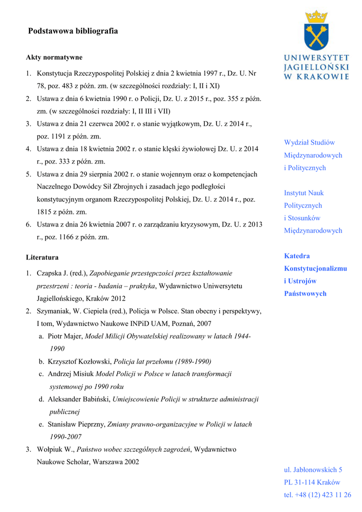 Podstawowa bibliografia Akty normatywne 1. Konstytucja Rzeczypospolitej Polskiej z dnia 2 kwietnia 1997 r., Dz. U. Nr 78, poz. 483 z późn. zm. (w szczególności rozdziały: I, II i XI) 2. Ustawa z dnia 6 kwietnia 1990 r. o Policji, Dz. U. z 2015 r., poz. 355 z późn. zm. (w szczególności rozdziały: I, II III i VII) 3. Ustawa z dnia 21 czerwca 2002 r. o stanie wyjątkowym, Dz. U. z 2014 r., poz. 1191 z późn. zm. 4. Ustawa z dnia 18 kwietnia 2002 r. o stanie klęski żywiołowej Dz. U. z 2014 r., poz. 333 z późn. zm. 5. Ustawa z dnia 29 sierpnia 2002 r. o stanie wojennym oraz o kompetencjach Naczelnego Dowódcy Sił Zbrojnych i zasadach jego podległości konstytucyjnym organom Rzeczypospolitej Polskiej, Dz. U. z 2014 r., poz. 1815 z późn. zm. 6. Ustawa z dnia 26 kwietnia 2007 r. o zarządzaniu kryzysowym, Dz. U. z 2013 r., poz. 1166 z późn. zm. Literatura 1. Czapska J. (red.), Zapobieganie przestępczości przez kształtowanie przestrzeni : teoria - badania – praktyka, Wydawnictwo Uniwersytetu Jagiellońskiego, Kraków 2012 Wydział Studiów Międzynarodowych i Politycznych Instytut Nauk Politycznych i Stosunków Międzynarodowych Katedra Konstytucjonalizmu i Ustrojów Państwowych 2. Szymaniak, W. Ciepiela (red.), Policja w Polsce. Stan obecny i perspektywy, I tom, Wydawnictwo Naukowe INPiD UAM, Poznań, 2007 a. Piotr Majer, Model Milicji Obywatelskiej realizowany w latach 19441990 b. Krzysztof Kozłowski, Policja lat przełomu (1989-1990) c. Andrzej Misiuk Model Policji w Polsce w latach transformacji systemowej po 1990 roku d. Aleksander Babiński, Umiejscowienie Policji w strukturze administracji publicznej e. Stanisław Pieprzny, Zmiany prawno-organizacyjne w Policji w latach 1990-2007 3. Wołpiuk W., Państwo wobec szczególnych zagrożeń, Wydawnictwo Naukowe Scholar, Warszawa 2002 ul. Jabłonowskich 5 PL 31-114 Kraków tel. +48 (12) 423 11 26