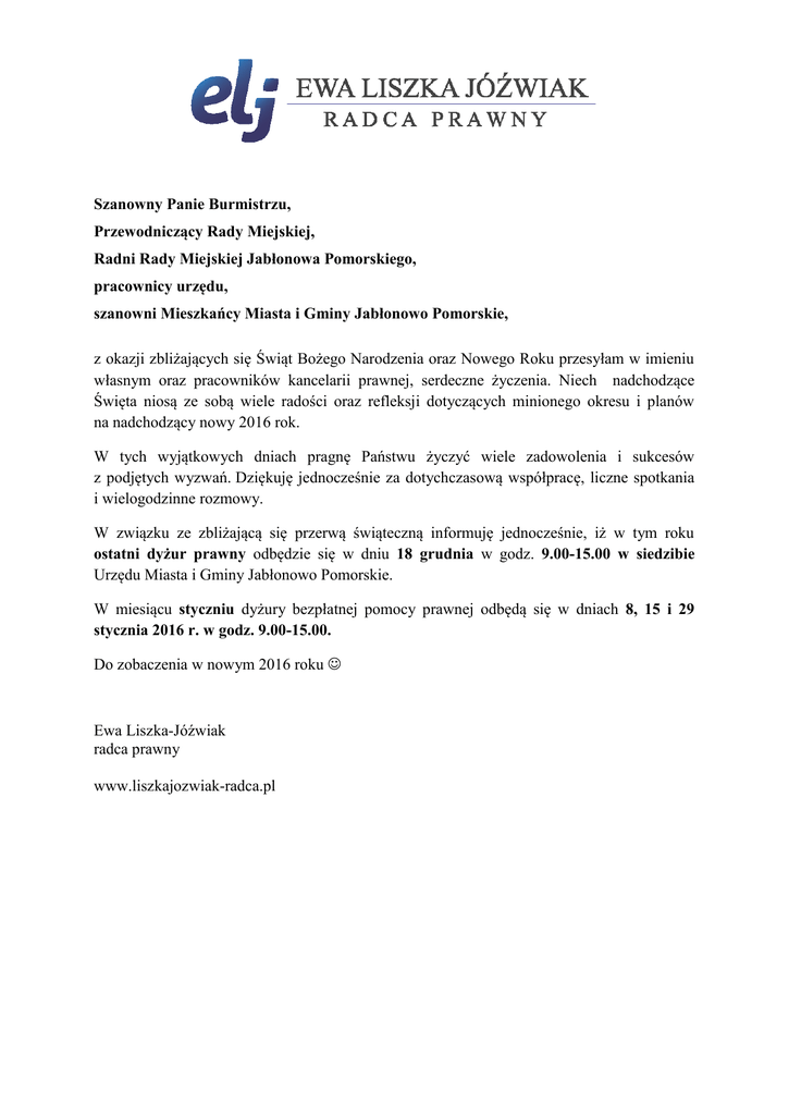 Szanowny Panie Burmistrzu, Przewodniczący Rady Miejskiej, Radni Rady Miejskiej Jabłonowa Pomorskiego, pracownicy urzędu, szanowni Mieszkańcy Miasta i Gminy Jabłonowo Pomorskie, z okazji zbliżających się Świąt Bożego Narodzenia oraz Nowego Roku przesyłam w imieniu własnym oraz pracowników kancelarii prawnej, serdeczne życzenia. Niech nadchodzące Święta niosą ze sobą wiele radości oraz refleksji dotyczących minionego okresu i planów na nadchodzący nowy 2016 rok. W tych wyjątkowych dniach pragnę Państwu życzyć wiele zadowolenia i sukcesów z podjętych wyzwań. Dziękuję jednocześnie za dotychczasową współpracę, liczne spotkania i wielogodzinne rozmowy. W związku ze zbliżającą się przerwą świąteczną informuję jednocześnie, iż w tym roku ostatni dyżur prawny odbędzie się w dniu 18 grudnia w godz. 9.00-15.00 w siedzibie Urzędu Miasta i Gminy Jabłonowo Pomorskie. W miesiącu styczniu dyżury bezpłatnej pomocy prawnej odbędą się w dniach 8, 15 i 29 stycznia 2016 r. w godz. 9.00-15.00. Do zobaczenia w nowym 2016 roku  Ewa Liszka-Jóźwiak radca prawny www.liszkajozwiak-radca.pl