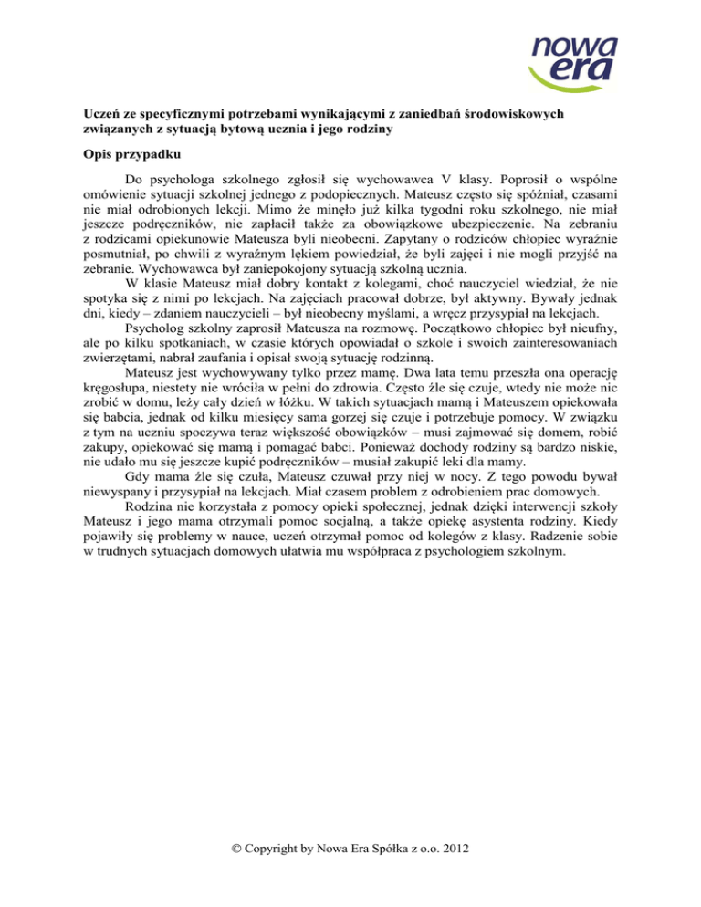 Uczeń ze specyficznymi potrzebami wynikającymi z zaniedbań środowiskowych związanych z sytuacją bytową ucznia i jego rodziny Opis przypadku Do psychologa szkolnego zgłosił się wychowawca V klasy. Poprosił o wspólne omówienie sytuacji szkolnej jednego z podopiecznych. Mateusz często się spóźniał, czasami nie miał odrobionych lekcji. Mimo że minęło już kilka tygodni roku szkolnego, nie miał jeszcze podręczników, nie zapłacił także za obowiązkowe ubezpieczenie. Na zebraniu z rodzicami opiekunowie Mateusza byli nieobecni. Zapytany o rodziców chłopiec wyraźnie posmutniał, po chwili z wyraźnym lękiem powiedział, że byli zajęci i nie mogli przyjść na zebranie. Wychowawca był zaniepokojony sytuacją szkolną ucznia. W klasie Mateusz miał dobry kontakt z kolegami, choć nauczyciel wiedział, że nie spotyka się z nimi po lekcjach. Na zajęciach pracował dobrze, był aktywny. Bywały jednak dni, kiedy – zdaniem nauczycieli – był nieobecny myślami, a wręcz przysypiał na lekcjach. Psycholog szkolny zaprosił Mateusza na rozmowę. Początkowo chłopiec był nieufny, ale po kilku spotkaniach, w czasie których opowiadał o szkole i swoich zainteresowaniach zwierzętami, nabrał zaufania i opisał swoją sytuację rodzinną. Mateusz jest wychowywany tylko przez mamę. Dwa lata temu przeszła ona operację kręgosłupa, niestety nie wróciła w pełni do zdrowia. Często źle się czuje, wtedy nie może nic zrobić w domu, leży cały dzień w łóżku. W takich sytuacjach mamą i Mateuszem opiekowała się babcia, jednak od kilku miesięcy sama gorzej się czuje i potrzebuje pomocy. W związku z tym na uczniu spoczywa teraz większość obowiązków – musi zajmować się domem, robić zakupy, opiekować się mamą i pomagać babci. Ponieważ dochody rodziny są bardzo niskie, nie udało mu się jeszcze kupić podręczników – musiał zakupić leki dla mamy. Gdy mama źle się czuła, Mateusz czuwał przy niej w nocy. Z tego powodu bywał niewyspany i przysypiał na lekcjach. Miał czasem problem z odrobieniem prac domowych. Rodzina nie korzystała z pomocy opieki społecznej, jednak dzięki interwencji szkoły Mateusz i jego mama otrzymali pomoc socjalną, a także opiekę asystenta rodziny. Kiedy pojawiły się problemy w nauce, uczeń otrzymał pomoc od kolegów z klasy. Radzenie sobie w trudnych sytuacjach domowych ułatwia mu współpraca z psychologiem szkolnym. © Copyright by Nowa Era Spółka z o.o. 2012 Karta Indywidualnych Potrzeb Ucznia Imię i nazwisko ucznia Mateusz **** Klasa, do której uczęszcza uczeń V Placówka zakładająca kartę Szkoła Podstawowa w **** Podstawa założenia karty Placówka wystawiająca dokument Data wystawienia dokumentu/nr Obserwacje nauczycieli, poznanie sytuacji rodzinnej ucznia. Brak. Brak. Data założenia karty **** Specjalne potrzeby rozwojowe i edukacyjne, ze względu na które została założona karta Zaniedbania środowiskowe związane z sytuacją bytową ucznia i jego rodziny. Mocne strony ucznia Samodzielność, odpowiedzialność, dobra organizacja, szybkość w nadrabianiu zaległości, łatwość w nawiązywaniu relacji z rówieśnikami i dorosłymi. Zakres, w którym uczeń wymaga pomocy psychologiczno-pedagogicznej z uwagi na indywidualne potrzeby rozwojowe i edukacyjne oraz możliwości psychofizyczne Pomoc socjalna. Wsparcie psychologiczne. Pomoc w uzupełnieniu ewentualnych zaległości w nauce. Formy pomocy Osoby odpowiedzialne za ich realizację Wymiar godzin Okresy udzielania pomocy Konsultacje i spotkania wspierające z psychologiem. Psycholog szkolny. W miarę potrzeb. Cały okres edukacji. Sposoby pomocy Współpraca szkoły z ośrodkiem pomocy społecznej w zakresie udzielania pomocy socjalnej, opieka asystenta rodziny, stypendium socjalne na przybory szkolne. Udzielenie pomocy socjalnej na terenie szkoły – darmowe obiady, dopłaty do szkolnych wyjazdów. Pomoc rówieśników w uzupełnieniu ewentualnych zaległości związanych z nieobecnościami. © Copyright by Nowa Era Spółka z o.o. 2012 Sposoby współpracy z rodzicami Rozmowy i konsultacje na życzenie mamy ucznia. Kto odpowiada za opracowanie PDW? Wychowawca klasy. © Copyright by Nowa Era Spółka z o.o. 2012 Plan Działań Wspierających Imię i nazwisko ucznia Klasa Szkoła Mateusz **** V Szkoła Podstawowa w **** Cele do osiągnięcia w zakresie, w którym uczeń wymaga pomocy psychologiczno-pedagogicznej Cele ogólne Cele szczegółowe Organizacja pomocy socjalnej. Nawiązanie kontaktu z OPS, udzielenie pomocy w formie zasiłku, stypendium szkolnego i darmowych obiadów. Pomoc Mateuszowi w opiece nad mamą. Udzielenie wsparcia psychologicznego. Pomoc w radzeniu sobie z emocjami związanymi z sytuacją rodzinną. Pomoc w uzupełnieniu zaległości w nauce, Pomoc w uzupełnieniu zaległości i poprawieniu umożliwienie uczniowi uzyskania ocen. wyników nauczania odpowiadających jego możliwościom. Działania realizowane z uczniem w ramach poszczególnych form i sposobów udzielania pomocy psychologiczno-pedagogicznej Formy i sposoby Działania Przydzielenie pomocy socjalnej. Zapewnienie środków na utrzymanie rodziny, zakup podręczników. Przydzielenie asystenta rodziny. Pomoc asystenta w prowadzeniu domu i opiece nad mamą ucznia. Pomoc rówieśnicza. Wyznaczenie przez koordynatora ds. wolontariatu z OPS wolontariuszy, którzy będą wspierać ucznia w nauce tych przedmiotów, które sprawiają mu najwięcej trudności. Działania wspierające rodziców ucznia Konsultacje wychowawcy z mamą i asystentem rodziny w miarę potrzeb. Zakres współdziałania z innymi instytucjami Współpraca z ośrodkiem pomocy społecznej. Autor: Anna Tulczyńska © Copyright by Nowa Era Spółka z o.o. 2012