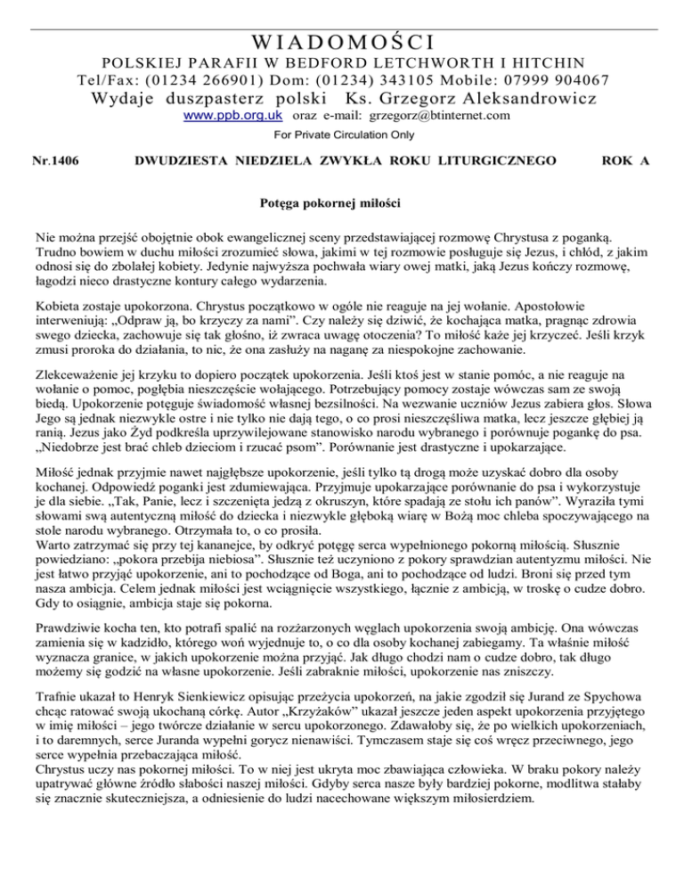 WIADOMOŚCI POLSKIEJ PARAFII W BEDFORD LETCHWORTH I HITCHIN Tel/Fax: (01234 266901) Dom: (01234) 343105 Mobile: 07999 904067 Wydaje duszpasterz polski Ks. Grzegorz Aleksandrowicz www.ppb.org.uk oraz e-mail: [email protected] For Private Circulation Only Nr.1406 DWUDZIESTA NIEDZIELA ZWYKŁA ROKU LITURGICZNEGO ROK A Potęga pokornej miłości Nie można przejść obojętnie obok ewangelicznej sceny przedstawiającej rozmowę Chrystusa z poganką. Trudno bowiem w duchu miłości zrozumieć słowa, jakimi w tej rozmowie posługuje się Jezus, i chłód, z jakim odnosi się do zbolałej kobiety. Jedynie najwyższa pochwała wiary owej matki, jaką Jezus kończy rozmowę, łagodzi nieco drastyczne kontury całego wydarzenia. Kobieta zostaje upokorzona. Chrystus początkowo w ogóle nie reaguje na jej wołanie. Apostołowie interweniują: „Odpraw ją, bo krzyczy za nami”. Czy należy się dziwić, że kochająca matka, pragnąc zdrowia swego dziecka, zachowuje się tak głośno, iż zwraca uwagę otoczenia? To miłość każe jej krzyczeć. Jeśli krzyk zmusi proroka do działania, to nic, że ona zasłuży na naganę za niespokojne zachowanie. Zlekceważenie jej krzyku to dopiero początek upokorzenia. Jeśli ktoś jest w stanie pomóc, a nie reaguje na wołanie o pomoc, pogłębia nieszczęście wołającego. Potrzebujący pomocy zostaje wówczas sam ze swoją biedą. Upokorzenie potęguje świadomość własnej bezsilności. Na wezwanie uczniów Jezus zabiera głos. Słowa Jego są jednak niezwykle ostre i nie tylko nie dają tego, o co prosi nieszczęśliwa matka, lecz jeszcze głębiej ją ranią. Jezus jako Żyd podkreśla uprzywilejowane stanowisko narodu wybranego i porównuje pogankę do psa. „Niedobrze jest brać chleb dzieciom i rzucać psom”. Porównanie jest drastyczne i upokarzające. Miłość jednak przyjmie nawet najgłębsze upokorzenie, jeśli tylko tą drogą może uzyskać dobro dla osoby kochanej. Odpowiedź poganki jest zdumiewająca. Przyjmuje upokarzające porównanie do psa i wykorzystuje je dla siebie. „Tak, Panie, lecz i szczenięta jedzą z okruszyn, które spadają ze stołu ich panów”. Wyraziła tymi słowami swą autentyczną miłość do dziecka i niezwykle głęboką wiarę w Bożą moc chleba spoczywającego na stole narodu wybranego. Otrzymała to, o co prosiła. Warto zatrzymać się przy tej kananejce, by odkryć potęgę serca wypełnionego pokorną miłością. Słusznie powiedziano: „pokora przebija niebiosa”. Słusznie też uczyniono z pokory sprawdzian autentyzmu miłości. Nie jest łatwo przyjąć upokorzenie, ani to pochodzące od Boga, ani to pochodzące od ludzi. Broni się przed tym nasza ambicja. Celem jednak miłości jest wciągnięcie wszystkiego, łącznie z ambicją, w troskę o cudze dobro. Gdy to osiągnie, ambicja staje się pokorna. Prawdziwie kocha ten, kto potrafi spalić na rozżarzonych węglach upokorzenia swoją ambicję. Ona wówczas zamienia się w kadzidło, którego woń wyjednuje to, o co dla osoby kochanej zabiegamy. Ta właśnie miłość wyznacza granice, w jakich upokorzenie można przyjąć. Jak długo chodzi nam o cudze dobro, tak długo możemy się godzić na własne upokorzenie. Jeśli zabraknie miłości, upokorzenie nas zniszczy. Trafnie ukazał to Henryk Sienkiewicz opisując przeżycia upokorzeń, na jakie zgodził się Jurand ze Spychowa chcąc ratować swoją ukochaną córkę. Autor „Krzyżaków” ukazał jeszcze jeden aspekt upokorzenia przyjętego w imię miłości – jego twórcze działanie w sercu upokorzonego. Zdawałoby się, że po wielkich upokorzeniach, i to daremnych, serce Juranda wypełni gorycz nienawiści. Tymczasem staje się coś wręcz przeciwnego, jego serce wypełnia przebaczająca miłość. Chrystus uczy nas pokornej miłości. To w niej jest ukryta moc zbawiająca człowieka. W braku pokory należy upatrywać główne źródło słabości naszej miłości. Gdyby serca nasze były bardziej pokorne, modlitwa stałaby się znacznie skuteczniejsza, a odniesienie do ludzi nacechowane większym miłosierdziem. MSZE ŚWIĘTE I NABOŻEŃSTWA w BEDFORD: Charity Reg.No.1119423 Niedziela, 17.8.2014 DWUDZIESTA NIEDZIELA ZWYKŁA ROKU LITURGICZNEGO Rok A Godz.10.00 - za dusze ś.p. Diego Orsi w rocznicę śmierci - int. żony z rodziną. Godz.19.00 - za dusze ś.p.Bronisława Guzińskiego i szwagra Józefa Szwarc - int. rodziny Poniedziałek, 18.8. Godz. 9.30 - za dusze ś.p. Diego Orsi - int. Pani Anny Nadańskiej. Wtorek, 19.8.2014 Godz. 9.30 - O zdrowie i błog. Boże oraz opiekę Matki Bożej dla Mieczysławy Kromholc. Środa, 20.8.2014 Godz 19.00 - za dusze ś.p. Józefa w rocznicę śmierci. Czwartek,21.8.2014 Godz. 9.30 - O zdrowie i błogosławieństwo Boże dla Heleny - int. rodziny. Piątek, 22.8.2014 Godz.15.00 - za dusze ś.p. Arkadiusza Lolo w 25-tą rocznicę śmierci - int. corki Lidii z rodziną. KORONKA DO MIŁOSIERDZIA BOŻEGO. Sobota, 23.8.2014 Godz. 9.30 - O zdrowie i błog. Boże oraz opiekę Matki Bożej dla Janiny Swerdelean. Godz.19.30 - O zdrowie i błogosławieństwo Boże dla Zbigniewa Sitarz. Niedziela, 24.8.201414 DWUDZIESTA PIERWSZA NIEDZIELA ROKU LITURGICZNEGO Rok A Godz.10.00 - za dusze ś.p. Jadwigi Ulanowskiej w rocznicę śmierci. - O błog.Boże i potrzebne łaski dla Elżbiety Lange z ok.urodzin – int. przyjaciół. Godz.19.00 - O błogosławieństwo Boże i opiekę Matki Bożej dla Wojciecha - int. rodziców. Poniedziałek, 25.8. Godz. 9.30 - za dusze ś.p. Marii Mikołajewskiej w 3-cią rocznicę śmierci - int. córki. Wtorek, 26.8.2014 Godz. 9.30 - UROCZYSTOŚĆ MATKI BOŻEJ CZĘSTOCHOWSKIEJ Godz. 9.30 - za dusze ś.p. Carlo Orsi - int. Pani Danuty Orsi. Środa, 27.8.2014 Godz.19.00 - Intencja pana Janusza Majorek. Czwartek, 28.8.2014 Godz. 9.30 - O zdrowie i błog.Boże i opiekę Matki Bożej dla Maksymiliana Kiedrowskiego Piątek, 29.8 2014 Godz.15.00 - O opiekę Bożą dla Renaty - int. męża. KORONKA DO MIŁOSIERDZIA BOŻEGO. Sobota,
