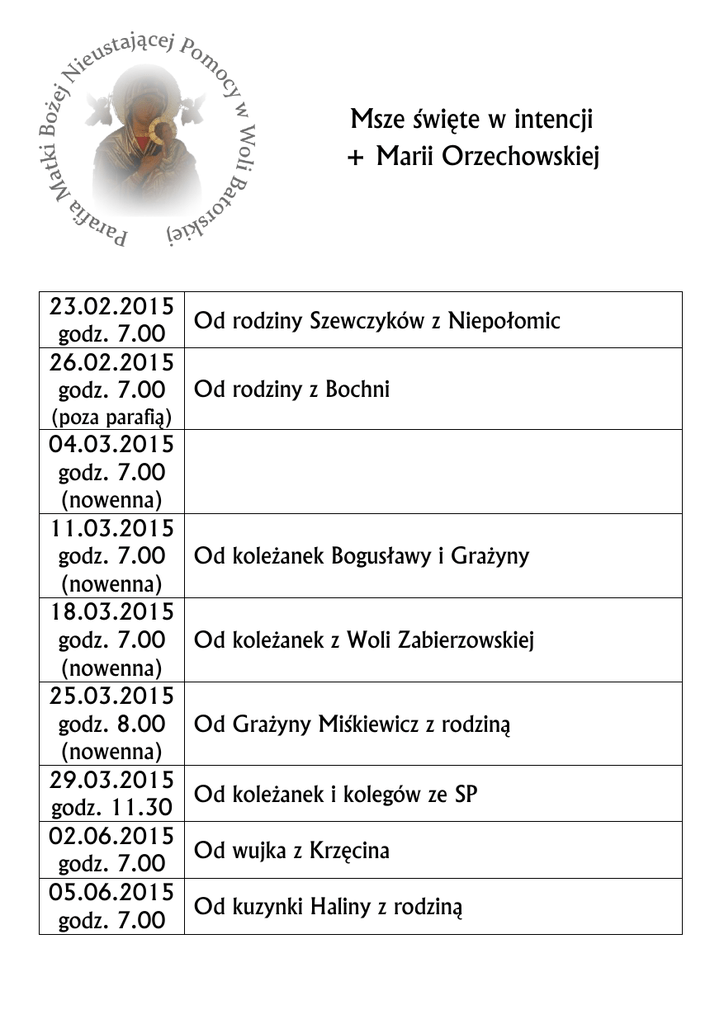 Msze święte w intencji + Marii Orzechowskiej 23.02.2015 Od rodziny Szewczyków z Niepołomic godz. 7.00 26.02.2015 godz. 7.00 Od rodziny z Bochni (poza parafią) 04.03.2015 godz. 7.00 (nowenna) 11.03.2015 godz. 7.00 (nowenna) 18.03.2015 godz. 7.00 (nowenna) 25.03.2015 godz. 8.00 (nowenna) 29.03.2015 godz. 11.30 02.06.2015 godz. 7.00 05.06.2015 godz. 7.00 Od koleżanek Bogusławy i Grażyny Od koleżanek z Woli Zabierzowskiej Od Grażyny Miśkiewicz z rodziną Od koleżanek i kolegów ze SP Od wujka z Krzęcina Od kuzynki Haliny z rodziną 08.06.2015 godz. 7.00 09.06.2015 godz. 7.00 12.06.2015 godz. 18.00 13.06.2015 godz. 7.00 15.06.2015 godz. 7.00 16.06.2015 godz. 7.00 18.06.2015 godz. 7.00 19.06.2015 godz. 18.00 20.06.2015 godz. 7.00 22.06.2015 godz. 7.00 23.06.2015 godz. 7.00 26.06.2015 godz. 7.00 29.06.2015 godz. 7.00 30.06.2015 godz. 7.00 02.07.2015 godz. 7.00 03.07.2015 godz. 7.00 Od kuzynki Kazimiery z rodziną Od Różańskiej i Mazur Od Pani Wykowej i Państwa Gąsłowskich Od rodziny z Kolanowa Od koleżanek i kolegów z GS z Niepołomic Od rodziny Kozubów Od hospicjum dziecięcego w Niepołomicach Od sąsiadów bliższych i dalszych Od rodziny Borkowskich Od rodziny Stankiewiczów Od rodziny Gwizdków Od Hani Marzec z rodziną 06.07.2015 godz. 7.00 07.07.2015 godz. 7.00 09.07.2015 godz. 7.00 17.09.2015 godz. 7.00 27.09.2015 godz. 16.30 04.10.2015 godz. 16.30 11.10.2015 godz. 16.30 07.11.2015 godz. 18.00 28.11.2015 godz. 18.00 Od Krystyny i Edwarda Bielak z rodziną Od Anny Jachymek z Szarowa z rodziną Od Marii Grochot z rodziną + mąż Jan Orzechowski w 15 rocznicę śmierci Od mamy Od brata i siostry Od Grażyny i Krzysztofa Gąsłowskich Od Barbary i Andrzeja Kowal + mąż Jan Wola Batorska 3 32-007 Zab. Bocheński Parafia Matki Bożej Nieustającej Pomocy tel. 12 281 60 02 parafiawolabatorska.pl