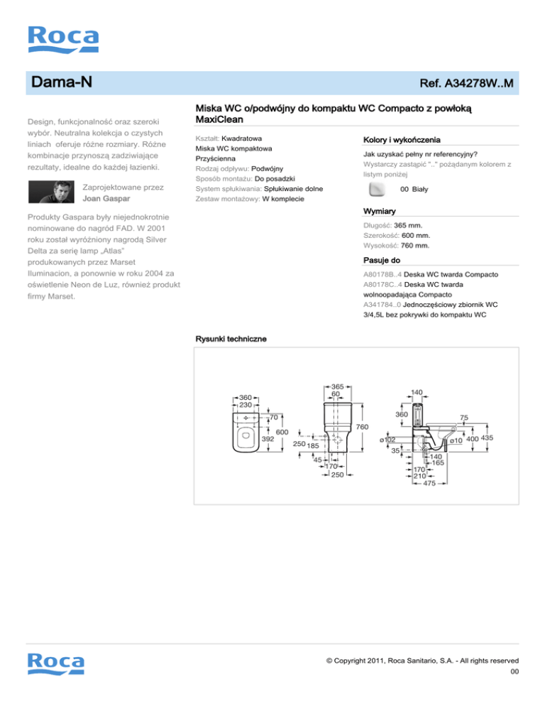 Dama-N Design, funkcjonalność oraz szeroki wybór. Neutralna kolekcja o czystych liniach oferuje różne rozmiary. Różne kombinacje przynoszą zadziwiające rezultaty, idealne do każdej łazienki. Zaprojektowane przez Joan Gaspar Ref. A34278W..M Miska WC o/podwójny do kompaktu WC Compacto z powłoką MaxiClean Kształt: Kwadratowa Miska WC kompaktowa Przyścienna Rodzaj odpływu: Podwójny Sposób montażu: Do posadzki System spłukiwania: Spłukiwanie dolne Zestaw montażowy: W komplecie Kolory i wykończenia Jak uzyskać pełny nr referencyjny? Wystarczy zastąpić ".." pożądanym kolorem z listym poniżej 00 Biały Wymiary Produkty Gaspara były niejednokrotnie nominowane do nagród FAD. W 2001 roku został wyróżniony nagrodą Silver Delta za serię lamp „Atlas” produkowanych przez Marset Iluminacion, a ponownie w roku 2004 za oświetlenie Neon de Luz, również produkt firmy Marset. Długość: 365 mm. Szerokość: 600 mm. Wysokość: 760 mm. Pasuje do A80178B..4 Deska WC twarda Compacto A80178C..4 Deska WC twarda wolnoopadająca Compacto A341784..0 Jednoczęściowy zbiornik WC 3/4,5L bez pokrywki do kompaktu WC Rysunki techniczne 365 60 360 230 140 360 70 392 75 760 600 45 ø10 400 435 ø102 250 185 35 170 250 140 165 170 210 475 © Copyright 2011, Roca Sanitario, S.A. - All rights reserved 00