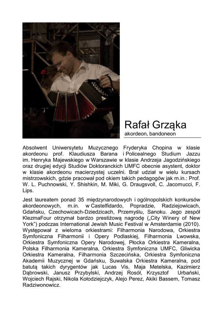 Rafał Grząka akordeon, bandoneon Absolwent Uniwersytetu Muzycznego Fryderyka Chopina w klasie akordeonu prof. Klaudiusza Barana i Policealnego Studium Jazzu im. Henryka Majewskiego w Warszawie w klasie Andrzeja Jagodzińskiego oraz drugiej edycji Studiów Doktoranckich UMFC obecnie asystent, doktor w klasie akordeonu macierzystej uczelni. Brał udział w wielu kursach mistrzowskich, gdzie pracował pod okiem takich pedagogów jak m.in.: Prof. W. L. Puchnowski, Y. Shishkin, M. Miki, G. Draugsvoll, C. Jacomucci, F. Lips. Jest laureatem ponad 35 międzynarodowych i ogólnopolskich konkursów akordeonowych, m.in. w Castelfidardo, Popradzie, Radziejowicach, Gdańsku, Czechowicach-Dziedzicach, Przemyślu, Sanoku. Jego zespół KlezmaFour otrzymał bardzo prestiżową nagrodę („City Winery of New York”) podczas International Jewish Music Festival w Amsterdamie (2010). Występował z wieloma orkiestrami: Filharmonia Narodowa, Orkiestra Symfoniczna Filharmonii i Opery Podlaskiej, Filharmonia Lwowska, Orkiestra Symfoniczna Opery Narodowej, Płocka Orkiestra Kameralna, Polska Filharmonia Kameralna, Orkiestra Symfoniczna UMFC, Gliwicka Orkiestra Kameralna, Filharmonia Szczecińska, Orkiestra Symfoniczna Akademii Muzycznej w Gdańsku, Suwalska Orkiestra Kameralna, pod batutą takich dyrygentów jak Lucas Vis, Maja Metelska, Kazimierz Dąbrowski, Janusz Przybylski, Andrzej Rosół, Krzysztof Urbański, Wojciech Rajski, Nikola Kołodziejczyk, Alejo Perez, Akiki Bassem, Tomasz Radziwonowicz. Od lat uczestniczy w życiu artystycznym i organizacyjnym Stowarzyszenia Akordeonistów Polskich. Jako koordynator merytoryczny zrealizował cztery zamówienia kompozytorskie, swymi koncertami otwiera festiwale i konkursy. Udziela się jako muzyk sesyjny w Polskim Radiu i Telewizji. Koncertował w USA, Canadzie, Francji, Hiszpanii, Wielkiej Brytanii, Holandii, Chinach, Włoszech, Niemczech, Austrii, Czechach, Słowacji, Ukrainie, Białorusi, Rosji, Litwie, Łotwie, Turcji, Arabii Saudyjskiej, Bułgarii, Na swym koncie ma wiele prawykonań polskich kompozytorów, m.in Zofii Dowgiałło, Mikołaja Majkusiaka, Andrzeja Krzanowskiego, Wojciecha Kostrzewy, Piotra Wróbla, Nikoli Kołodziejczyka, Ryszarda Borowskiego, Krzysztofa Lenczowskiego, Zbigniewa Namysłowskiego, Cezarego Paciorak i Krzysztofa Herdzina. W maju 2014 roku ukazała się płyta jednego z jego projektów, kwartetu Cup of Time, pt. Cup of Time plays Namysłowski z gościnnym udziałem Zbigniewa Namysłowskiego, wydawnictwo DUX. Album został wybrany płytą roku w kategorii jazz, przez magazyn HiFi i muzyka. Do najważniejszych osiągnięć koncertowych artysty należą: cykl koncertów z udziałem Yurija Shishkina, trasa koncertowa w USA, udział w prawykonaniu I symfonii Andrzeja Krzanowskiego wraz z Orkiestrą Filharmonii Narodowej w ramach Festiwalu Warszawska Jesień (nagroda za najlepszy koncert danej edycji), występy na festiwalach Bratislavia Malajes i Jezzaldija w San Sebastian, inauguracja Dni Kultury Polskiej w Wiedniu, La four Journee 2013 w Warszawie, Letni Ferstiwal Muzyczny w Harbin (Chiny), Eurocultur Festival w Manchesterze, Hutzpach Festival w Vancouver (Kanada), International Jazz Festiwal Bansko (Bułgaria), przygotowanie i prawykonanie partii akordeonu w operze Thomasa Adesa pt. „Powder Her Face” polska premiera w Operze Narodowej. Ponadto występował w Filharmonii Narodowej, Filharmonii Świętokrzyskiej, Filharmonii Podkarpackiej, Filharmonii Słupskiej, Filharmonii Płockiej, Filharmonii Bydgoskiej, Operze i Filharmonii Podlaskiej, Filharmonii Szczecińskiej, Filharmonii Wrocławskiej, Filharmonii Olsztyńskiej, Filharmonii Pomorskiej, Polskiej Filharmonii Kameralnej, Filharmonii Lwowskiej oraz licznych Ośrodkach Kultury w całym kraju. Jako wykładowca prowadził zajęcia na Międzynarodowym Kursie Interpretacji Muzycznej w Miętnem i Lusławicach.