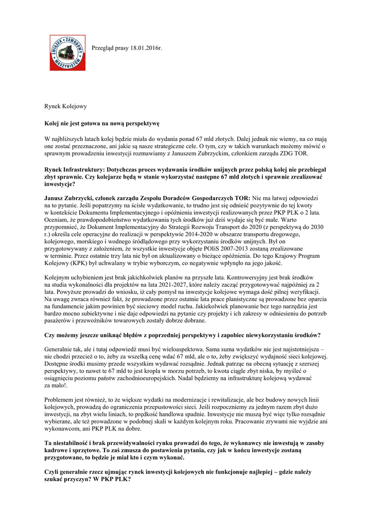 Przegląd prasy 18.01.2016r. Rynek Kolejowy Kolej nie jest gotowa na nową perspektywę W najbliższych latach kolej będzie miała do wydania ponad 67 mld złotych. Dalej jednak nie wiemy, na co mają one zostać przeznaczone, ani jakie są nasze strategiczne cele. O tym, czy w takich warunkach możemy mówić o sprawnym prowadzeniu inwestycji rozmawiamy z Januszem Zubrzyckim, członkiem zarządu ZDG TOR. Rynek Infrastruktury: Dotychczas proces wydawania środków unijnych przez polską kolej nie przebiegał zbyt sprawnie. Czy kolejarze będą w stanie wykorzystać następne 67 mld złotych i sprawnie zrealizować inwestycje? Janusz Zubrzycki, członek zarządu Zespołu Doradców Gospodarczych TOR: Nie ma łatwej odpowiedzi na to pytanie. Jeśli popatrzymy na ścisłe wydatkowanie, to trudno jest się odnieść pozytywnie do tej kwoty w kontekście Dokumentu Implementacyjnego i opóźnienia inwestycji realizowanych przez PKP PLK o 2 lata. Oceniam, że prawdopodobieństwo wydatkowania tych środków już dziś wydaje się być małe. Warto przypomnieć, że Dokument Implementacyjny do Strategii Rozwoju Transport do 2020 (z perspektywą do 2030 r.) określa cele operacyjne do realizacji w perspektywie 2014-2020 w obszarze transportu drogowego, kolejowego, morskiego i wodnego śródlądowego przy wykorzystaniu środków unijnych. Był on przygotowywany z założeniem, że wszystkie inwestycje objęte POIiS 2007-2013 zostaną zrealizowane w terminie. Przez ostatnie trzy lata nie był on aktualizowany o bieżące opóźnienia. Do tego Krajowy Program Kolejowy (KPK) był uchwalany w trybie wyborczym, co negatywnie wpłynęło na jego jakość. Kolejnym uchybieniem jest brak jakichkolwiek planów na przyszłe lata. Kontrowersyjny jest brak środków na studia wykonalności dla projektów na lata 2021-2027, które należy zacząć przygotowywać najpóźniej za 2 lata. Powyższe prowadzi do wniosku, iż cały pomysł na inwestycje kolejowe wymaga dość pilnej weryfikacji. Na uwagę zwraca również fakt, że prowadzone przez ostatnie lata prace planistyczne są prowadzone bez oparcia na fundamencie jakim powinien być sieciowy model ruchu. Jakiekolwiek planowanie bez tego narzędzia jest bardzo mocno subiektywne i nie daje odpowiedzi na pytanie czy projekty i ich zakresy w odniesieniu do potrzeb pasażerów i przewoźników towarowych zostały dobrze dobrane. Czy możemy jeszcze uniknąć błędów z poprzedniej perspektywy i zapobiec niewykorzystaniu środków? Generalnie tak, ale i tutaj odpowiedź musi być wieloaspektowa. Sama suma wydatków nie jest najistotniejsza – nie chodzi przecież o to, żeby za wszelką cenę wdać 67 mld, ale o to, żeby zwiększyć wydajność sieci kolejowej. Dostępne środki musimy przede wszystkim wydawać rozsądnie. Jednak patrząc na obecną sytuację z szerszej perspektywy, to nawet te 67 mld to jest kropla w morzu potrzeb, to kwota ciągle zbyt niska, by myśleć o osiągnięciu poziomu państw zachodnioeuropejskich. Nadal będziemy na infrastrukturę kolejową wydawać za mało!. Problemem jest również, to że większe wydatki na modernizacje i rewitalizacje, ale bez budowy nowych linii kolejowych, prowadzą do ograniczenia przepustowości sieci. Jeśli rozpoczniemy za jednym razem zbyt dużo inwestycji, na zbyt wielu liniach, to prędkość handlowa spadnie. Inwestycje nie muszą być więc tylko rozsądnie wybierane, ale też prowadzone w podobnej skali w każdym kolejnym roku. Pracowanie zrywami nie wyjdzie ani wykonawcom, ani PKP PLK na dobre. Ta niestabilność i brak przewidywalności rynku prowadzi do tego, że wykonawcy nie inwestują w zasoby kadrowe i sprzętowe. To zaś zmusza do postawienia pytania, czy jak w końcu inwestycje zostaną przygotowane, to będzie je miał kto i czym wykonać. Czyli generalnie rzecz ujmując rynek inwestycji kolejowych nie funkcjonuje najlepiej – gdzie należy szukać przyczyn? W PKP PLK? Nie. PKP PLK jest tylko podmiotem zajmującym się realizacją polityki transportowej państwa, którą prowadzi rząd. I problemy, o których wspominam muszą być rozwiązane na szczeblu rządu i odpowiadającego za transport ministerstwa. Przede wszystkim potrzebny jest plan na okres 30-40 lat, pokazujący co my tak właściwie chcemy z naszą koleją zrobić. Powinien być on zintegrowany i obejmujący taki sam horyzont czasowy planem dla sieci drogowej. System transportowy to jedność i jego poszczególne gałęzie nie mogą być rozpatrywane jako konkurencja, ale jako uzupełniające się podsystemy. Planowanie twardej infrastruktury na mniej niż 30 lat jest pozbawione ekonomicznego sensu. Dlatego najbardziej rozwinięte gospodarki świata nauczyły się planować działania w tym zakresie nawet na 50 lat do przodu. Polska takiego dokumentu nie ma i powinien on powstać. Obecnie obowiązujący Master Plan do 2030 r. oraz dokument implementacyjny, o który jest oparty KPK, są już nieaktualne i wymagają napisania praktycznie od nowa. Czyli bez nowej polityki transportowej i aktualizacji dokumentu implementacyjnego i KPK wykorzystanie środków będzie niemożliwe? I tak i nie. Na pewno będziemy zmuszeni realizować coś, co nie wiemy czy ma sens, czy robimy to w odpowiednim zakresie i jaki cel chcemy osiągnąć. Nie mamy dzisiaj postawionych długoterminowych celów dla infrastruktury. Tak więc fundamentem na wczoraj jest nowy dokument implementacyjny i praktycznie równoległy plan na kolejne lata minimum do 2050 roku. Taki dokument musi opierać się o prognozy ekonometryczne odwzorowane w modelach ruchu, a poszczególne warianty inwestycji dla całego kraju podawać planowane źródło finansowania poza środkami europejskimi. I tutaj przechodzimy do finansów i poszukiwania alternatywnych wobec środków europejskich źródeł, do czego dotąd na poważnie nikt nie podszedł (np. wybuduj i utrzymaj). http://www.rynek-kolejowy.pl/61122/kolej_nie_jest_gotowa_na_nowa_perspektywe.htm onet.pl PKP PLK: moderniz
