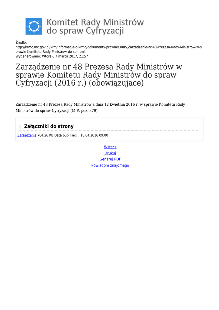 Źródło: http://krmc.mc.gov.pl/krm/informacje-o-krmc/dokumenty-prawne/3085,Zarzadzenie-nr-48-Prezesa-Rady-Ministrow-w-s prawie-Komitetu-Rady-Ministrow-do-sp.html Wygenerowano: Wtorek, 7 marca 2017, 21:57 Zarządzenie nr 48 Prezesa Rady Ministrów w sprawie Komitetu Rady Ministrów do spraw Cyfryzacji (2016 r.) (obowiązujace) Zarządzenie nr 48 Prezesa Rady Ministrów z dnia 12 kwietnia 2016 r. w sprawie Komitetu Rady Ministrów do spraw Cyfryzacji (M.P. poz. 379). Załączniki do strony Zarządzenie 764.26 KB Data publikacji : 18.04.2016 09:00 Wstecz Drukuj Generuj PDF Powiadom znajomego