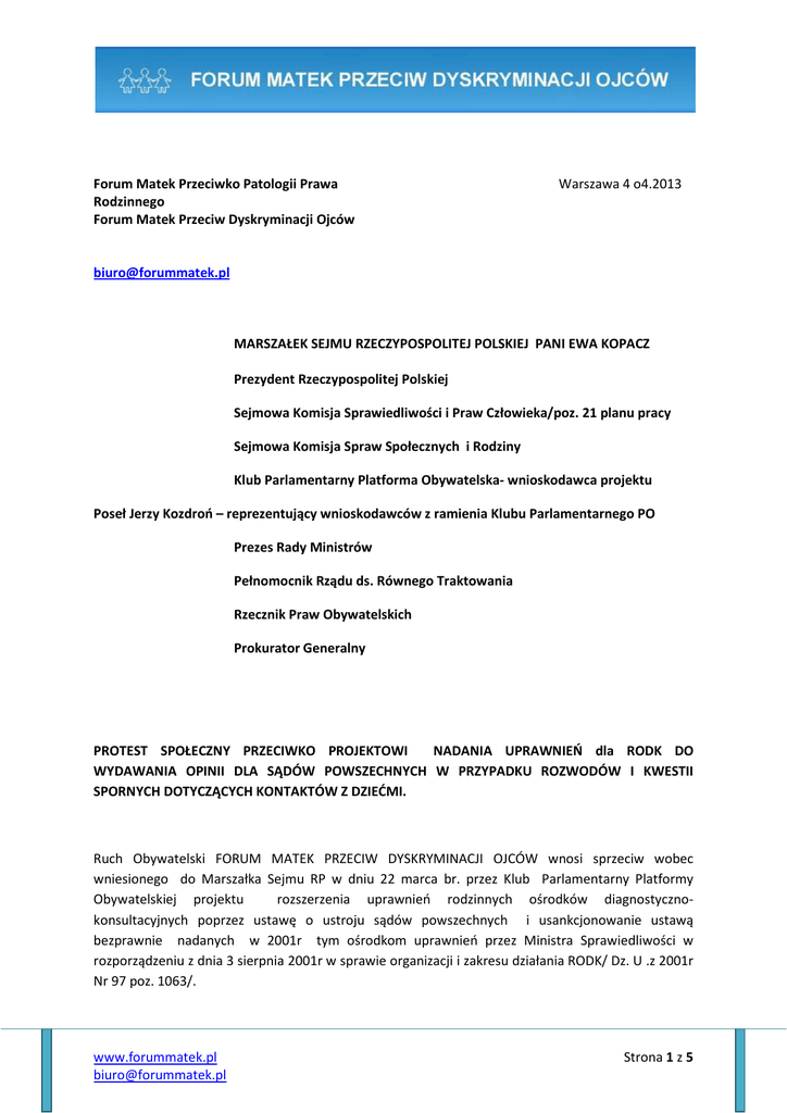 Forum Matek Przeciwko Patologii Prawa Rodzinnego Forum Matek Przeciw Dyskryminacji Ojców Warszawa 4 o4.2013 [email protected] MARSZAŁEK SEJMU RZECZYPOSPOLITEJ POLSKIEJ PANI EWA KOPACZ Prezydent Rzeczypospolitej Polskiej Sejmowa Komisja Sprawiedliwości i Praw Człowieka/poz. 21 planu pracy Sejmowa Komisja Spraw Społecznych i Rodziny Klub Parlamentarny Platforma Obywatelska- wnioskodawca projektu Poseł Jerzy Kozdroń – reprezentujący wnioskodawców z ramienia Klubu Parlamentarnego PO Prezes Rady Ministrów Pełnomocnik Rządu ds. Równego Traktowania Rzecznik Praw Obywatelskich Prokurator Generalny PROTEST SPOŁECZNY PRZECIWKO PROJEKTOWI NADANIA UPRAWNIEŃ dla RODK DO WYDAWANIA OPINII DLA SĄDÓW POWSZECHNYCH W PRZYPADKU ROZWODÓW I KWESTII SPORNYCH DOTYCZĄCYCH KONTAKTÓW Z DZIEĆMI. Ruch Obywatelski FORUM MATEK PRZECIW DYSKRYMINACJI OJCÓW wnosi sprzeciw wobec wniesionego do Marszałka Sejmu RP w dniu 22 marca br. przez Klub Parlamentarny Platformy Obywatelskiej projektu rozszerzenia uprawnień rodzinnych ośrodków diagnostycznokonsultacyjnych poprzez ustawę o ustroju sądów powszechnych i usankcjonowanie ustawą bezprawnie nadanych w 2001r tym ośrodkom uprawnień przez Ministra Sprawiedliwości w rozporządzeniu z dnia 3 sierpnia 2001r w sprawie organizacji i zakresu działania RODK/ Dz. U .z 2001r Nr 97 poz. 1063/. www.forummatek.pl [email protected] Strona 1 z 5 Sprzeciw jest tym bardziej uzasadniony, że Rząd ustami Pełnomocnik Rządu ds. Równego Traktowania Pani Agnieszki Kozłowskiej -Rajewicz zapowiada walkę o równouprawnienie obojga rodziców w kwestii opieki nad dziećmi i zapowiada zmiany w prawie rodzinnym a ręką Klubu Parlamentarnego PO przedkłada do Laski Marszałkowskiej legitymizację tej instytucji, która ma niechlubny udział w rozbijaniu rodzin, w dyskryminowaniu ojców, izolacji dzieci od rodzin ojców z zastosowaniem metod , których w diagnozie nie wolno stosować. Do wydawania opinii jeśli ma to szczególne - podkreślamy szczególne i wyjątkowe uzasadnienie a nie każdorazowo jak to ma miejsce obecnie -powinni być powoływani przez sądy jedynie biegli z listy sądowej . Osoby sporządzające opinie w RODK nie są biegłymi w rozumieniu przepisów kodeksu cywilnego. Nie da się w kraju naprawić prawa rodzinnego i poprawić praktyki stosowania tego prawa przy dalszym przyzwoleniu do wydawania opinii w sprawach rodzin i dzieci RODK –om . Społeczeństwo doświadczyło wielu krzywd ze strony tych ośrodków , które w miejsce pomocy dokonują niszczenia rodzin i dzieci , dokonują segregacji obywateli według przyjętego przez siebie klucza ocen człowieka , zwanego standardami opiniowania , za pomocą których niszczy się ludzi, zrywa wielopokoleniowe więzi rodzinne . Ośrodki te stanowią systemowe narzędzie zaprzeczające zasadzie demokratycznego państwa prawnego którym Polska się nazywa . Jednemu z ojców który zarzucił brak dokumentacji w RODK Ministerstwo Sprawiedliwości w piśmie DS.-I-051-129/12/3 z 7 września 2012r odpowiedziało tak: „Czynności spostrzegania i czynności myślowe(analiza i synteza danych ,porównywanie, klasyfikowanie i wnioskowanie) są realizowane przez zespół badający w wewnętrznym myślowym procesie przetwarzania danych i nie podlegają zaprotokołowaniu.” Ojcom odmawiają sądy porównania opinii z protokołem z badania –bo ich po prostu nie ma./Sąd Okręgowy Warszawa VI Wydział Cywilny Rodzinny/.To jest bezprawie. Społeczeństwo domaga się stosowania prawa przez instytucje państwowe a nie podpierania się przez sądy osobistymi poglądami osób o kwalifikacjach przez nikogo nie weryfikowanych merytorycznie , pozostających nadto w konflikcie interesów w sytuacji narzuconych im przez resort sprawiedliwości któremu podlegają -standardów - co stoi w kolizji z Ustawą o Zawodzie Psychologa i Kodeksem Etyczno Zawodowym psychologa . Zła nierzetelna opinia , to tragedia dla rodziny . Takich opinii są tysiące . Niewinni ludzie są zamykani do więzień na skutek błędnych i nierzetelnych opinii tych ośrodków . Wzrasta wskaźnik samobójstw . Dzieci tracą rodzica. Rodziny są konfliktowane . Rodzinom odbiera się dzieci . Wszystko to przypomina niechlubne praktyki stosowane przez państwa totalitarne . Za takie działania RODK- które rodzą tragedie rodzin nikt , kto skrzywdził człowieka w obecnym systemie prawnym nie ponosi odpowiedzialności. Praktyka ugruntowana bezpodstawnie przez wymienione rozporządzenie doprowadziła do tego ,że RODK zatraciły swoje merytoryczne umocowanie do wydawania opinii o nieletnich skonfliktowanych z prawem. Ich działania poszły jednak w innym kierunku - w kierunku rodzin . W ostatnich latach nakierowały one swoją działalność na bezprawne opiniowanie spraw rodzinnych w proporcji 2:1. W roku 2011 wg sprawozdania Ministerstwa Sprawiedliwości opinii takich wydano 19.493 a w sprawach nieletnich 10.451. Za opinie w sprawach rodzinnych , kontaktów z dziećmi , www.forummatek.pl [email protected] Strona 2 z 5 władzy rodzicielskiej, opieki naprzemiennej płacą rodzice. Rachunki te wynoszą od 500 do 2500 zł w zależności od sprawy. Ośrodki te zatem żyją z krzywdy rodziców , głównie ojców , którzy zwracają się do sądów o pomoc , o opiekę nad dzieckiem a w miejsce pomocy zostają krzywdzeni .Pomimo że RODK mają dostęp do akt , dowodów nie rozpoznają , bo jak przyznają sami nie muszą czytać , pozwalają sobie dokonywać ocen człowieka wg własnego uznania. .Uzurpują sobie posiadanie wiedzy zaczerpniętej z badania podświadomości badanego ,jego intencji czy intuicji , co stanowi zaprzeczenie nauki . To uzurpatorzy wiedzy tajemnej , kapłani dzisiejszych czasów wyjęci spod jakiejkolwiek oceny i weryfikacji . Sądy przerzucają na RODK orzeczenia bo ich opinie traktują jako twarde dowody , wpisując treść wniosków z opinii do postanowień i wyroków sądowych . Tak działający system rozmydla odpowiedzialność , 