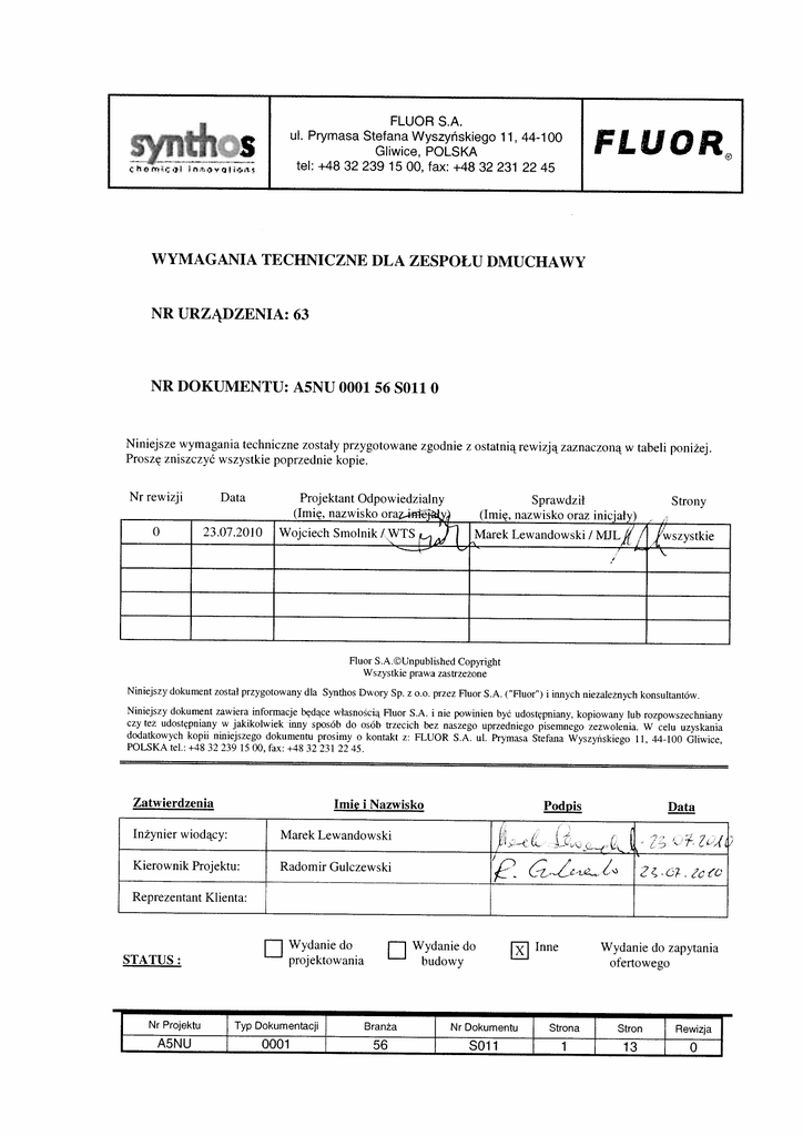 FLUOR S.A. ul. Prymasa Stefana Wyszyńskiego 11, 44-100 Gliwice, POLSKA tel: +48 32 239 15 00, fax: +48 32 231 22 45 ® Spis Treści 1. WSTĘP ................................................................................................................................................................ 3 2. DYREKTYWY, KODY I SPECYFIKACJE MAJĄCE ZASTOSOWANIE ................................................ 3 2.1. Definicje stron zaangaŜowanych ............................................................................................................... 3 2.2. Wymagania ogólne .................................................................................................................................... 3 2.3. Wymagania prawne ................................................................................................................................... 3 2.4. Normy, Standardy i Specyfikacje .............................................................................................................. 3 2.5. Hierarchia waŜności dokumentów............................................................................................................. 4 2.6. Odstępstwa................................................................................................................................................. 4 3. ZAKRES DOSTAWY......................................................................................................................................... 4 3.1. Odpowiedzialność “OFERENTA” ............................................................................................................ 4 3.2. Zakres rzeczowy dostawy.......................................................................................................................... 4 3.3. Zakres usług............................................................................................................................................... 5 3.4. Części zamienne ........................................................................................................................................ 6 3.5. Wykluczenia .............................................................................................................................................. 6 4. WYMAGANIA PROJEKTOWE I WYKONAWCZE.................................................................................... 6 4.1. Opis procesu .............................................................................................................................................. 6 4.2. Ogólne wymagania projektowe ................................................................................................................. 6 4.3. Dane klimatyczne i obiektu ....................................................................................................................... 7 4.4. Dane zasilania elektrycznego..................................................................................................................... 7 4.5. Wymagania materiałowe ........................................................................................................................... 7 4.6. Wymagania mechaniczne .......................................................................................................................... 7 4.7. Wymagania procesowe .............................................................................................................................. 7 4.8. Wymagania odnośnie emisji akustycznej .................................................................................................. 8 4.9. Wymagania elektryczne i kontrolno-pomiarowe ....................................................................................... 8 4.10. Wymagania dla orurowania ....................................................................................................................... 8 4.11. Wymagania odnośnie malowania .............................................................................................................. 8 4.12. Tabliczka znamionowa i oznakowanie ...................................................................................................... 8 5. KONTROLA JAKOŚCI, INSPEKCJE I TESTY............................................................................................ 9 5.1. Inspekcje.................................................................................................................................................... 9 5.2. Testy .......................................................................................................................................................... 9 6. GWARANCJE .................................................................................................................................................... 9 7. WYMAGANIA ODNOŚNIE DOKUMENTACJI ........................................................................................... 9 7.1. Dokumentacja ofertowa............................................................................................................................. 9 7.2. Dokumentacja wymagana po podpisaniu zamówienia ............................................................................ 10 7.3. Zobowiązanie dostarczenia dokumentacji ............................................................................................... 10 8. LISTA ZAŁĄCZNIKÓW ................................................................................................................................ 13 Nr Projektu Typ Dokumentacji BranŜa Nr Dokumentu Strona Stron Rewizja A5NU 0001 56 S011 2 13 0 FLUOR S.A. ul. Prymasa Stefana Wyszyńskiego 11, 44-100 Gliwice, POLSKA tel: +48 32 239 15 00, fax: +48 32 231 22 45 1. ® WSTĘP Niniejsze wymagania techniczne zawierają minimalne wymagania odnośnie projektu, wykonania, inspekcji, testów, przygotowania do transportu i dostawy zespołu dmuchawy, jak opisano poniŜej oraz w doł