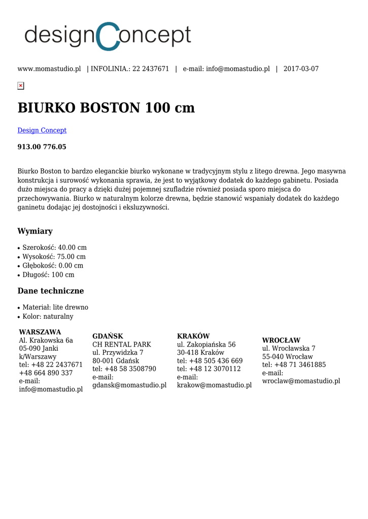 www.momastudio.pl | INFOLINIA.: 22 2437671 | e-mail: [email protected] | 2017-03-07 BIURKO BOSTON 100 cm Design Concept 913.00 776.05 Biurko Boston to bardzo eleganckie biurko wykonane w tradycyjnym stylu z litego drewna. Jego masywna konstrukcja i surowość wykonania sprawia, że jest to wyjątkowy dodatek do każdego gabinetu. Posiada dużo miejsca do pracy a dzięki dużej pojemnej szufladzie również posiada sporo miejsca do przechowywania. Biurko w naturalnym kolorze drewna, będzie stanowić wspaniały dodatek do każdego ganinetu dodając jej dostojności i eksluzywności. Wymiary ● ● ● ● Szerokość: 40.00 cm Wysokość: 75.00 cm Głębokość: 0.00 cm Długość: 100 cm Dane techniczne ● ● Materiał: lite drewno Kolor: naturalny WARSZAWA Al. Krakowska 6a 05-090 Janki k/Warszawy tel: +48 22 2437671 +48 664 890 337 e-mail: [email protected] GDAŃSK CH RENTAL PARK ul. Przywidzka 7 80-001 Gdańsk tel: +48 58 3508790 e-mail: [email protected] KRAKÓW ul. Zakopiańska 56 30-418 Kraków tel: +48 505 436 669 tel: +48 12 3070112 e-mail: [email protected] WROCŁAW ul. Wrocławska 7 55-040 Wrocław tel: +48 71 3461885 e-mail: [email protected]