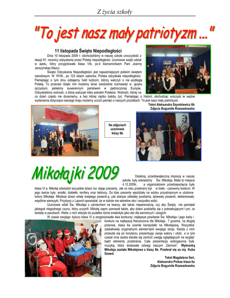 Z życia szkoły 11 listopada Święto Niepodległości Dnia 10 listopada 2009 r. obchodziliśmy w naszej szkole uroczystość z okazji 91. rocznicy odzyskania przez Polskę niepodległości. Uczniowie wzięli udział w apelu, który przygotowała klasa VIb, po d kierownictwem Pani Joanny Jerszyńskiej-Mazur. Święto Odzyskania Niepodległości jest najważniejszym polskim świętem narodowym. W 1918r., po 123 latach zaborów, Polska odzyskała niepodległości. Pamiętając o tym dniu oddajemy hołd ludziom, którzy walczyli o nie -podległą Polskę. To przecież dzięki nim możemy teraz swobodnie rozmawiać w języku ojczystym, jesteśmy suwerennym państwem w zjednoczonej Europie. Odzyskaliśmy wolność, o którą walczyło kilka pokoleń Polaków. Wolność, której na co dzień często nie doceniamy, a bez której ciężko byłoby żyć. Pamiętając o historii, obchodząc uroczyśc ie ważne wydarzenia dotyczące naszego kraju możemy uczcić pamięć o naszych przodkach. To jest nasz mały patriotyzm. Tekst Aleksandra Szymkiewicz 6b Zdjęcia Bogumiła Rozwadowska Na zdjęciach uczniowie klasy 6b Ostatnią, przedświąteczną imprezą w naszej szkole, były odwiedziny Św. Mikołaja. Miało to miejsce 4.12.2009r., a organizatorem przedsięwzięcia była klasa VI a. Mikołaj odwiedził wszystkie dzieci roz -dając prezenty. Jak co roku przebrany był w biało - czerwony kostium. W jego świcie były: aniołki, diabełki, renifery oraz lektorzy. Do klas prezenty wjeżdżały na wózku przystrojonym w ulubione kolory Mikołaja. Młodsze dzieci witały świętego piosenk ą, zaś starsze układały powitania, śpiewały piosenki, deklamowały wspólnie wierszyki. Przybysz z Laponii opowiadał, że w szkole ma sekretne oko i wszystko widzi. Uczniowie witali Św. Mikołaja z uśmiechem na twarzy, ale także niepewnością, czy aby Święty nie pamiętał jakiegoś niegodnego czynu, który uczynili. Mikołaj zapro -ponował także, aby dzieci podzieliły się z potrzebującymi t ym, co dostały w paczkach. Wiele z nich włożyło do pudełka różne smakołyki jako dar dla samotnych i ubogich. W czasie swojego dyżuru klasa VI a zorganizowała dwa konkursy: najlepsze powitanie Św. Mikołaja i jego świty i konkurs na najlepszą Narzeczona dla Mikołaja. 7 grudnia, na długiej przerwie, klasa 6a oceniła kandydatki na Mikołajową. Wszystkie zaskakiwały oryginalnymi elemen tami swojego stroju. Każda z nich przeszła się po korytarzu prezentując swoje walory i ubiór, a w tym czasie inna osoba starała się zwrócić uwagę oglądających na wygląd bądź elementy przebrania. Cała prezentacja wzbogacona była muzyką, która dodawała odwagi naszym „Damom”. Wybranką Mikołaja została Mikołajowa z klasy 6b. Przebrał się za nią Kuba Szwed. Tekst Magdalena Seń, Aleksandra Pinkas klasa 6a Zdjęcia Bogumiła Rozwadowska