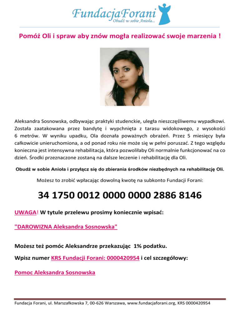 Pomóż Oli i spraw aby znów mogła realizować swoje marzenia ! Aleksandra Sosnowska, odbywając praktyki studenckie, uległa nieszczęśliwemu wypadkowi. Została zaatakowana przez bandytę i wypchnięta z tarasu widokowego, z wysokości 6 metrów. W wyniku upadku, Ola doznała poważnych obrażeń. Przez 5 miesięcy była całkowicie unieruchomiona, a od ponad roku nie może się w pełni poruszać. Z tego względu konieczna jest intensywna rehabilitacja, która pozwoliłaby Oli normalnie funkcjonować na co dzień. Środki przeznaczone zostaną na dalsze leczenie i rehabilitację dla Oli. Obudź w sobie Anioła i przyłącz się do zbierania środków niezbędnych na rehabilitację Oli. Możesz to zrobić wpłacając dowolną kwotę na subkonto Fundacji Forani: 34 1750 0012 0000 0000 2886 8146 UWAGA! W tytule przelewu prosimy koniecznie wpisać: "DAROWIZNA Aleksandra Sosnowska" Możesz też pomóc Aleksandrze przekazując 1% podatku. Wpisz numer KRS Fundacji Forani: 0000420954 i cel szczegółowy: Pomoc Aleksandra Sosnowska Fundacja Forani, ul. Marszałkowska 7, 00-626 Warszawa, www.fundacjaforani.org, KRS 0000420954